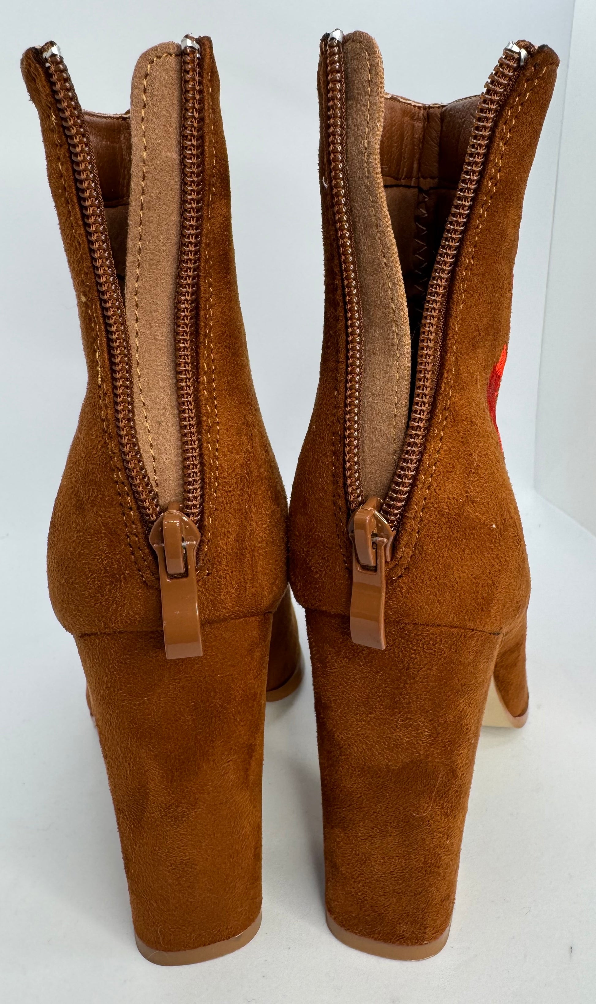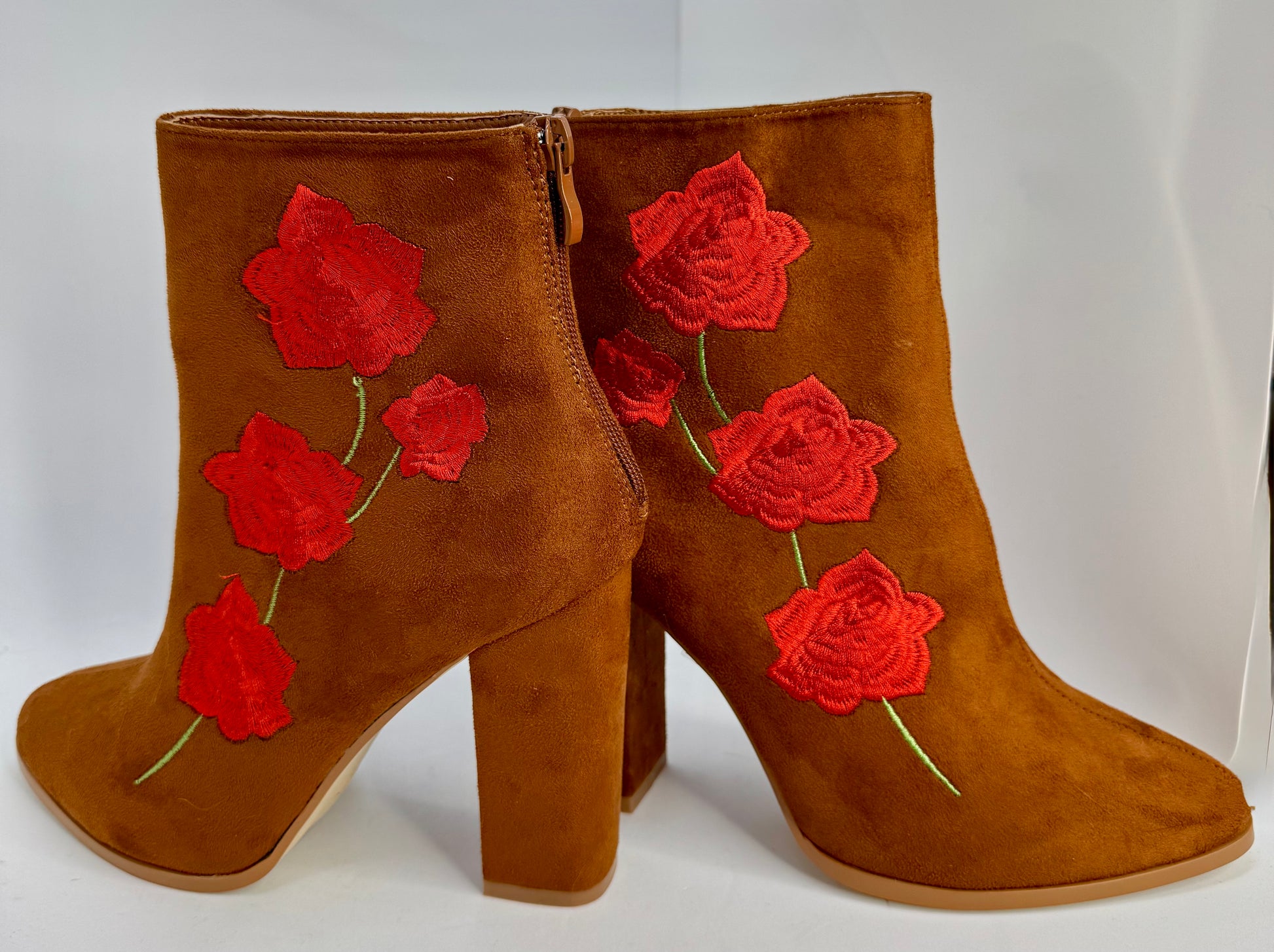 Brown faux suede ankle boots with red rose embroidery detail.