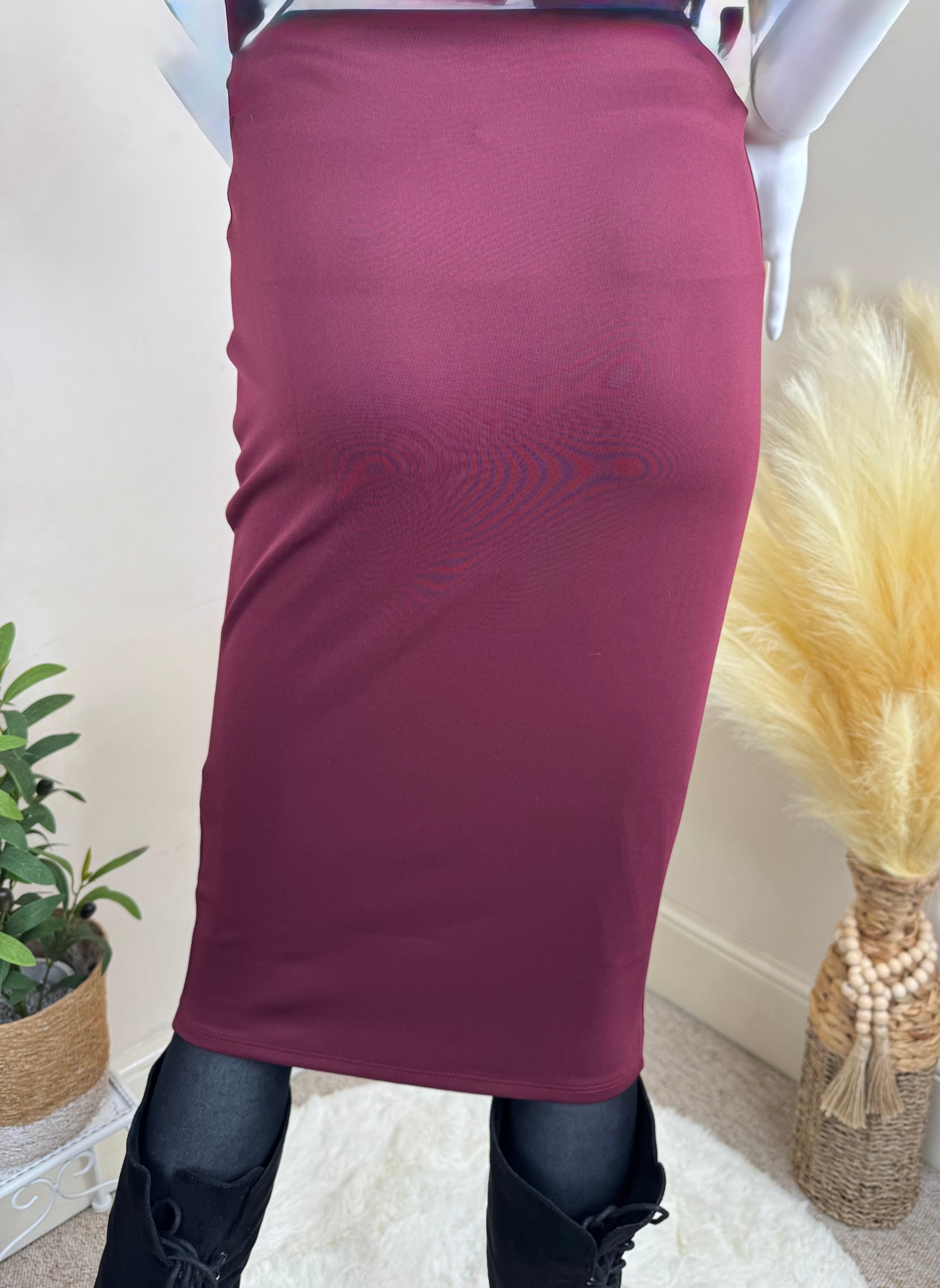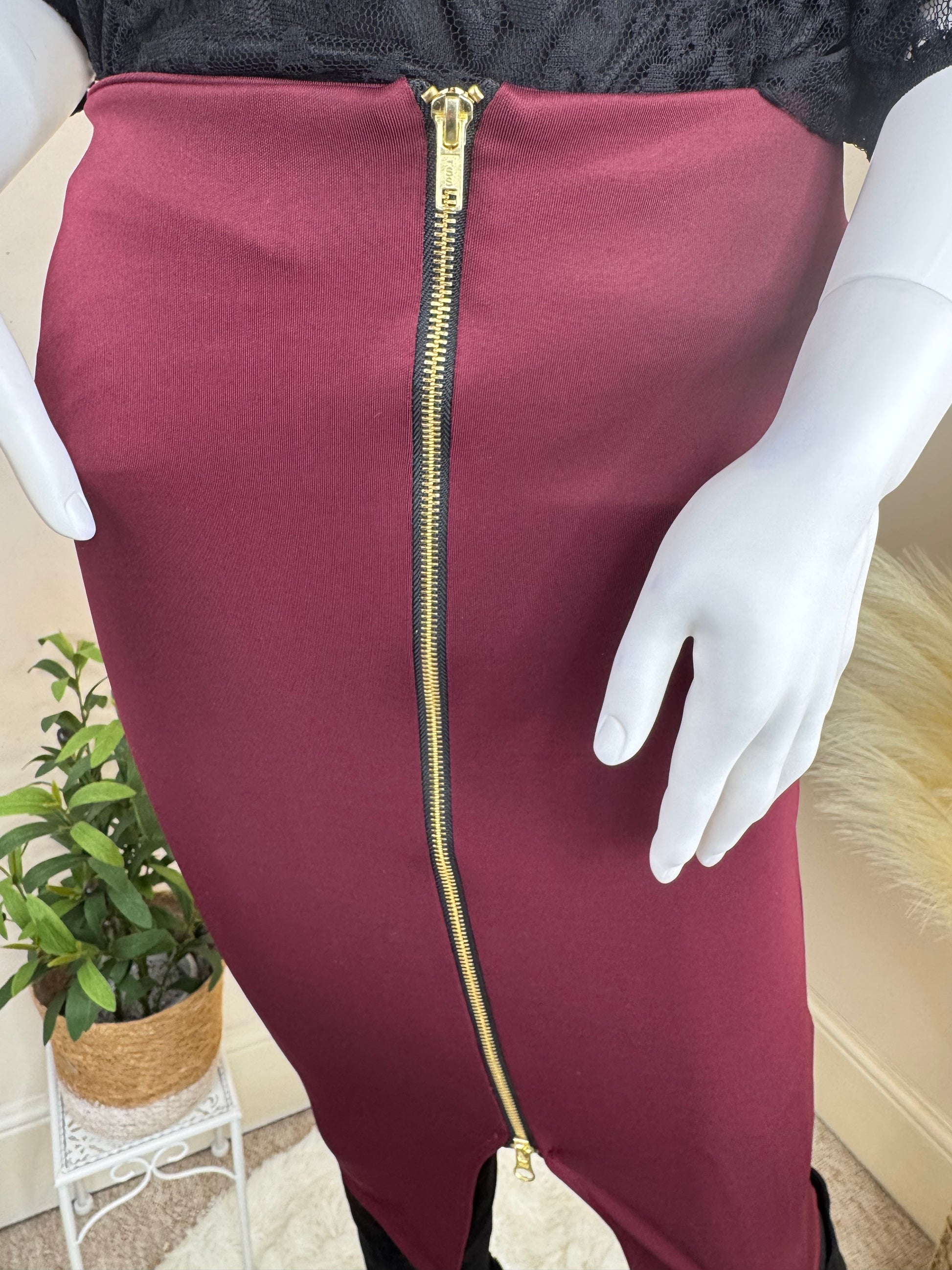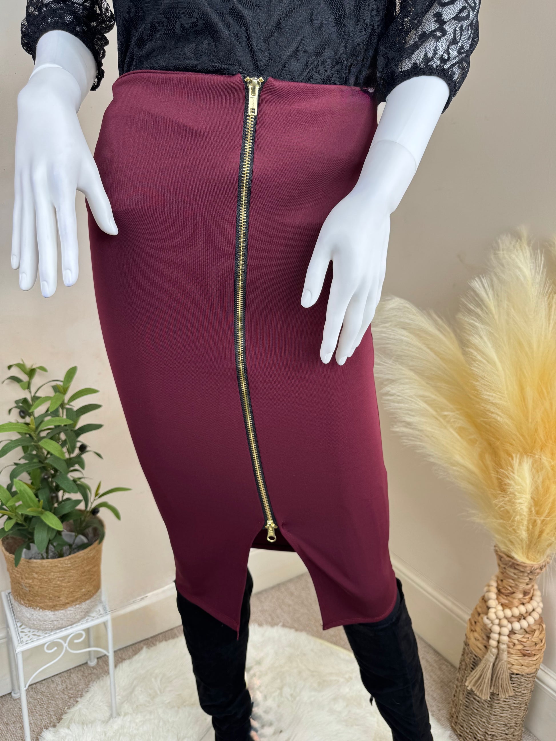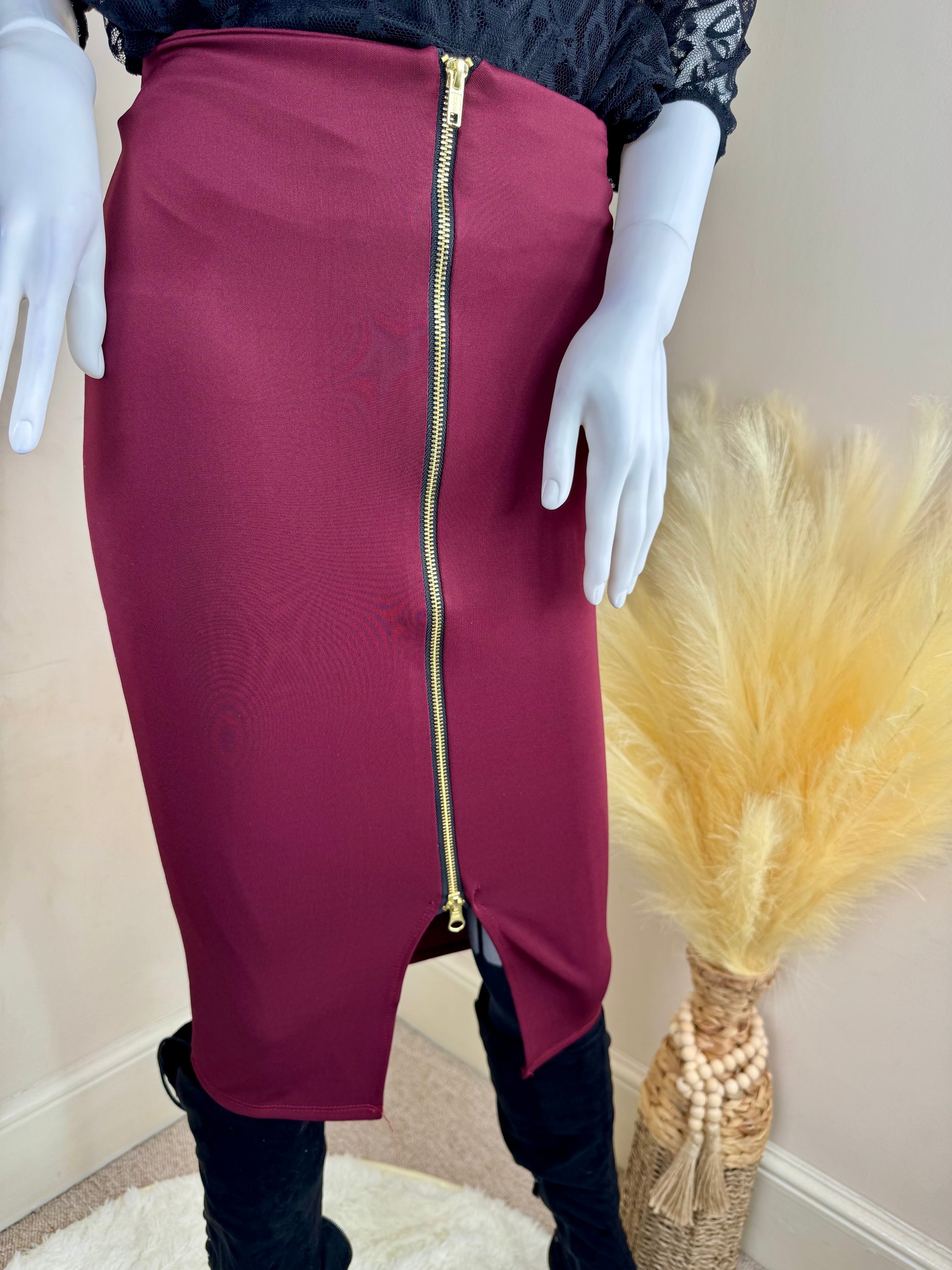 Step into chic autumn style with this boutique pencil skirt in deep burgundy. Featuring a bold exposed gold zip that runs through the front, this piece combines elegance with a modern edge. The fitted silhouette flatters your shape, while the versatile design makes it easy to dress up with heels and a blouse, or style down with boots and a knit.