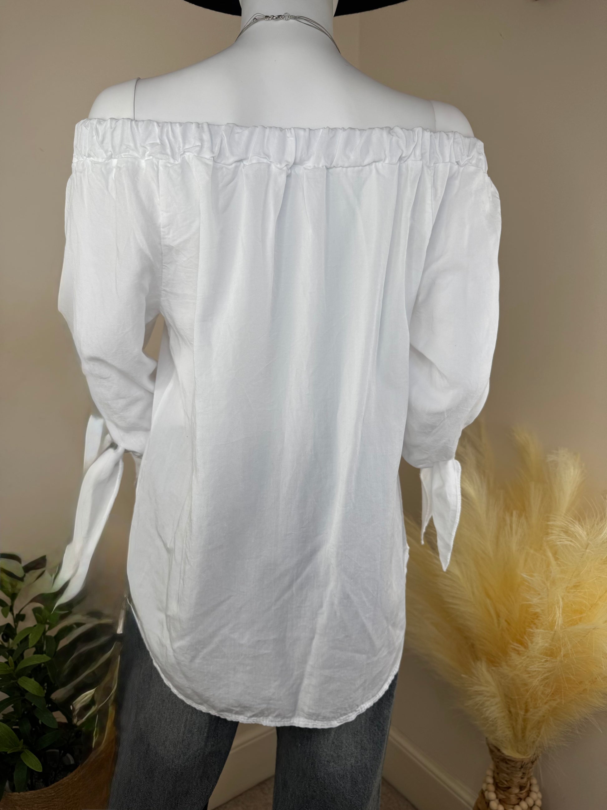 Women’s White Blouse Off Shoulder – Long Sleeve Tie Detail Size (UK 12)