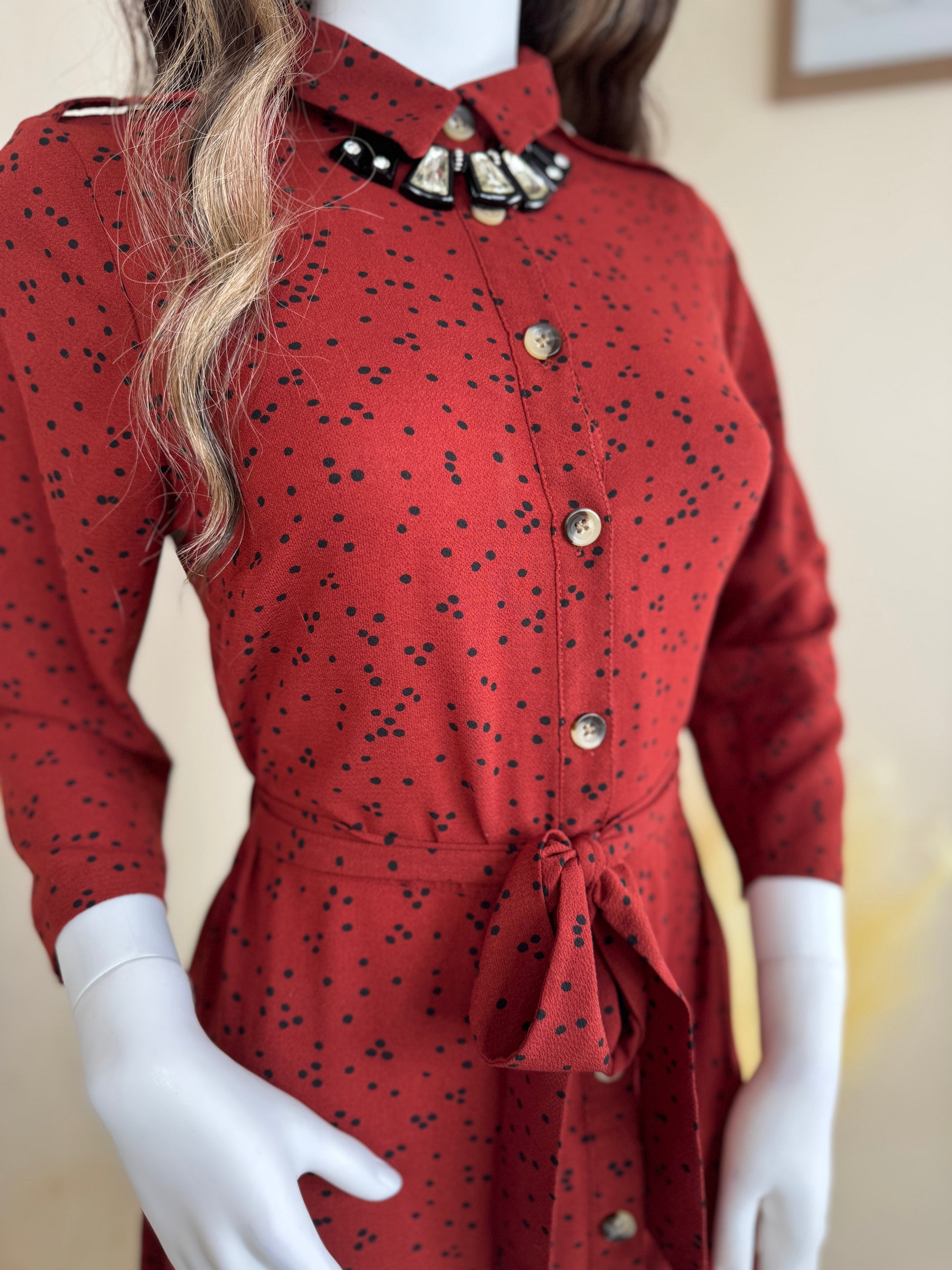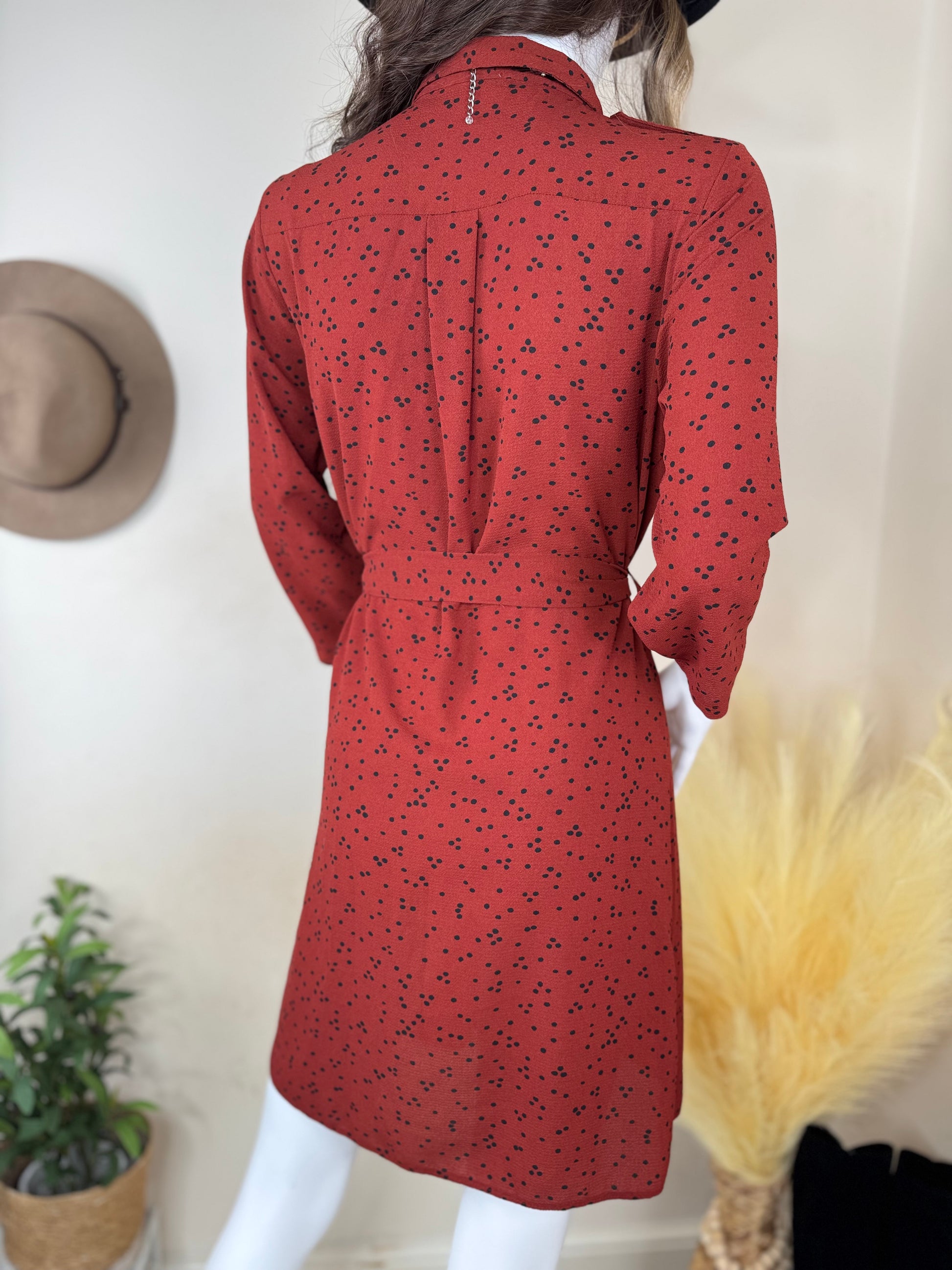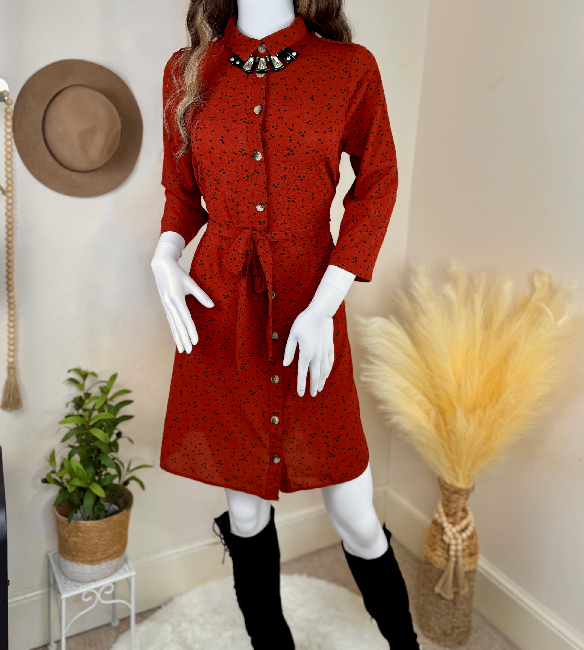 Step into effortless charm with this red polka dot shirt dress. Featuring a button-down front, flattering tie waist, and long sleeves, it’s a versatile piece that moves easily from daytime strolls to evening plans. The collared neckline with statement detail adds a touch of elegance, while the lightweight fabric makes it perfect for layering across seasons.