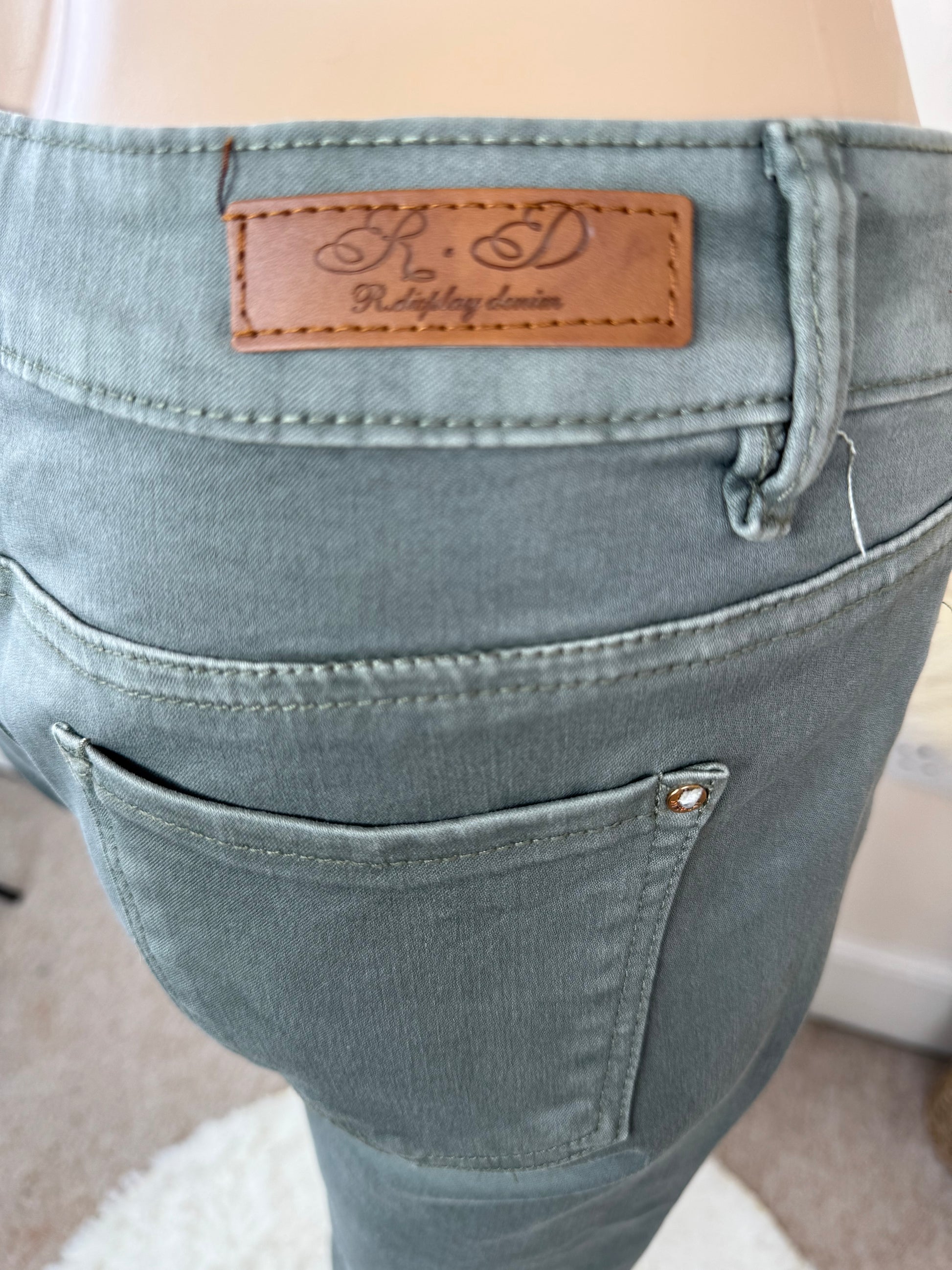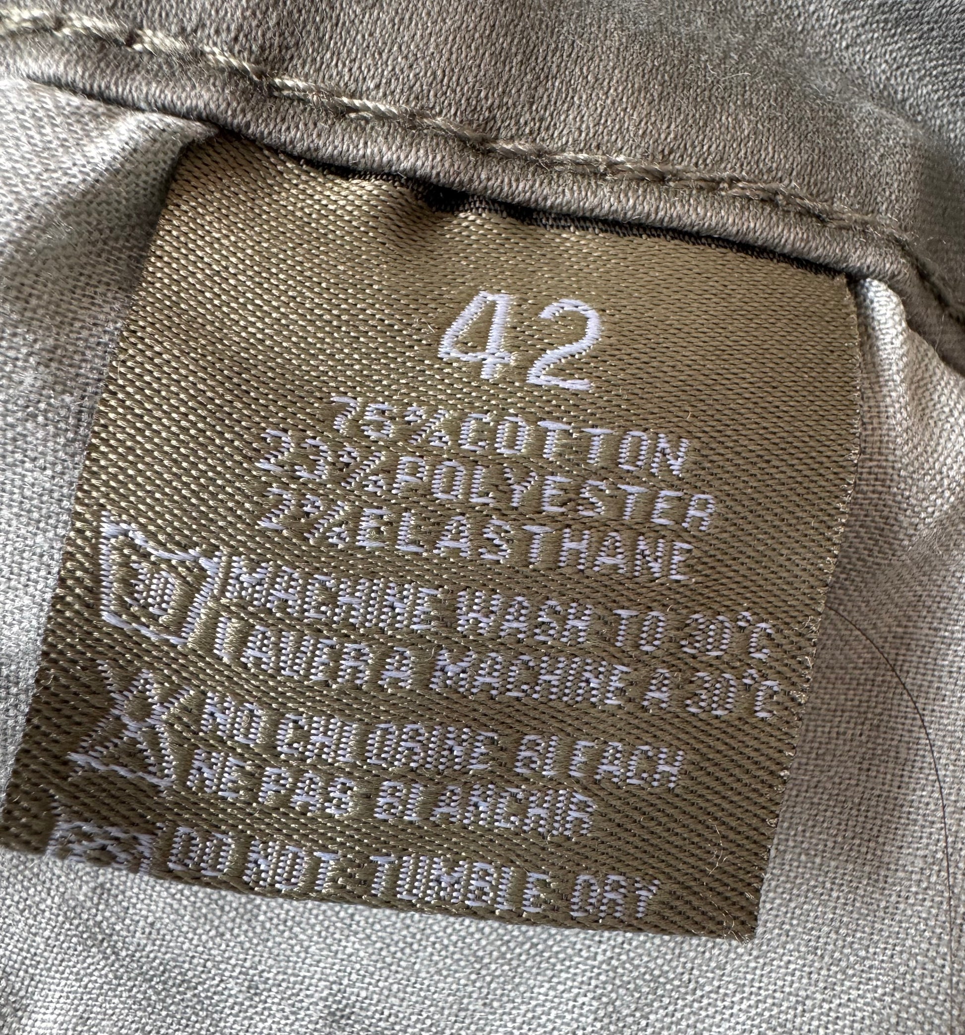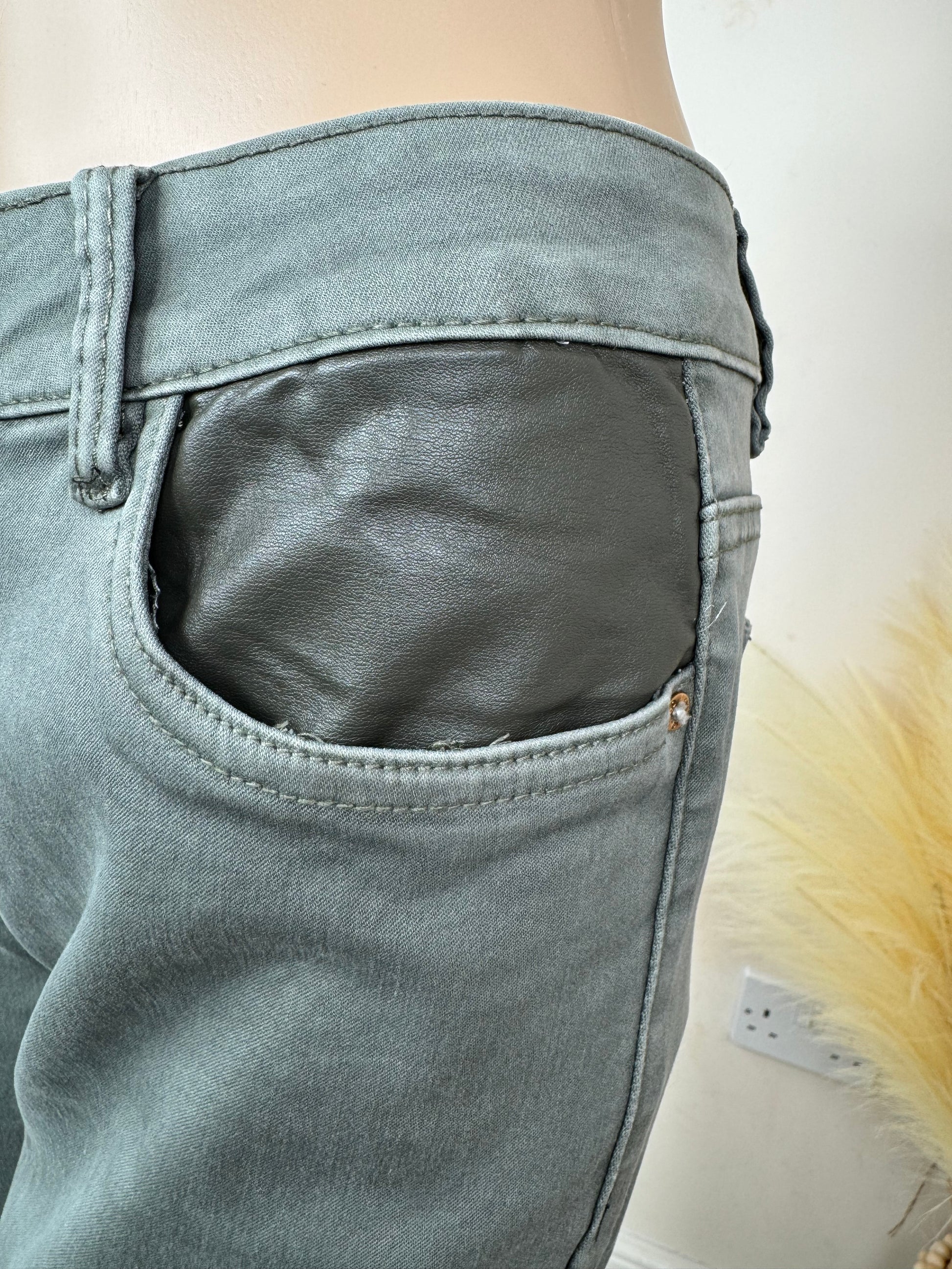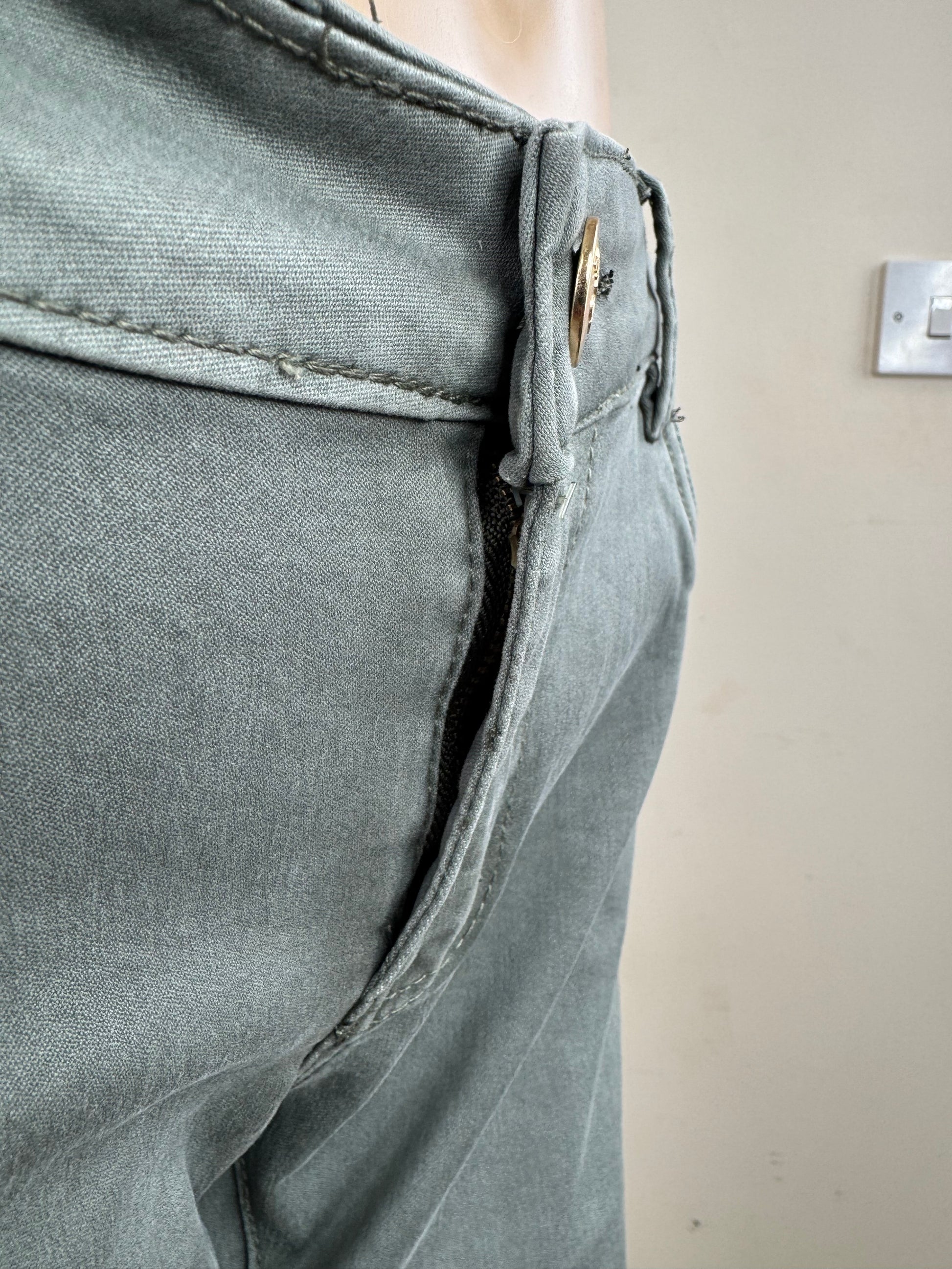 Women’s green straight leg trousers with faux leather quilted knee detail. Size UK 14 (EU 42). Comfortable cotton blend, perfect for casual or smart styling.