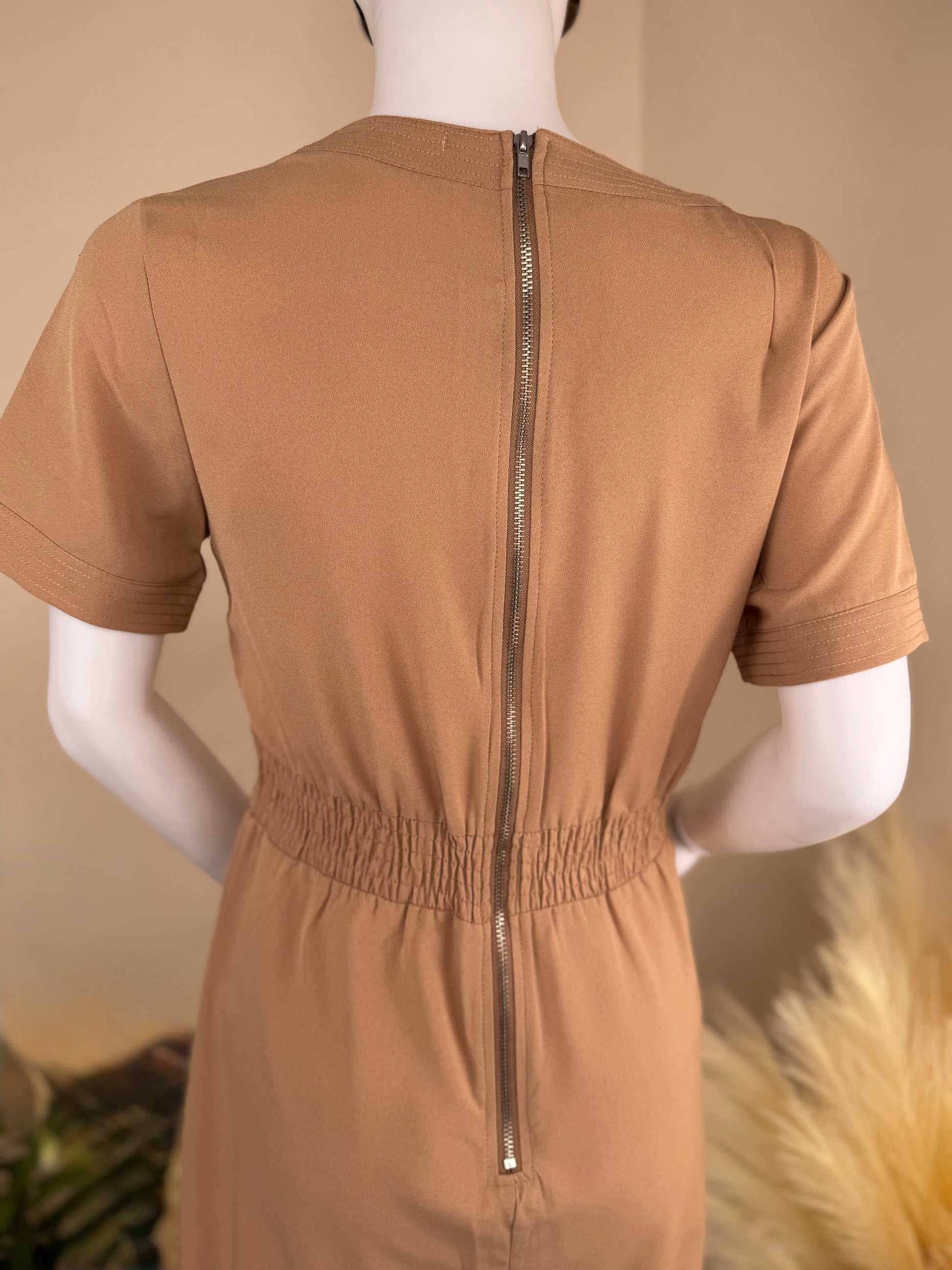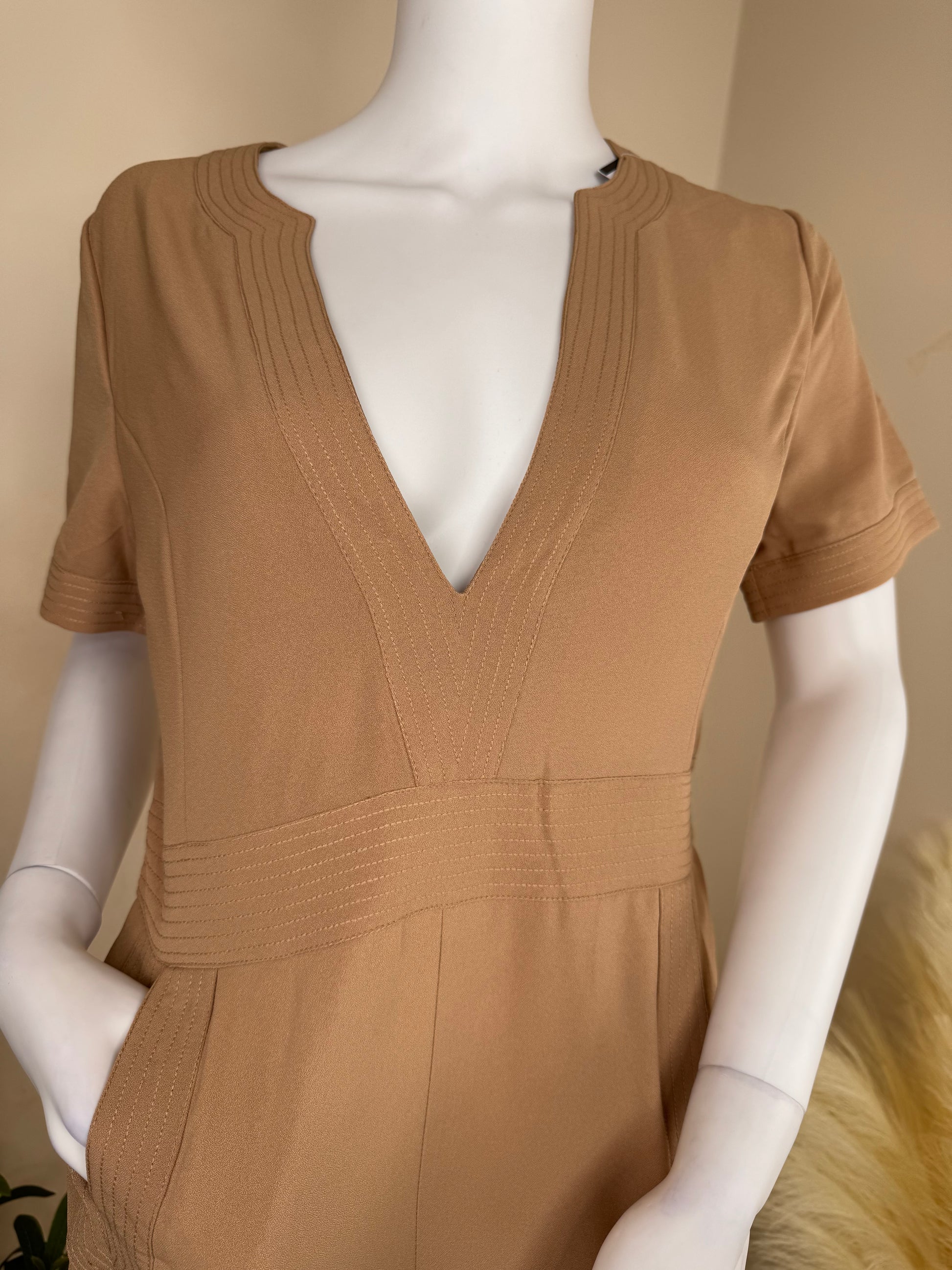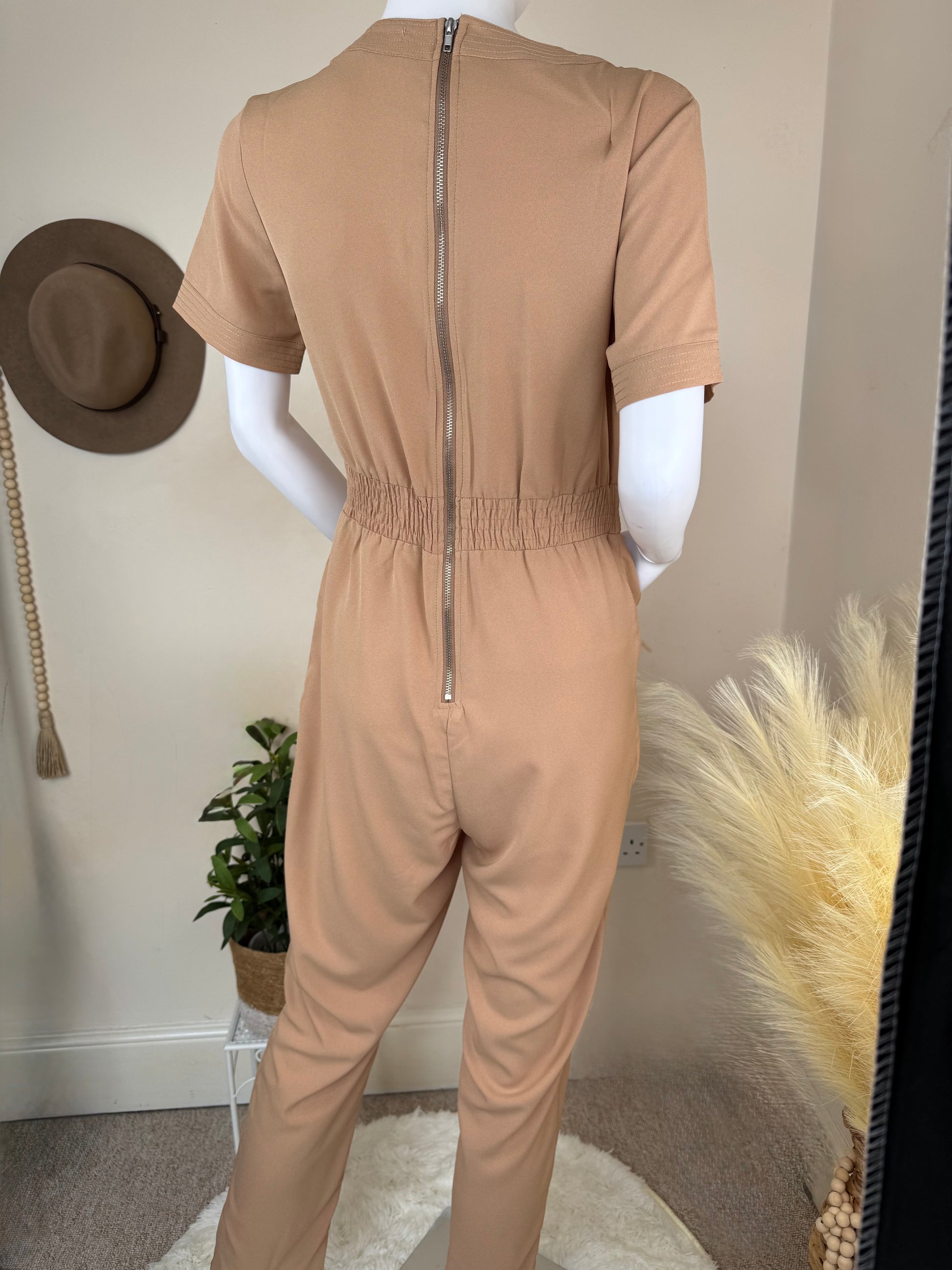 Step into effortless chic with this camel jumpsuit – a versatile piece designed for both casual and elegant occasions. Featuring a flattering deep V-neckline, short sleeves, and tailored seams, this jumpsuit combines comfort with style. Side pockets add a practical touch, while the elasticated waist and back zip ensure a sleek, comfortable fit.