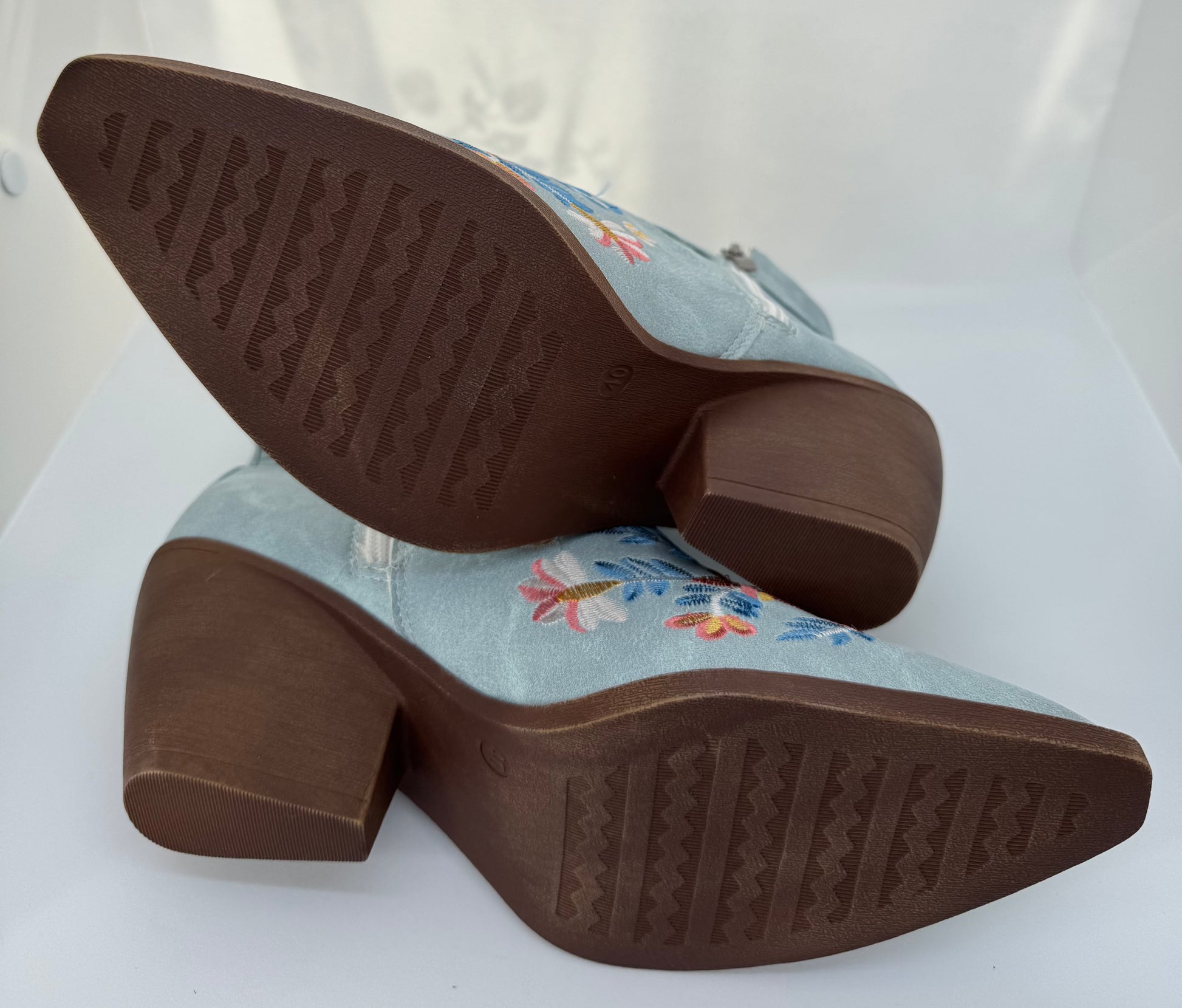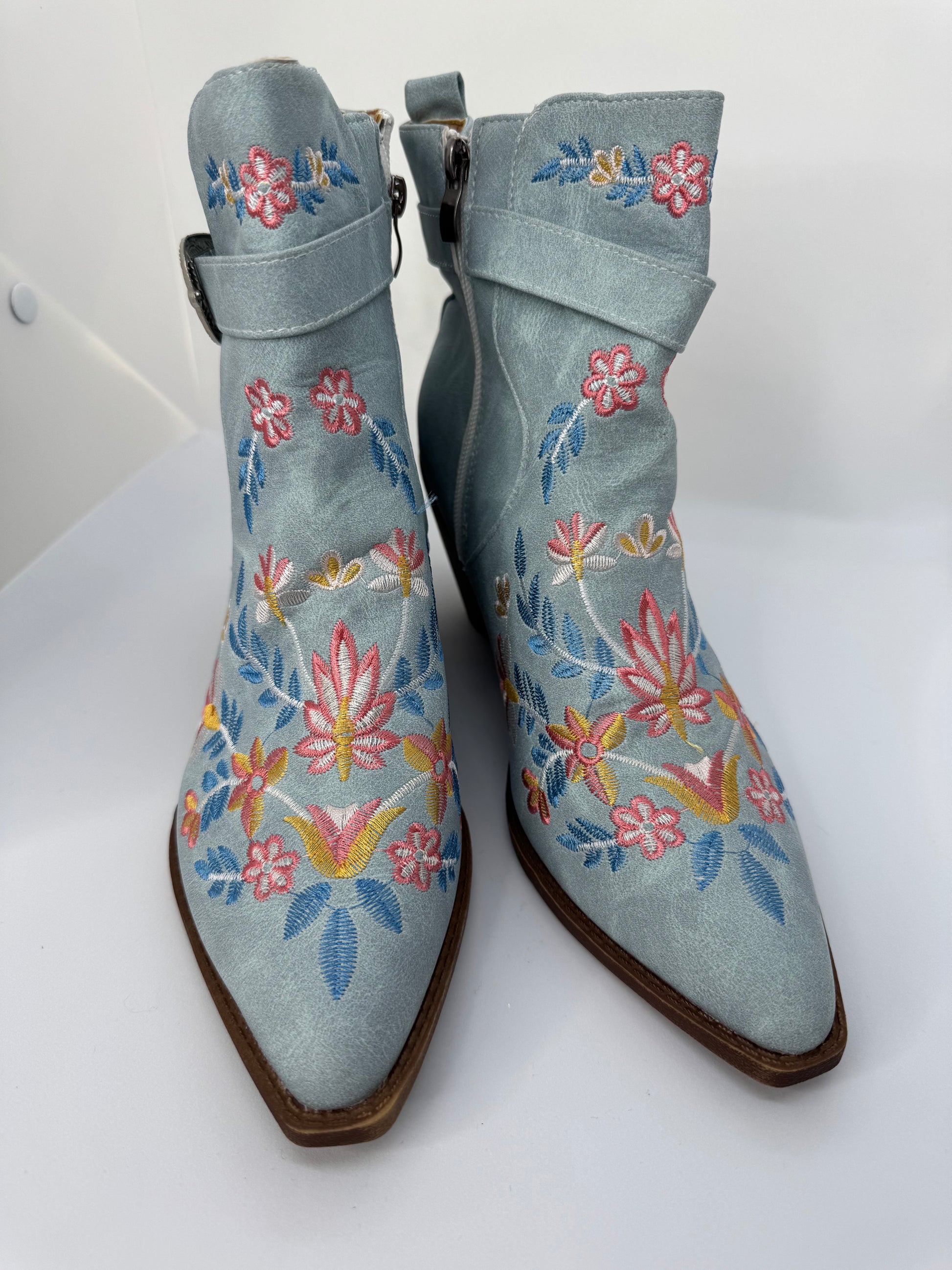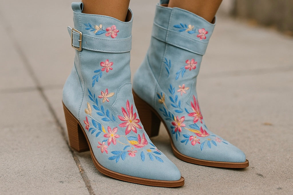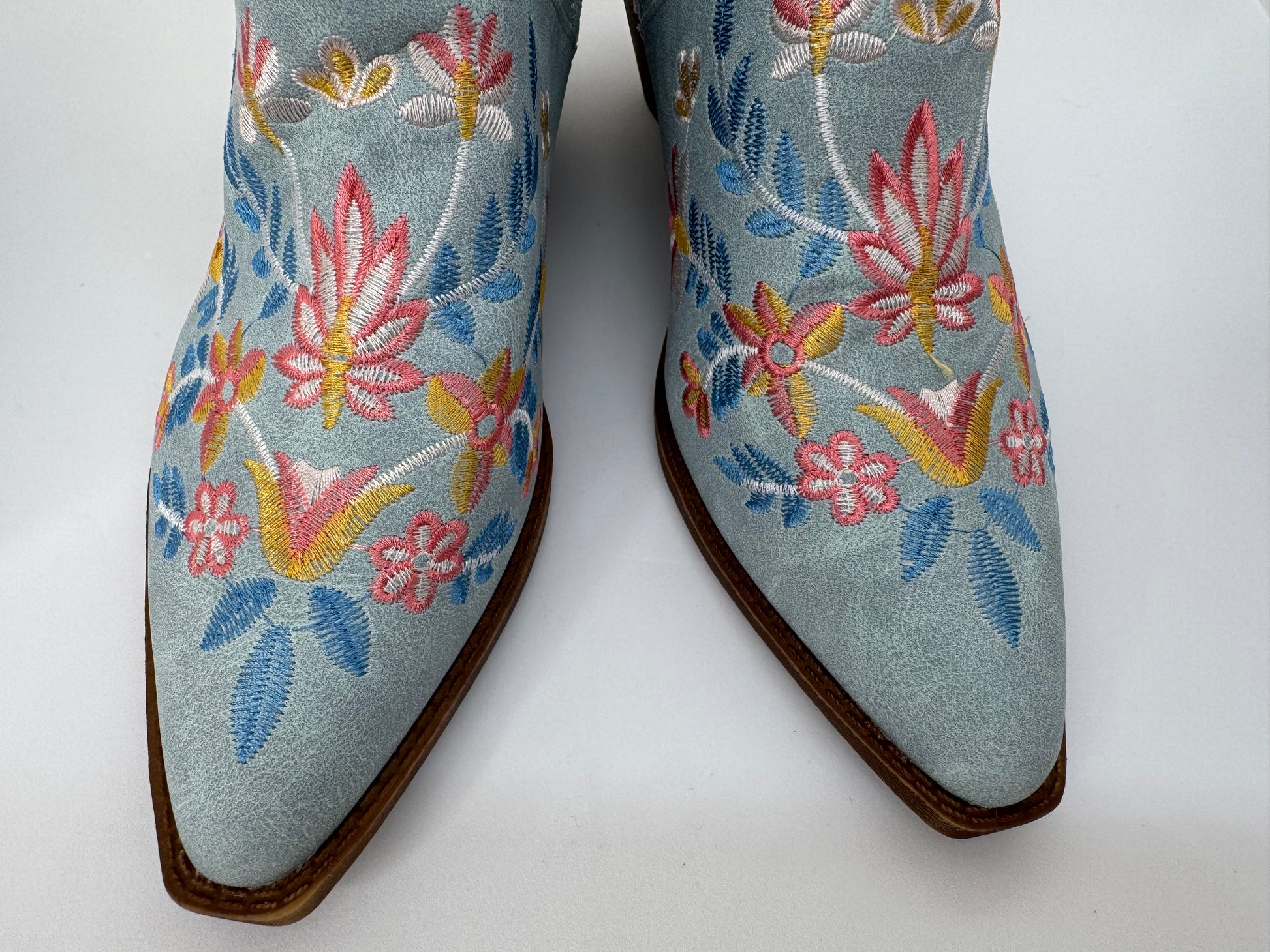 Step into island magic with these blue embroidered western boots – where statement style meets comfort. Featuring vibrant floral embroidery in pink, yellow, and blue, these boots bring a unique twist to the classic cowboy design.