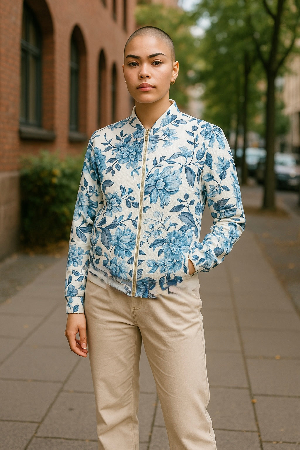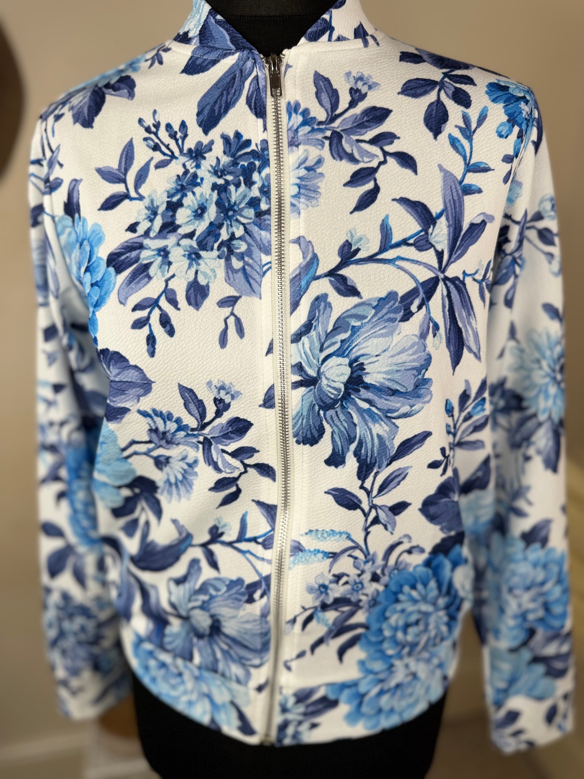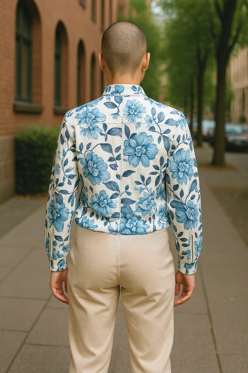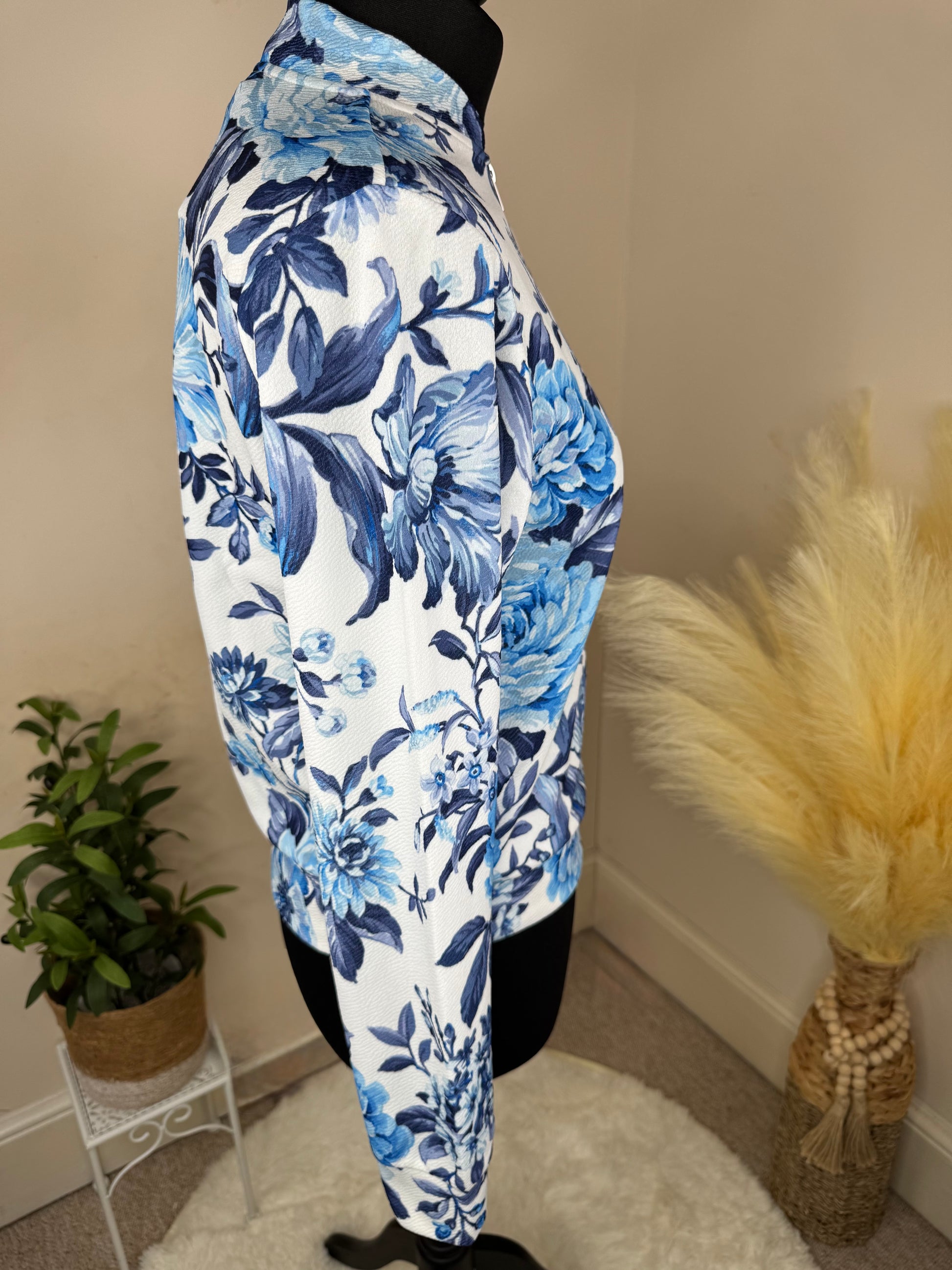 A boutique-style jacket that blends elegance with everyday ease. Designed with a striking blue floral print on a soft ivory base, this piece adds instant charm to any outfit.