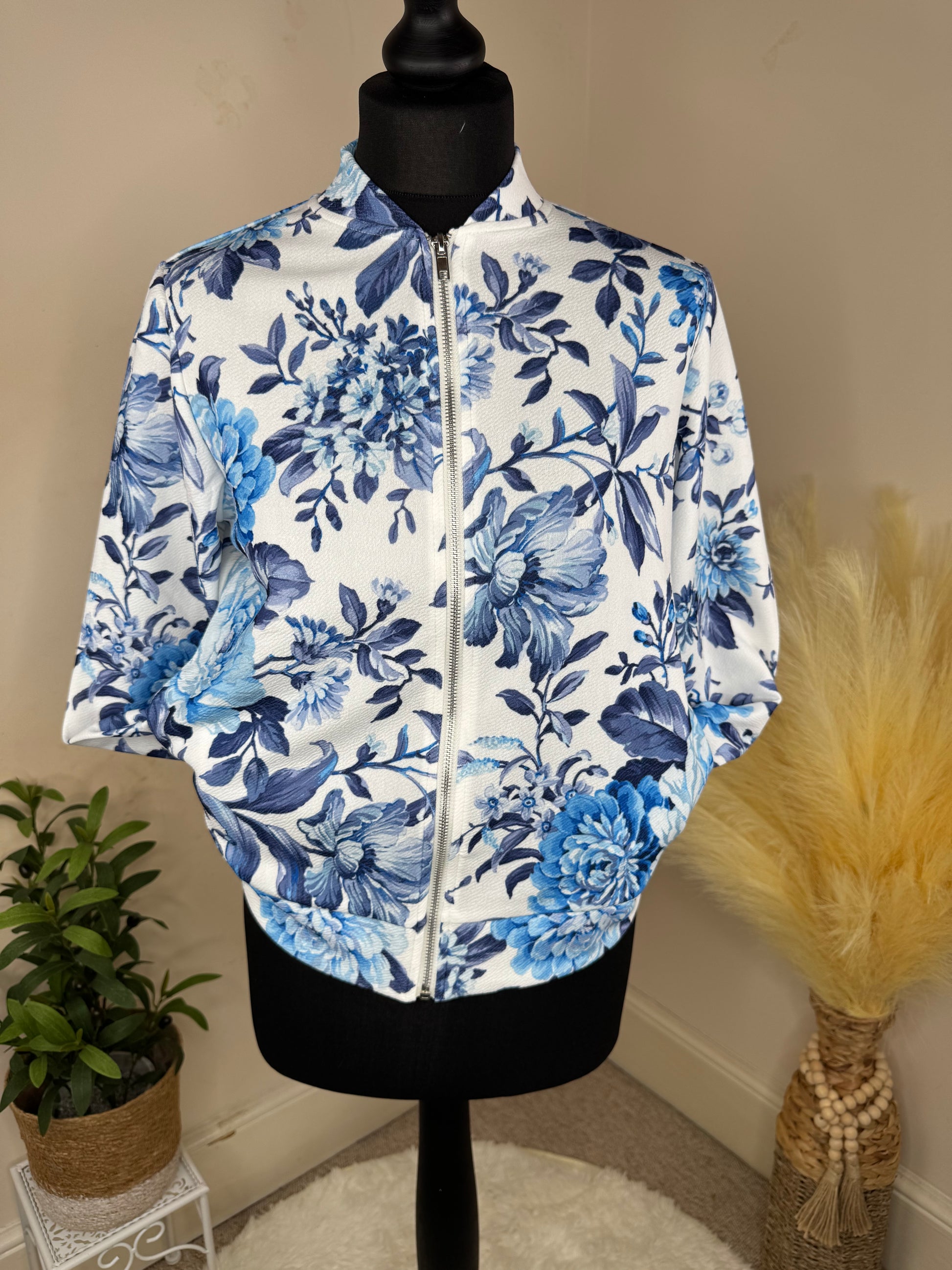 Women’s Zip Jacket with Pockets – Sizes UK 10 & 14, Blue Floral Detail