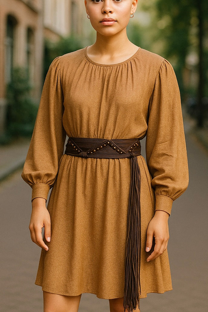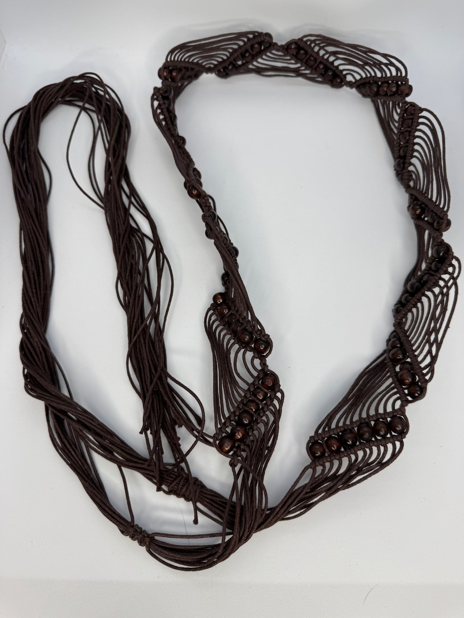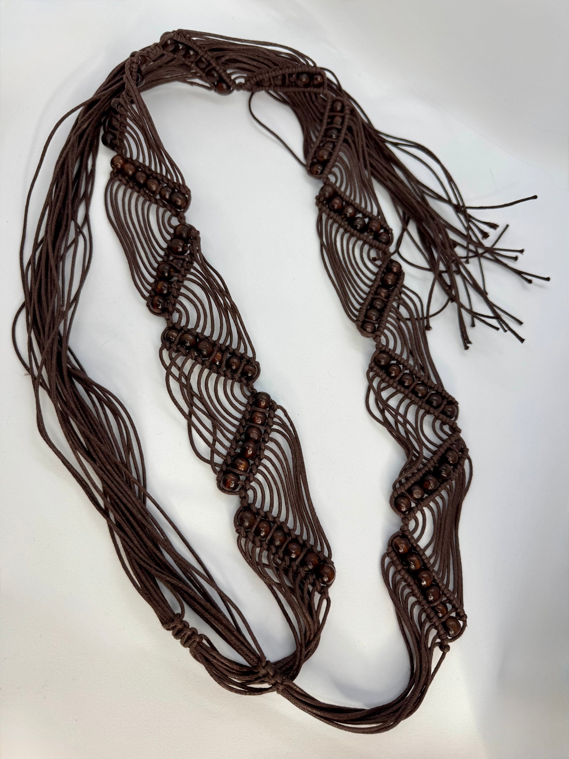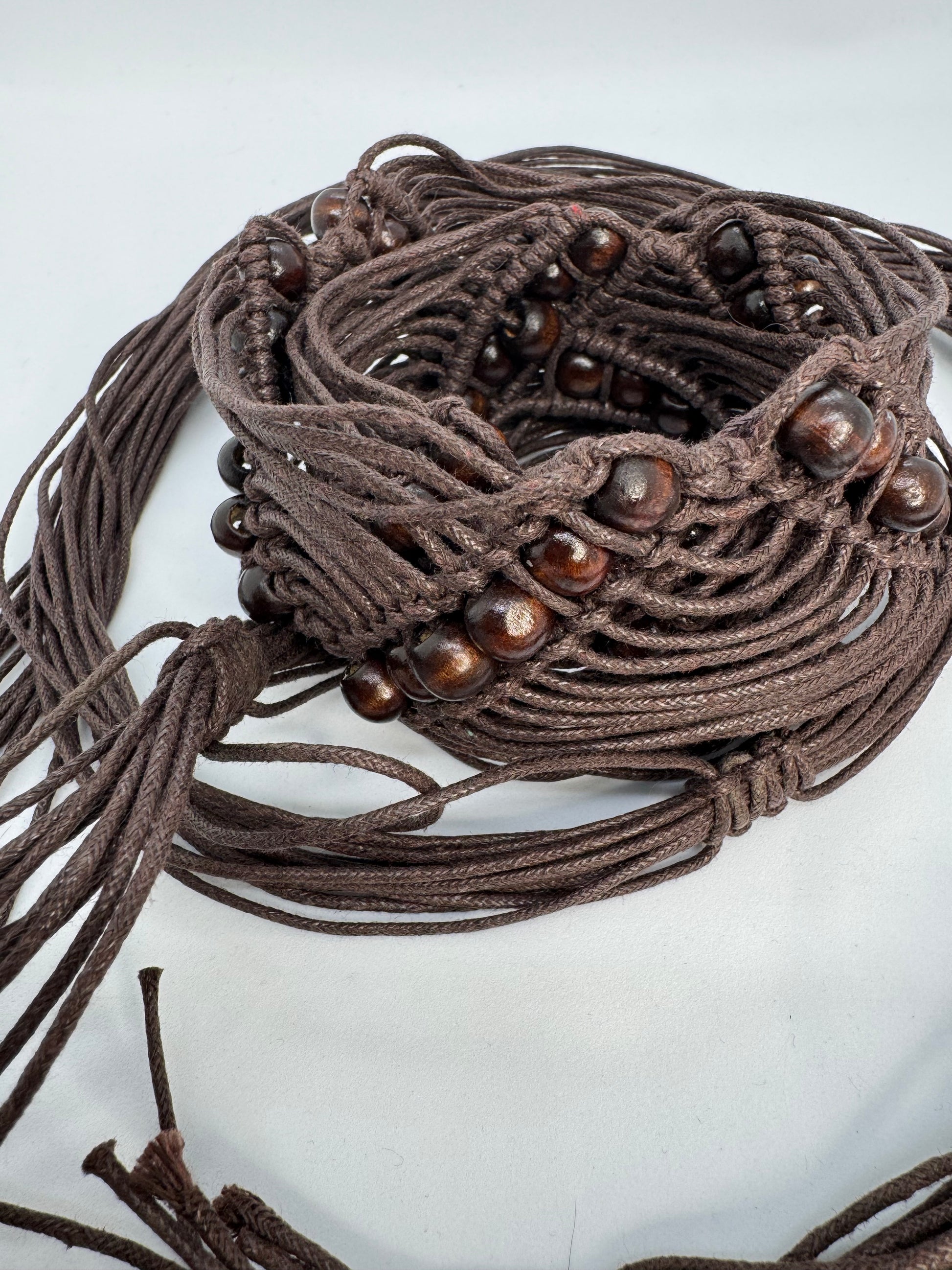 This brown macramé waist belt ties easily at the front or side, finished with smooth wooden beads and flowing tassels that move as you do.
