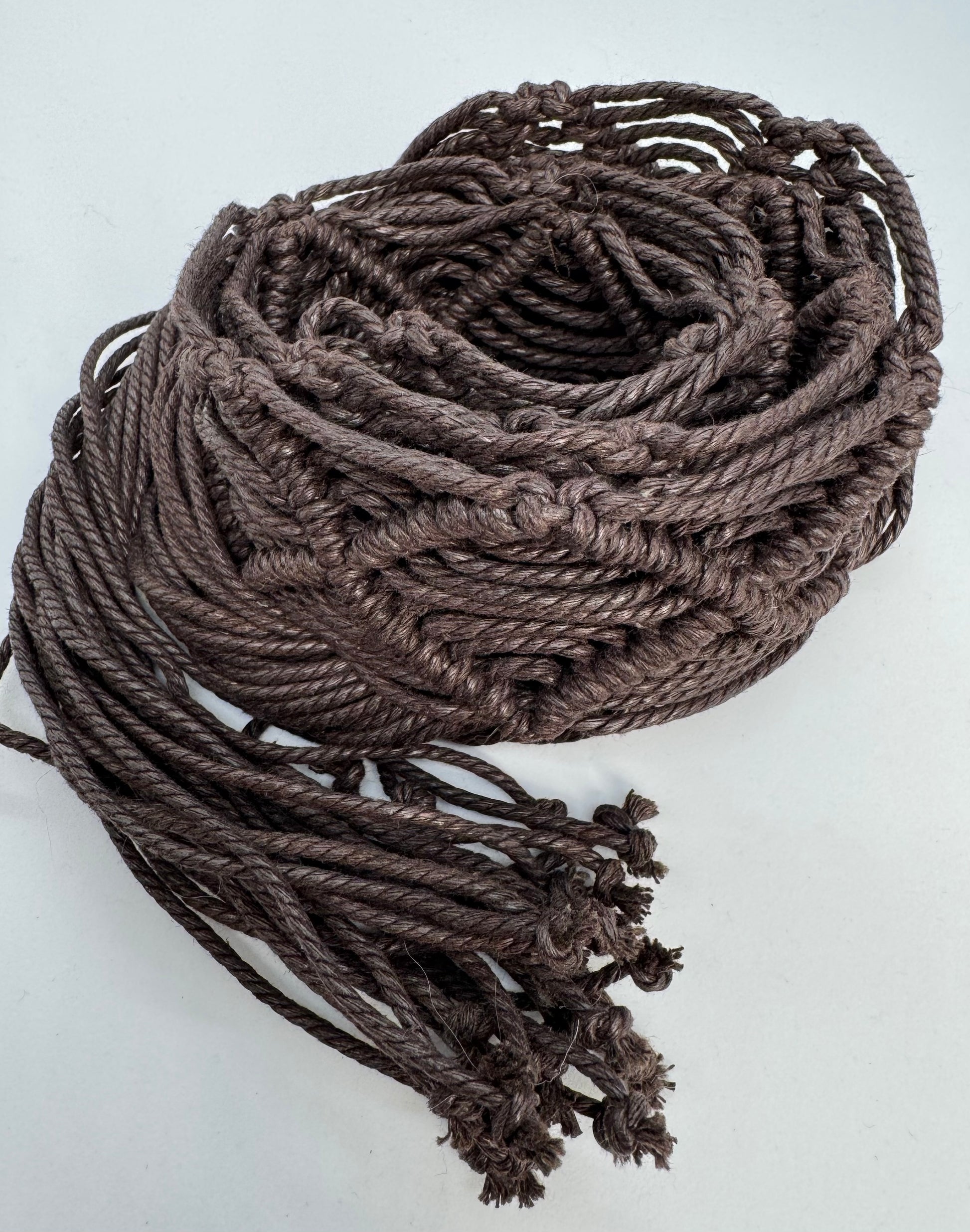 - Handwoven macramé with wooden bead detail