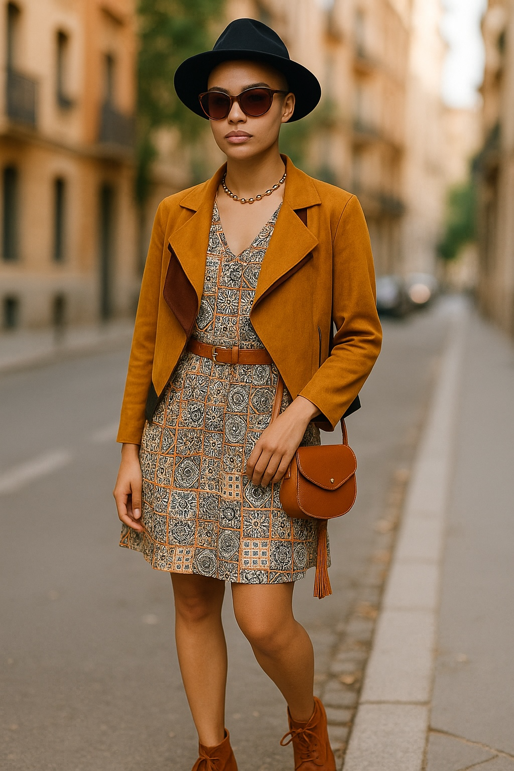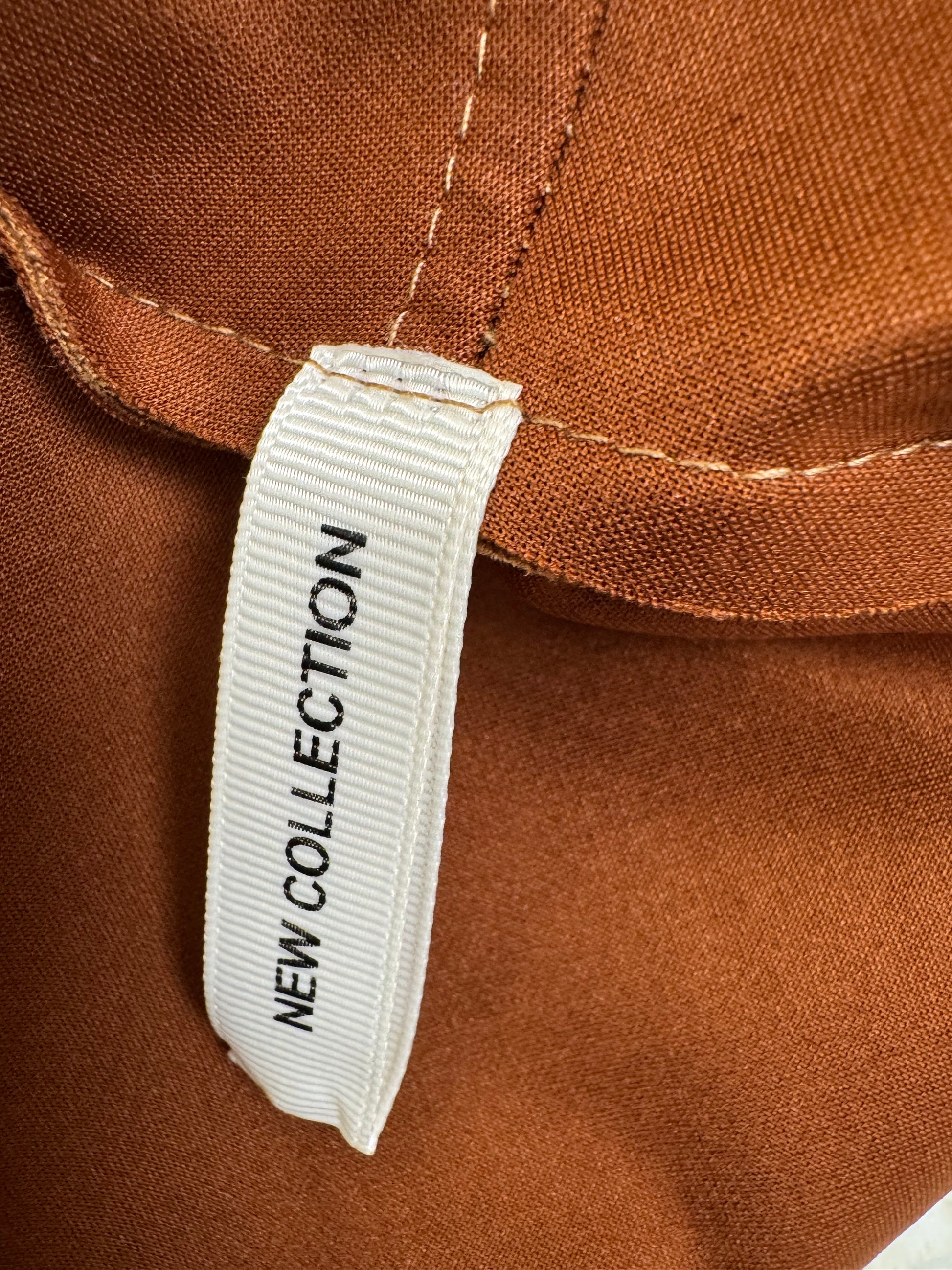 A chic layering piece with a modern edge. This boutique jacket features a soft suede-look finish in warm brown with a contrast waterfall drape in rich rust and black. Lightweight yet stylish, it’s the perfect statement jacket for autumn days or evening layering.