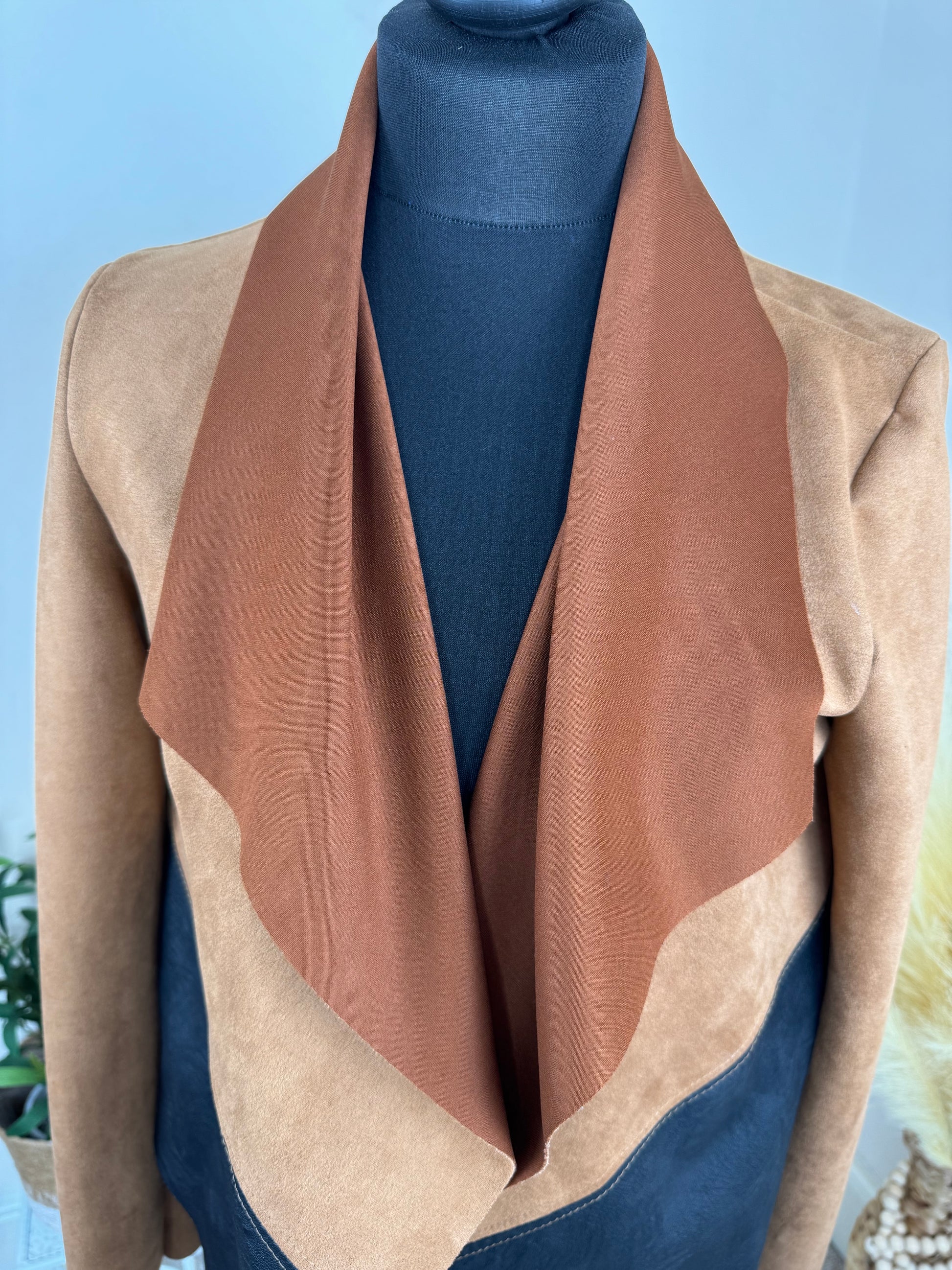 Women’s Suede Look Waterfall Jacket Brown & Black – Open Front Layering Coat UK 8