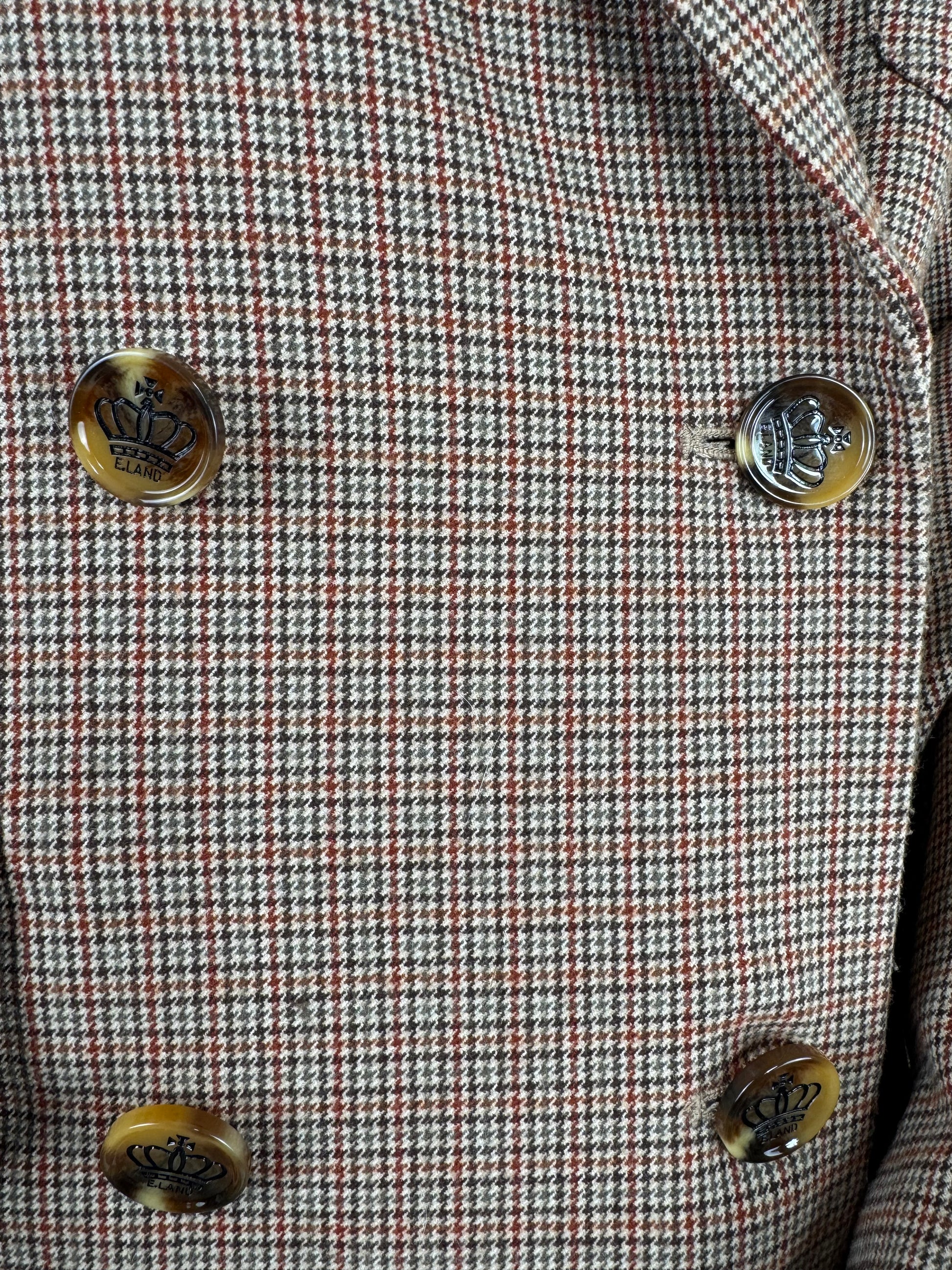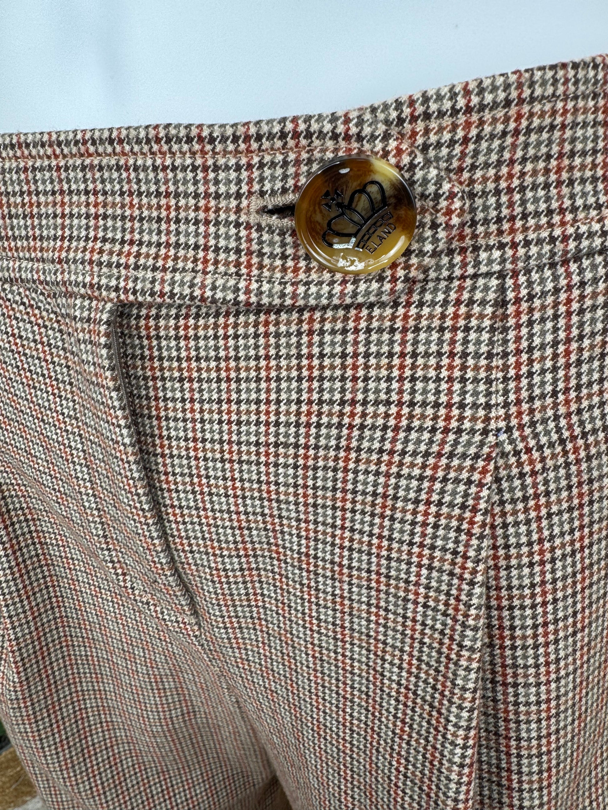 This two-piece suit features a houndstooth check in warm brown and rust tones, finished with signature E·LAND crown buttons. The tailored blazer is fully lined with structured shoulders, while the pleated trousers create a smart straight-leg fit with a rolled hem for a contemporary edge.