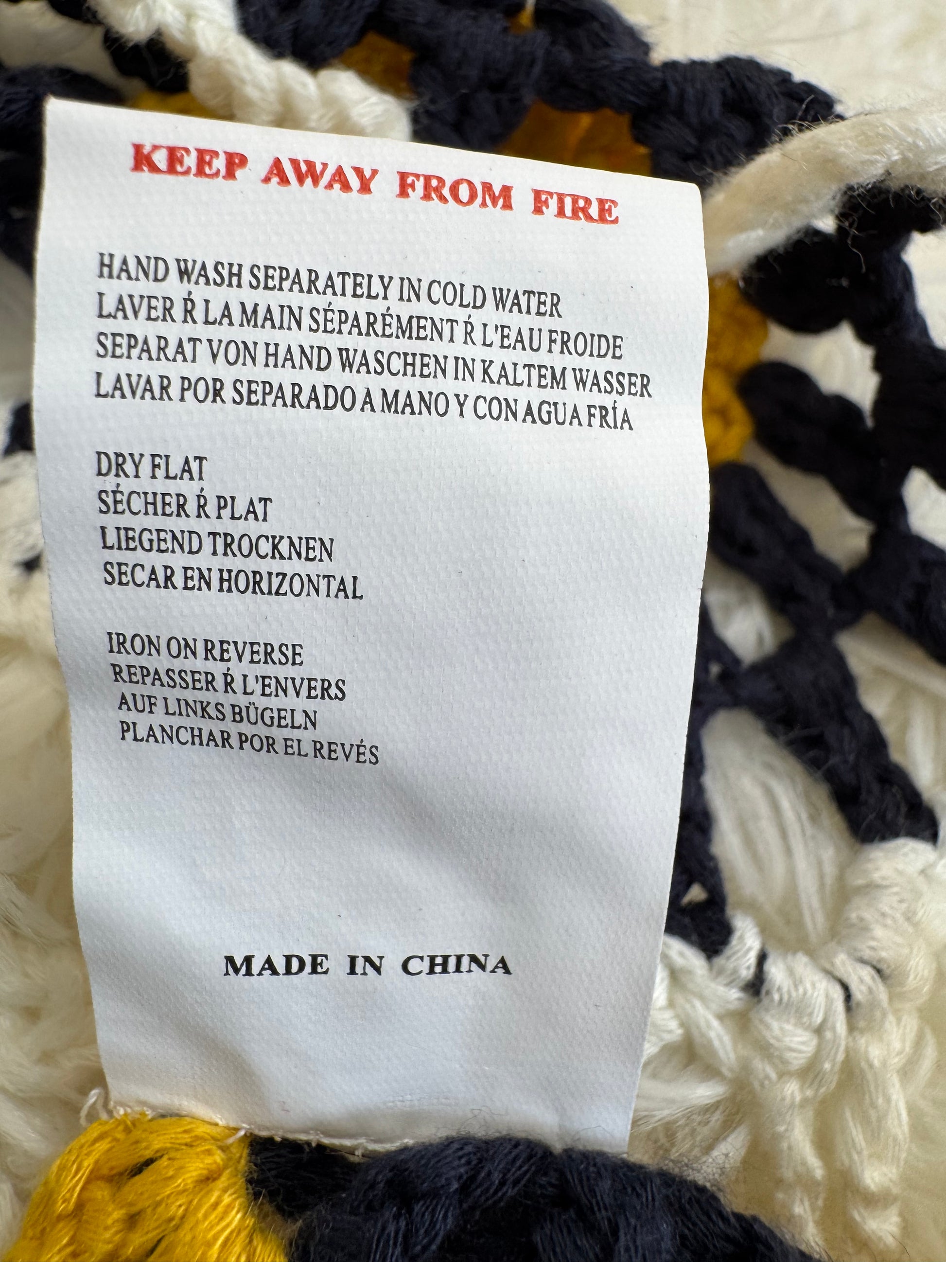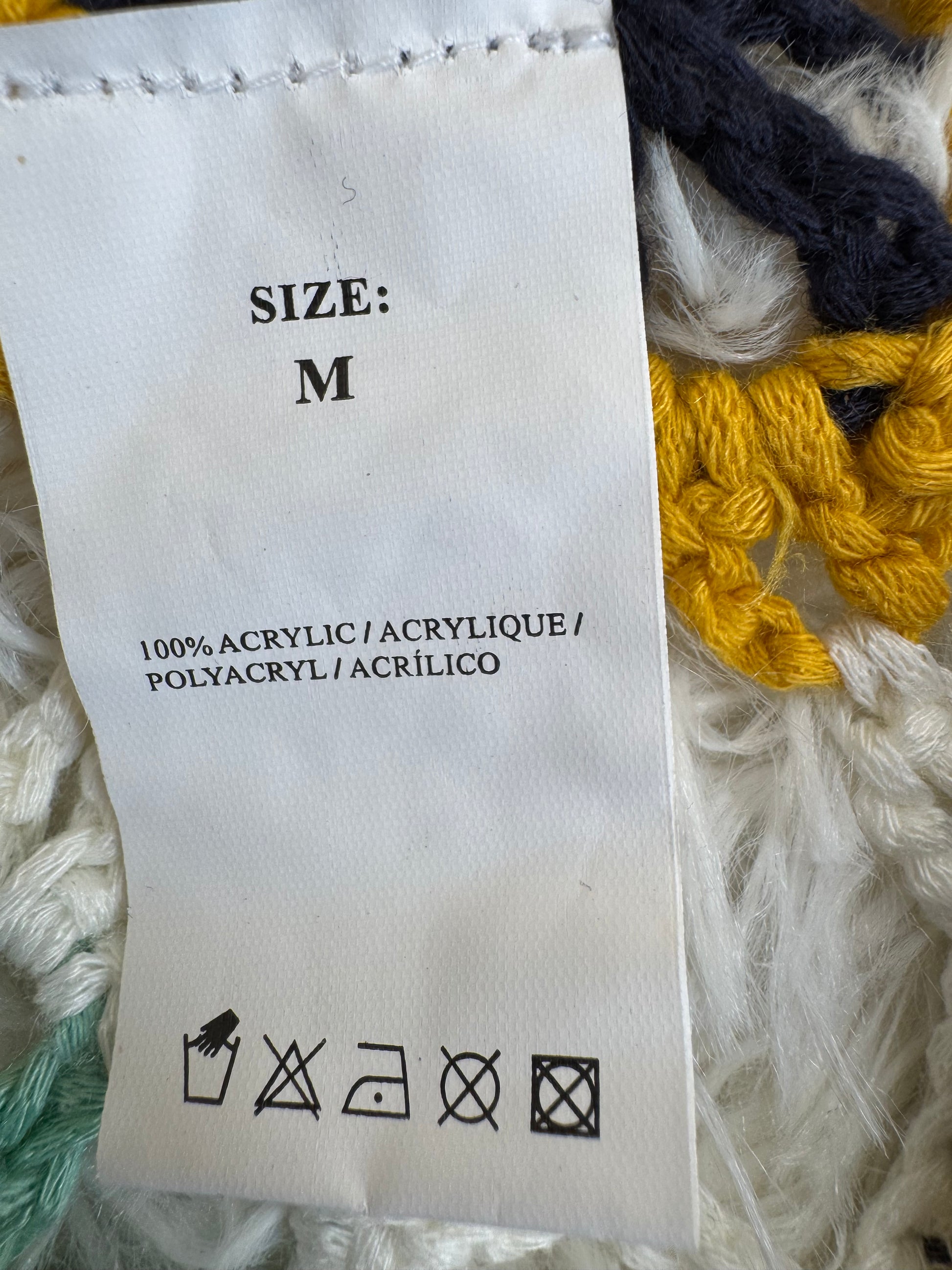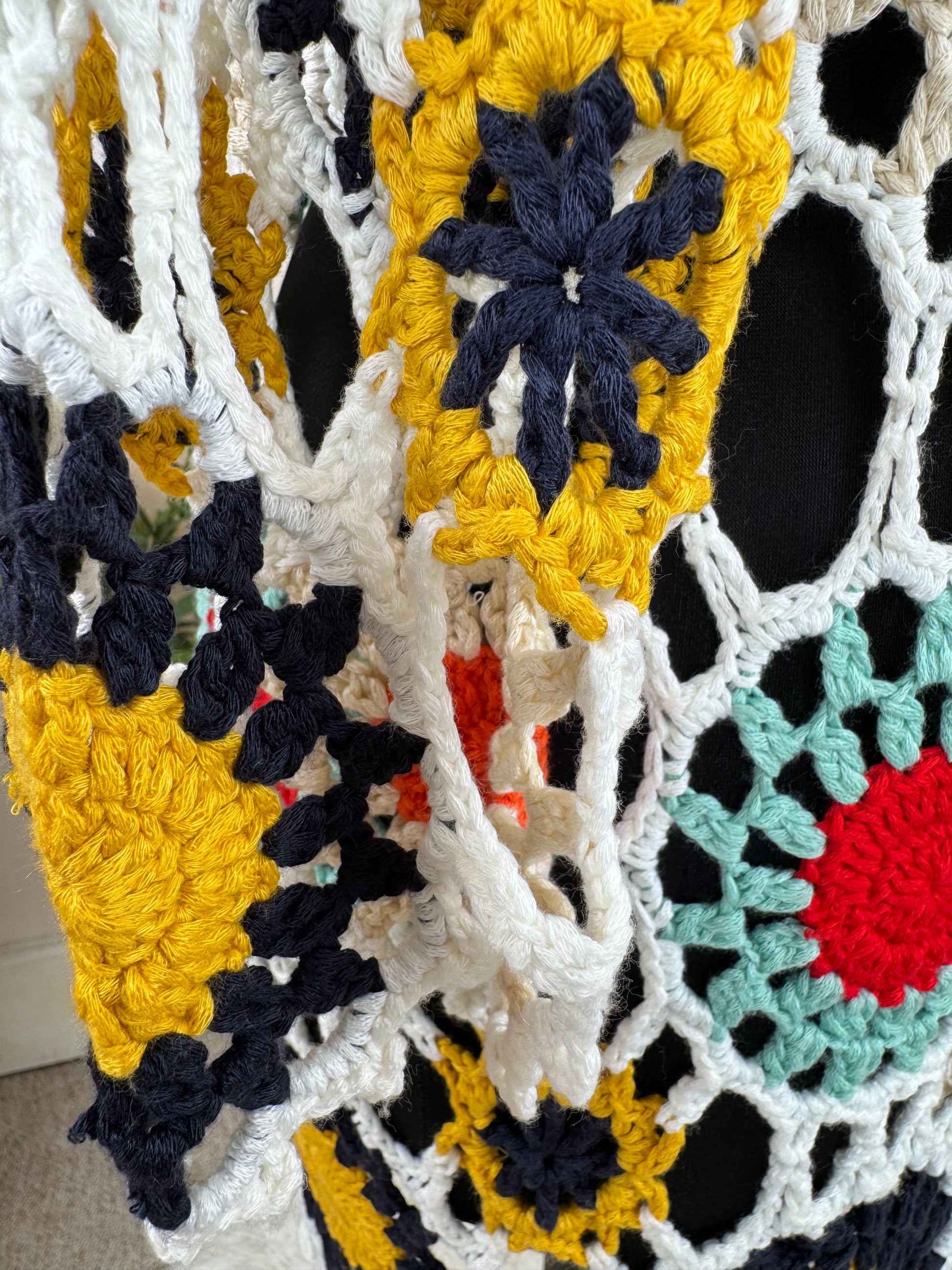 A vibrant crochet tunic that feels like sunshine stitched into every loop. Designed in an open-knit floral pattern with bold pops of red, yellow, teal and navy, this piece layers beautifully over swimwear, slip dresses, or even jeans. With long sleeves and a relaxed fit, it’s perfect as a festival statement, a summer cover-up, or an island evening layer.