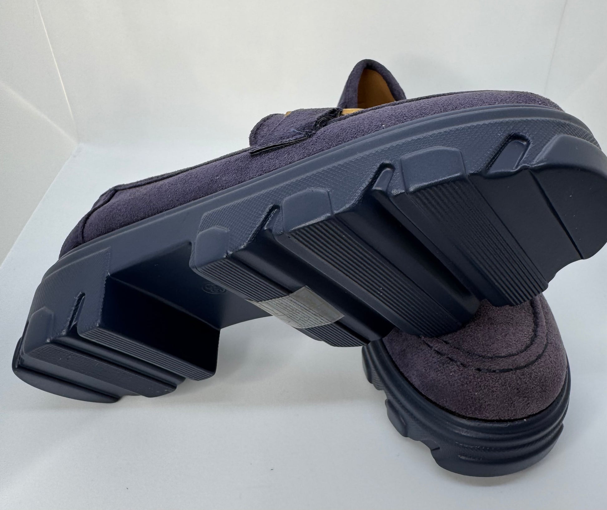 Women’s Suede Chunky Loafers – Flat Slip-On Shoes Purple with Gold Chain Detail