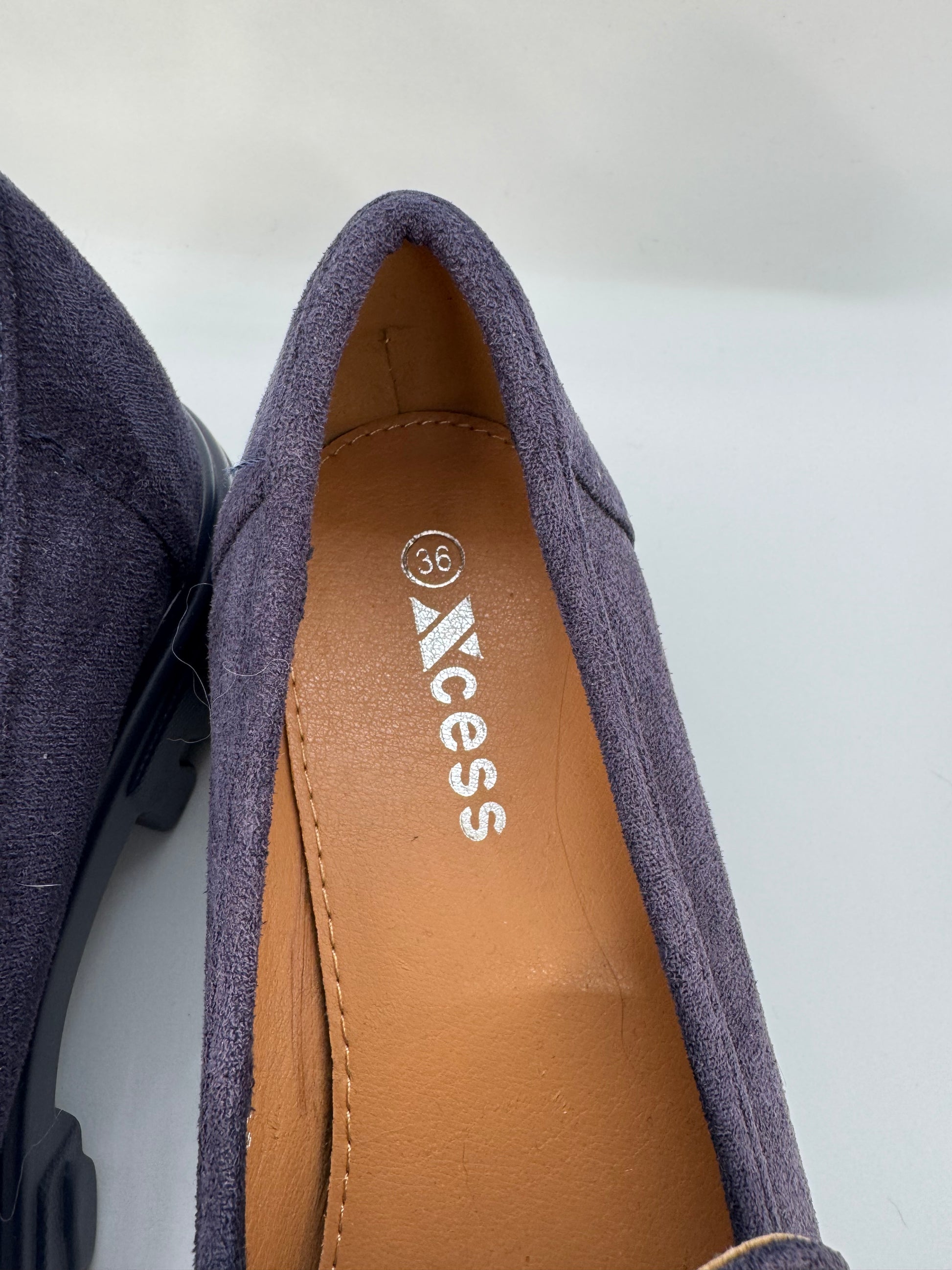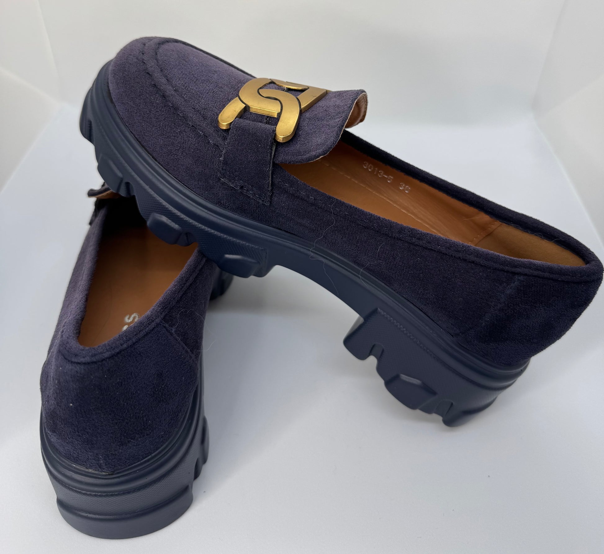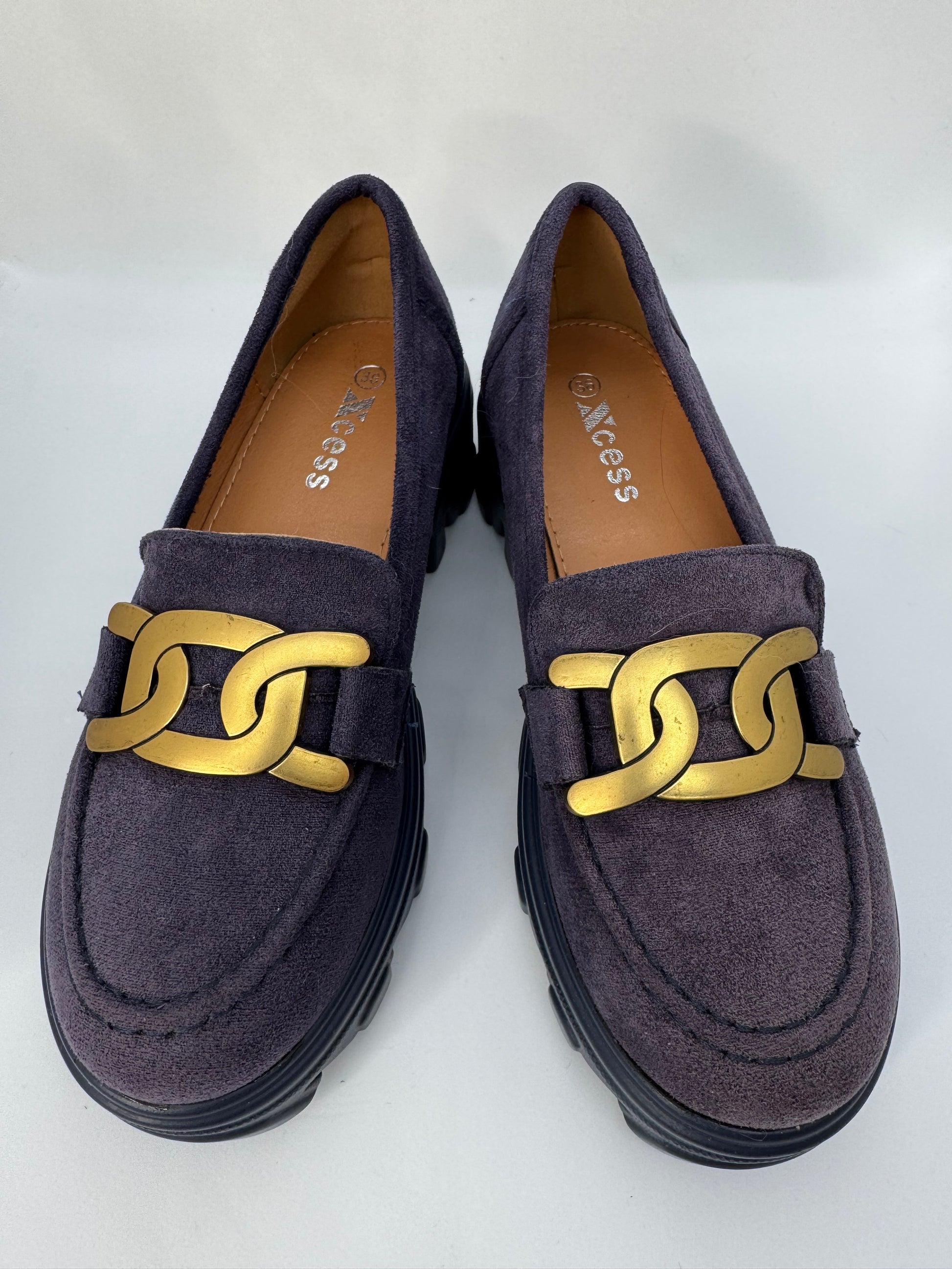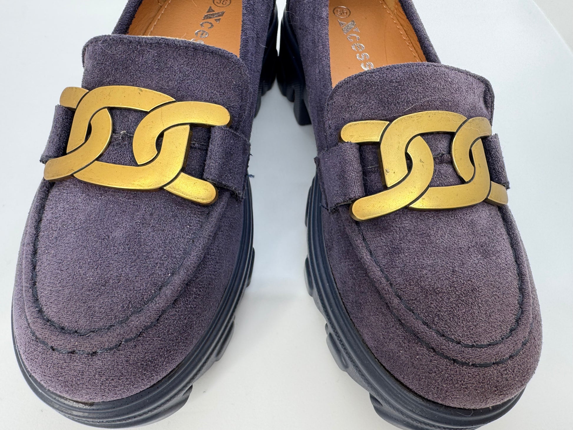 Add a touch of elegance to your everyday style with these stunning dark purple suede loafers. Designed with a bold gold chain detail across the front and a chunky sole for all-day comfort, they strike the perfect balance between classic and statement. Easy to slip on and effortlessly chic, these loafers will elevate any outfit — from denim and trousers to dresses and skirts.