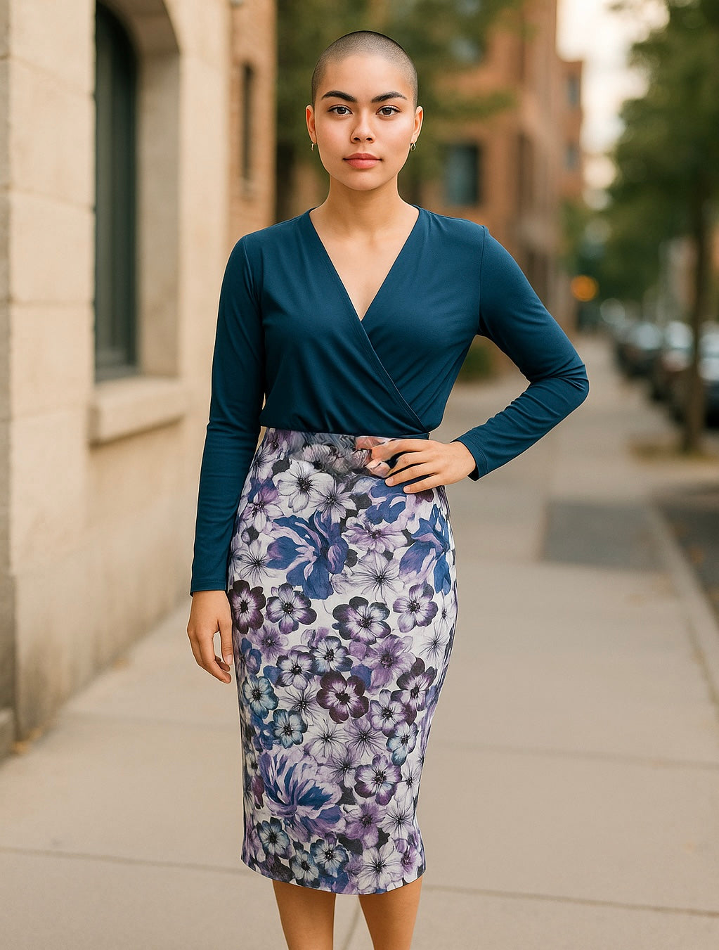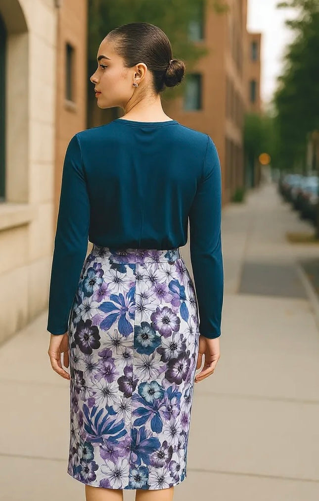 A bloom of violets and indigos carried by the sea breeze — this floral pencil skirt is where everyday elegance meets the island dream. Tailored to hug the figure with a comfortable stretch, it flows naturally from daytime charm to evening ease. Pair with a soft blouse or a simple knit, and let the print tell its story of blossoms by the shore.
