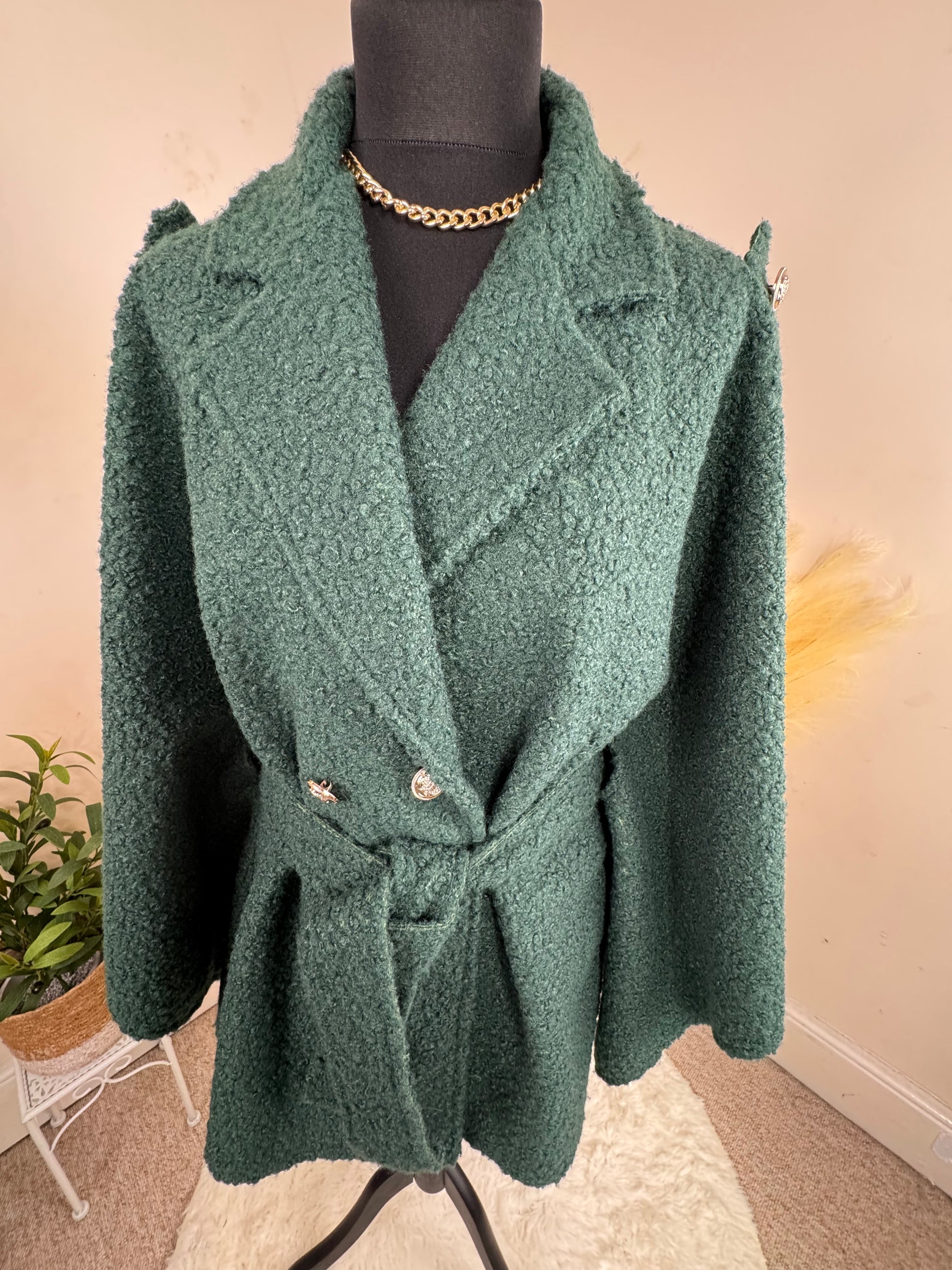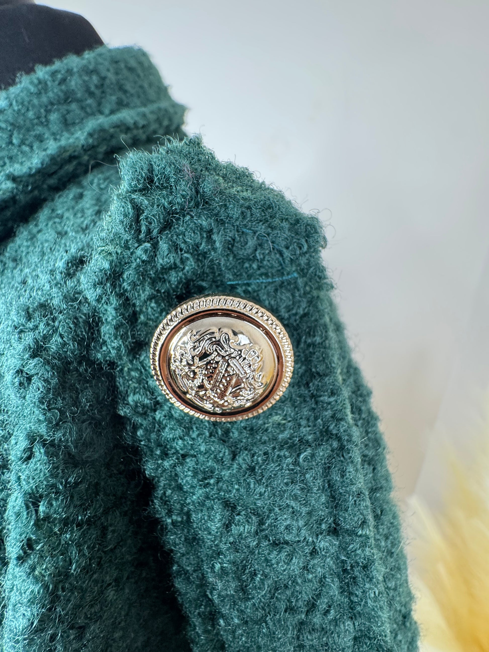 Chic, versatile, and effortlessly stylish — this Misumi Made in Italy belted poncho coat combines the ease of a poncho with the elegance of a tailored coat. Crafted in a rich forest green bouclé fabric, it features a double-breasted front, gold-tone buttons, and a matching waist belt for a flattering silhouette.