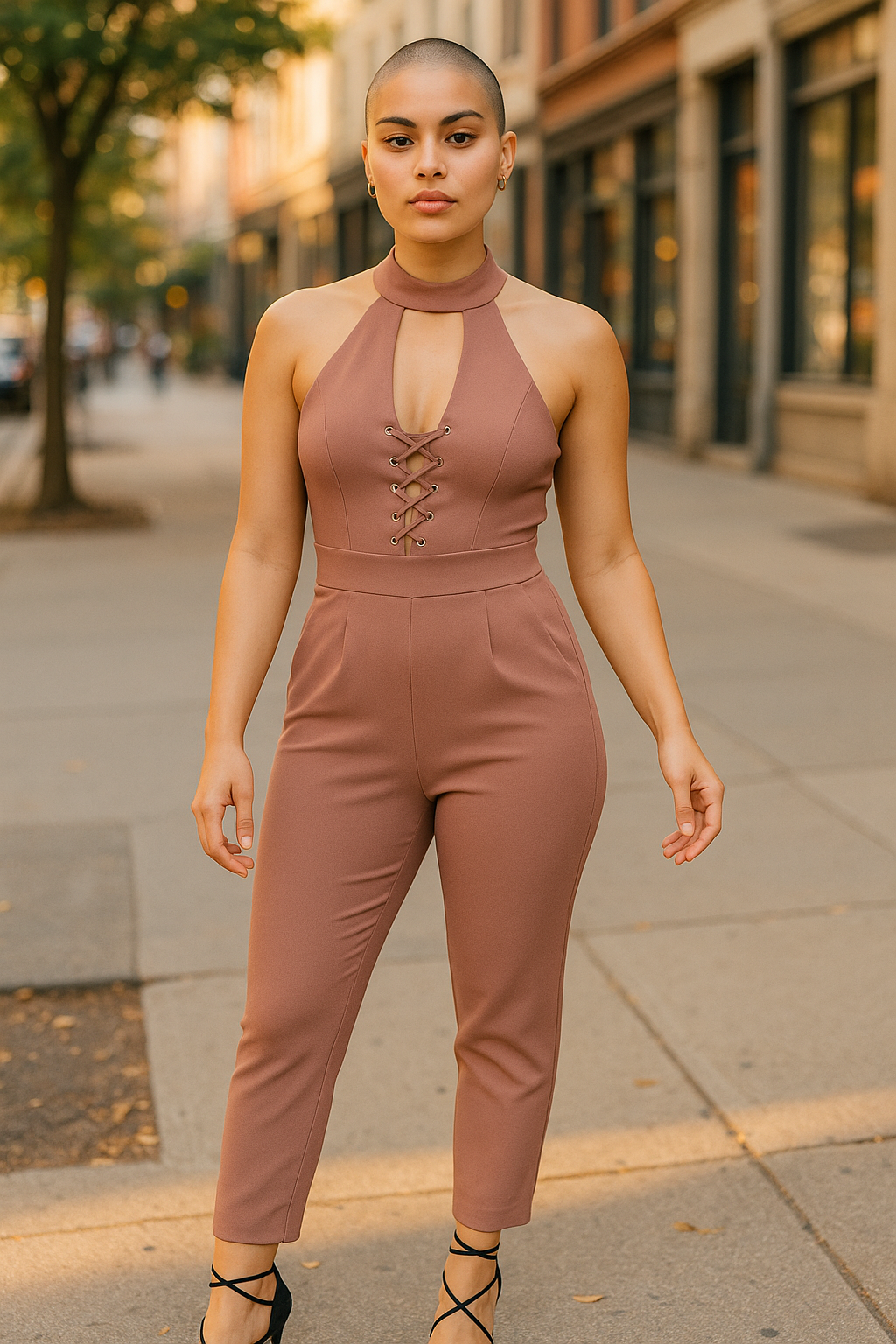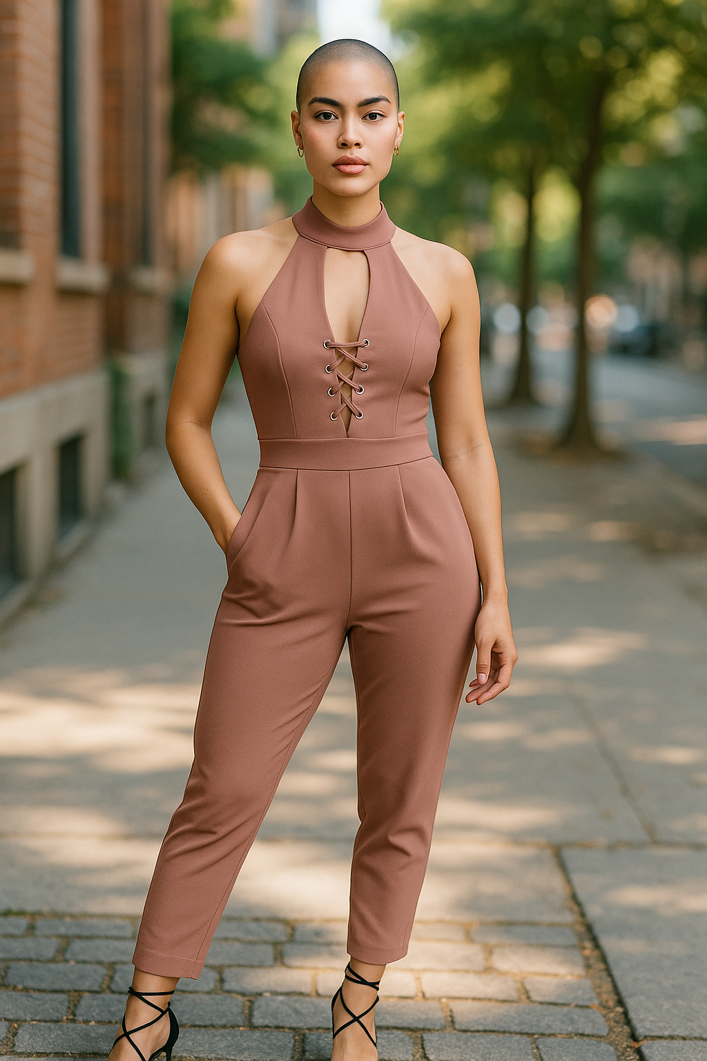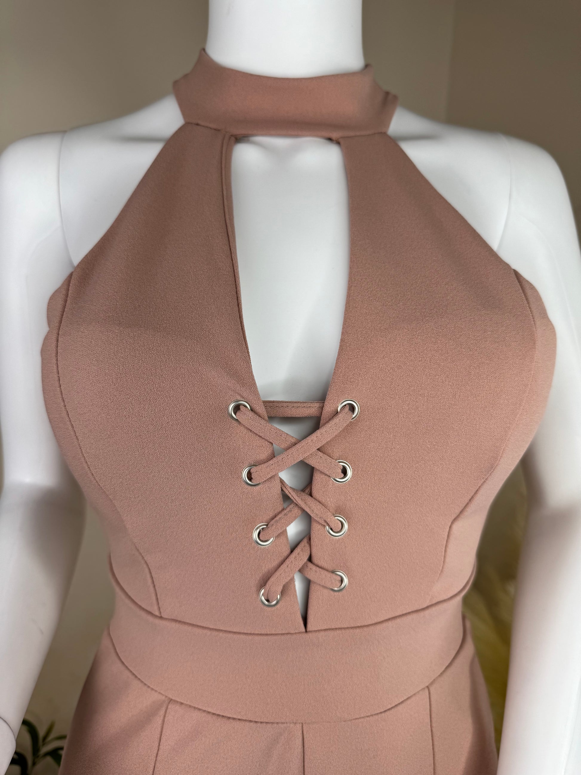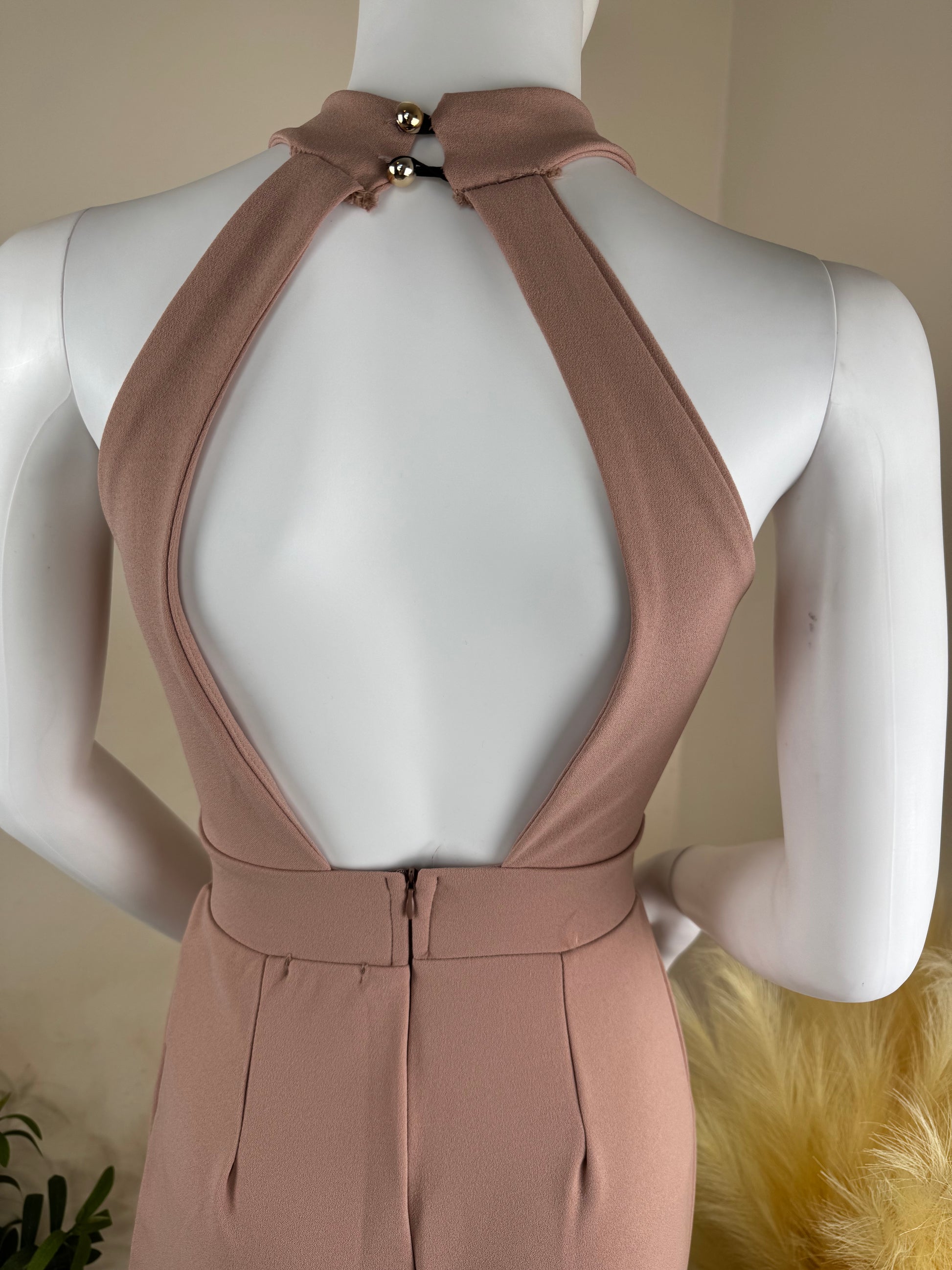 Step into evening elegance with this Pink mocha halter jumpsuit.