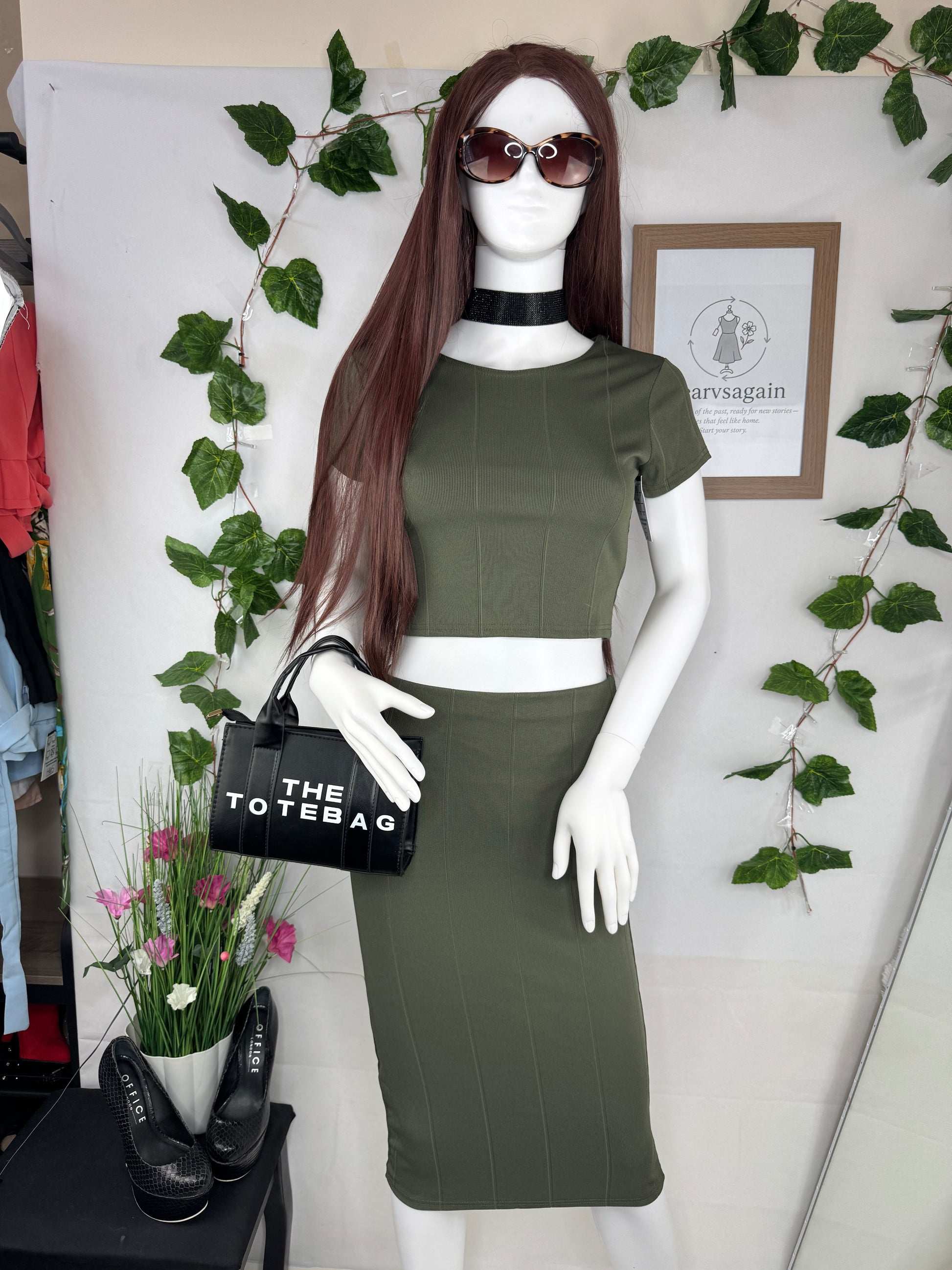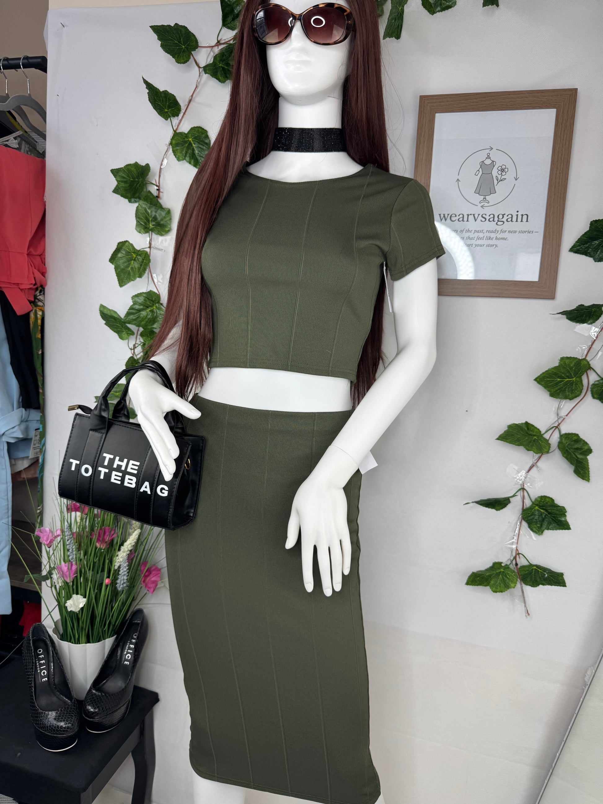 Two-piece co-ord set in khaki green. Stretchy ribbed fabric. Includes short-sleeve crop top and matching high-waisted midi pencil skirt.