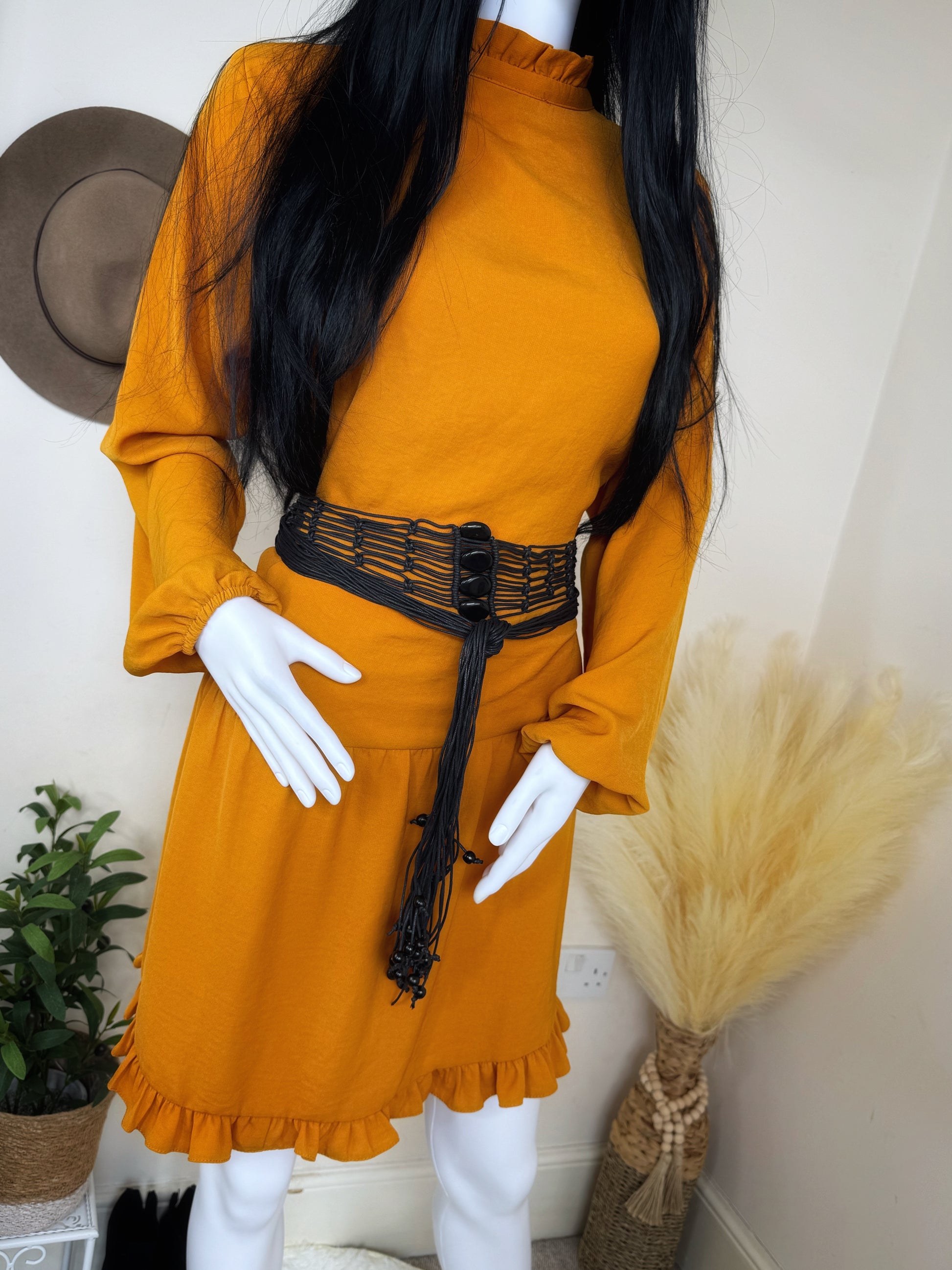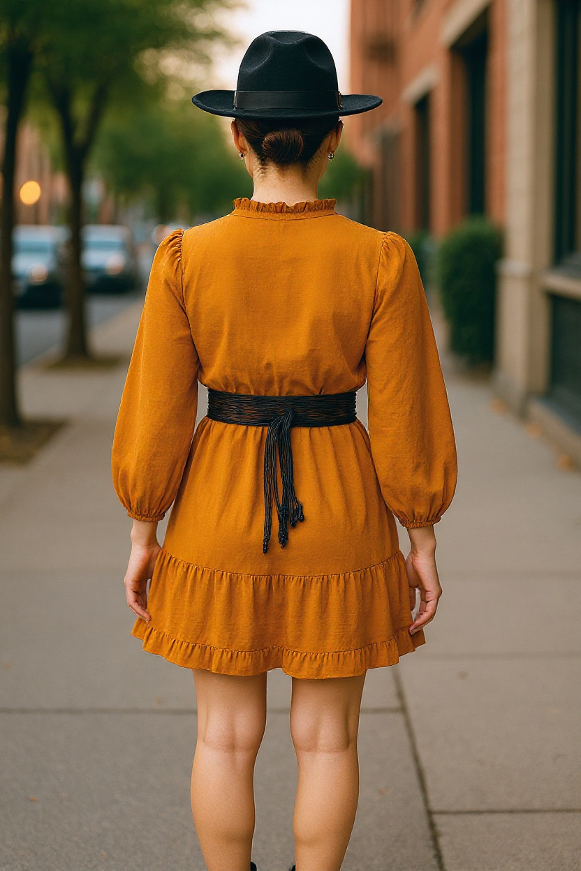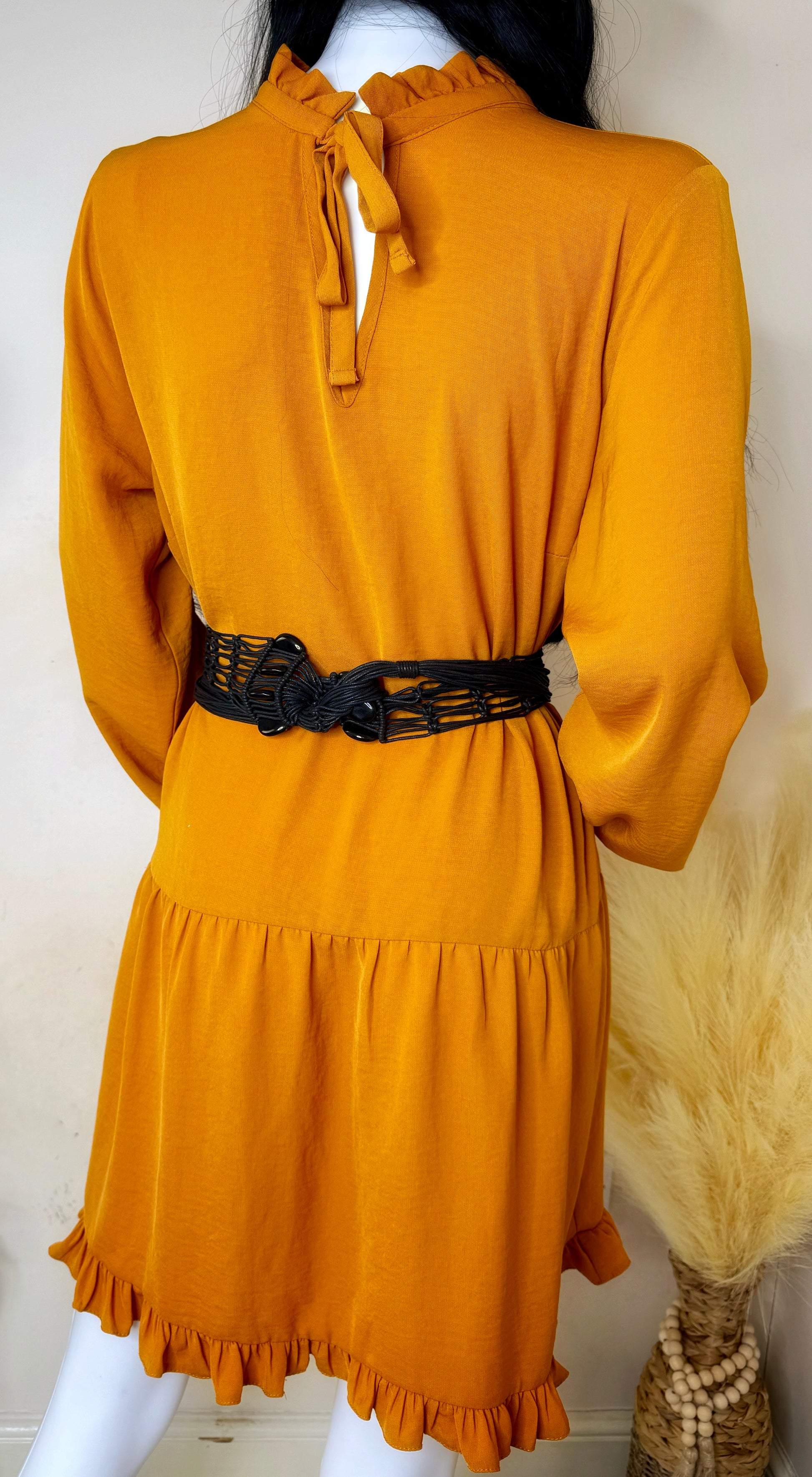 Bring a pop of colour to your wardrobe with this mustard ruffle hem dress. Featuring long puff sleeves, a flattering belted waist, and a playful frill hem, it’s the perfect piece for casual days, autumn outings, or weekend plans. The lightweight fabric makes it easy to wear all year round — just add boots in winter or sandals in summer.