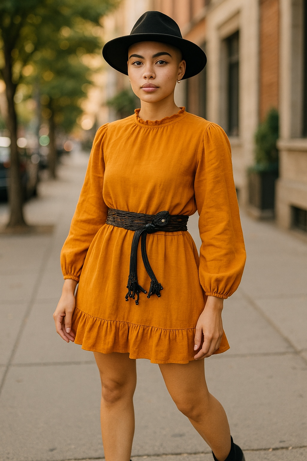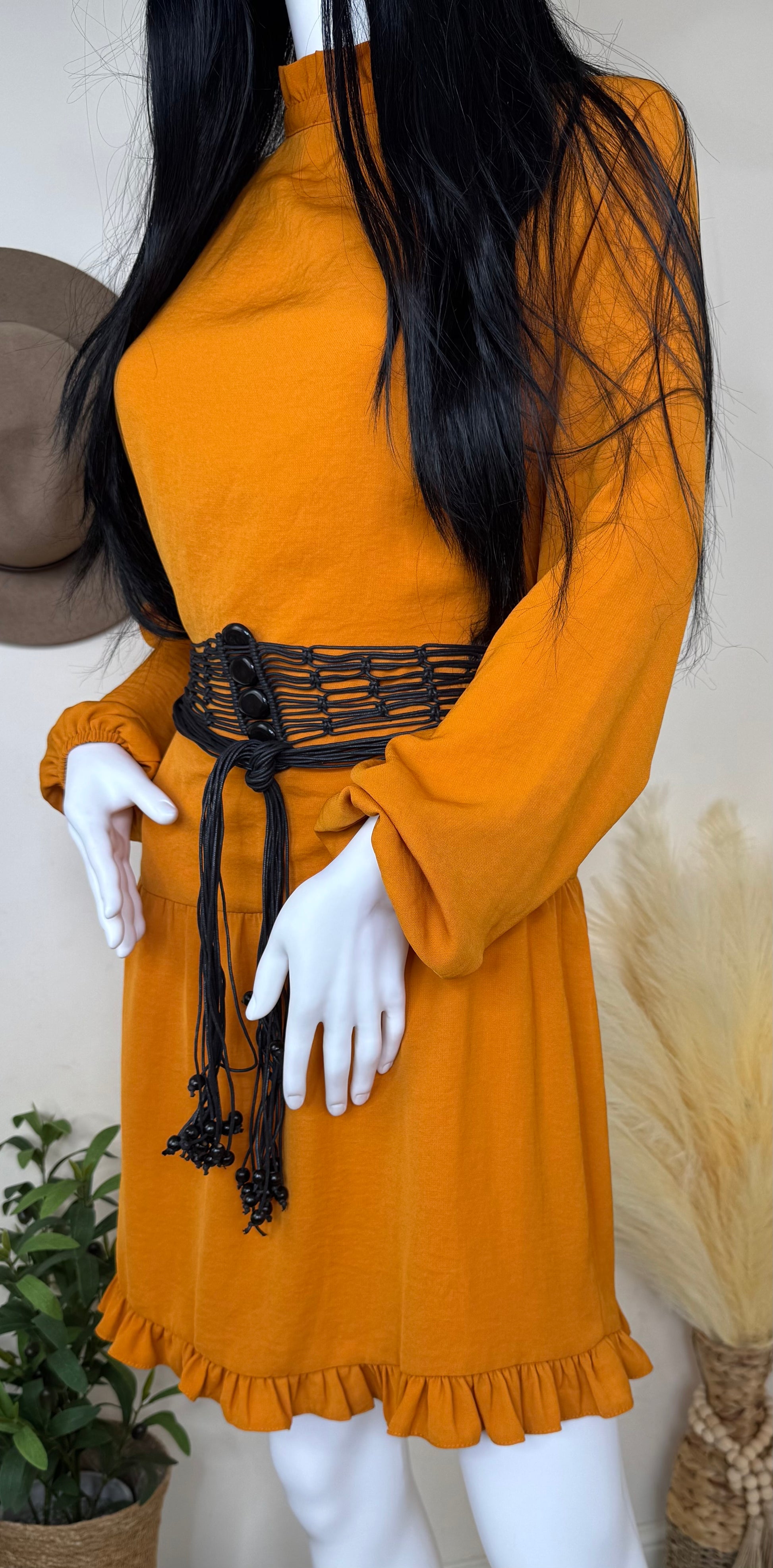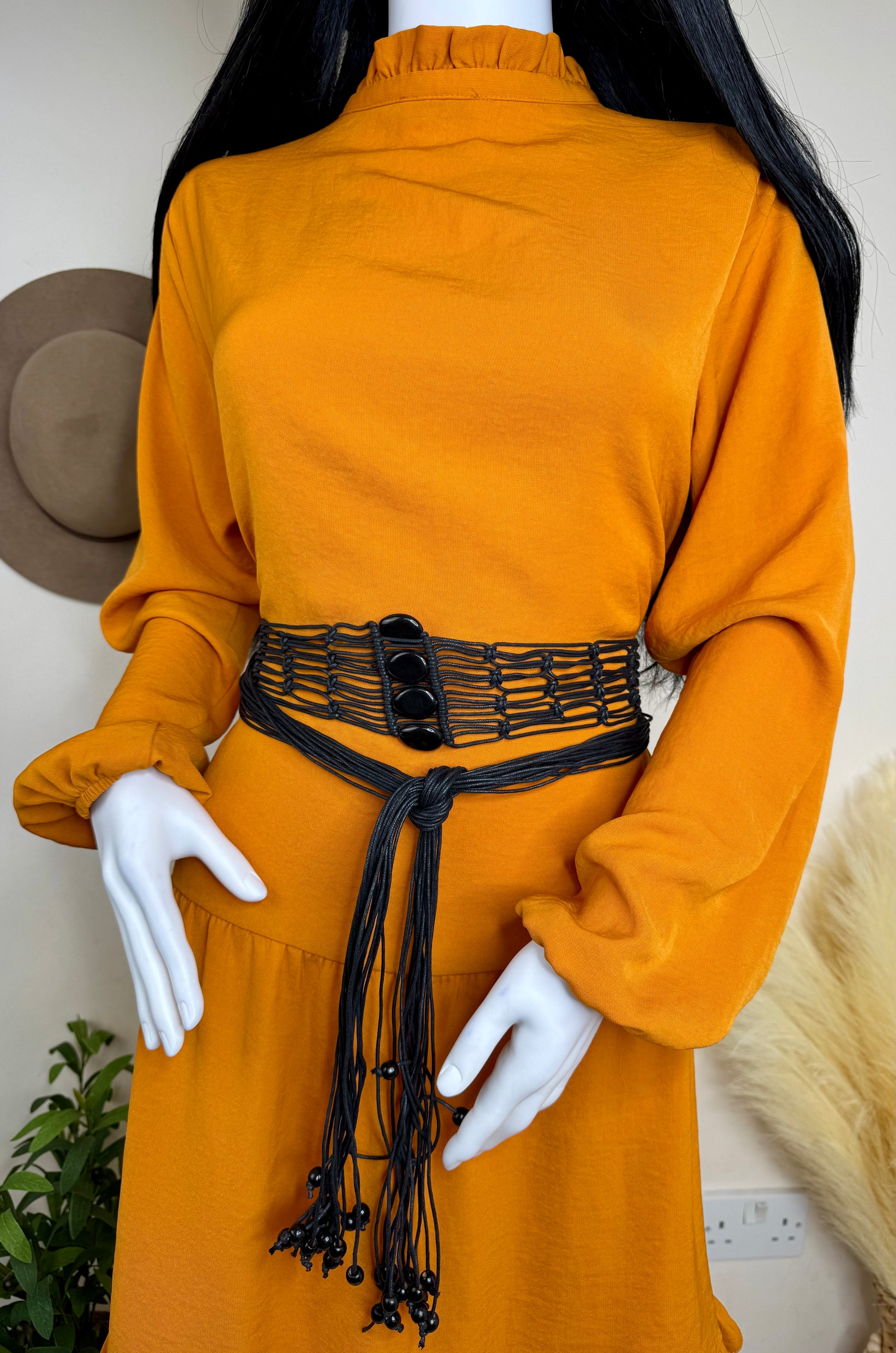 Bring a pop of colour to your wardrobe with this mustard ruffle hem dress. Featuring long puff sleeves, a flattering belted waist, and a playful frill hem, it’s the perfect piece for casual days, autumn outings, or weekend plans. The lightweight fabric makes it easy to wear all year round — just add boots in winter or sandals in summer.