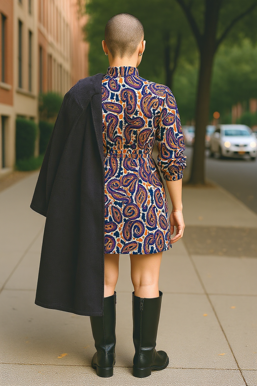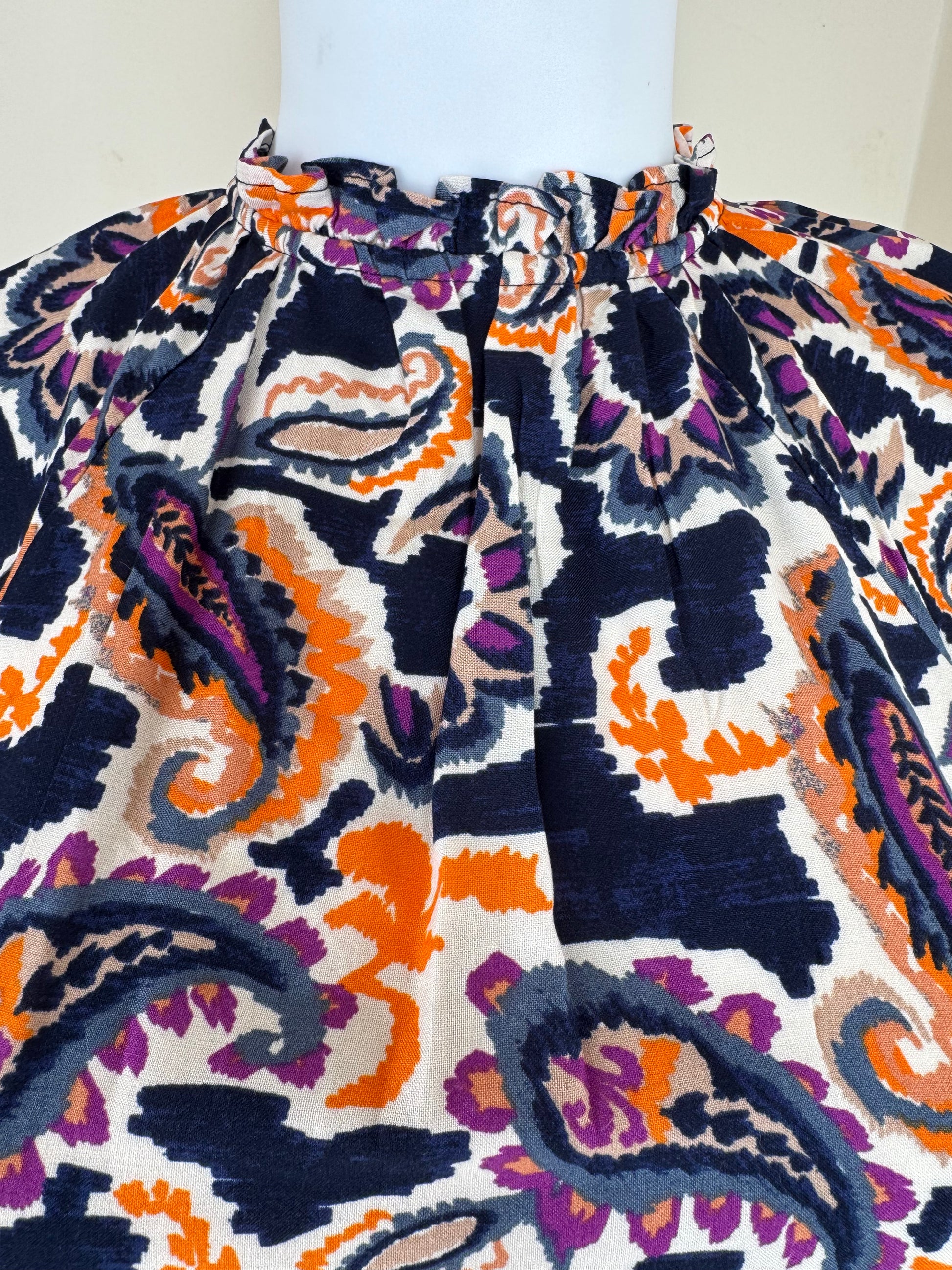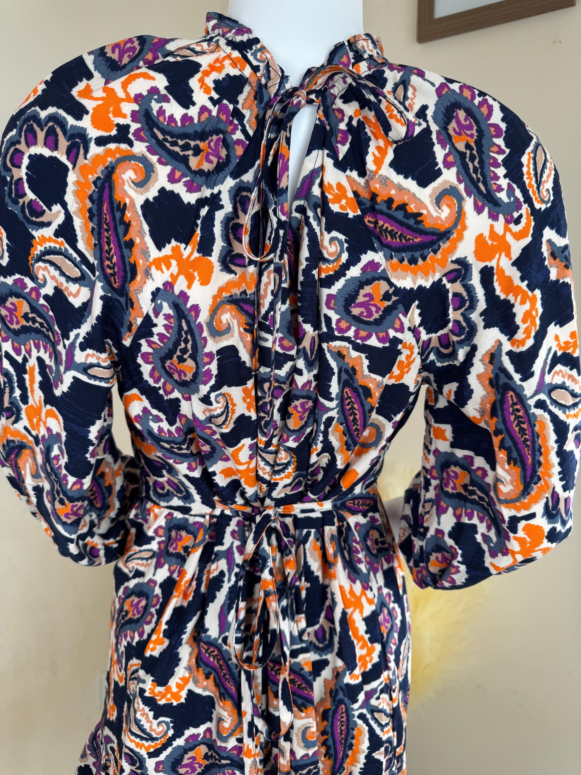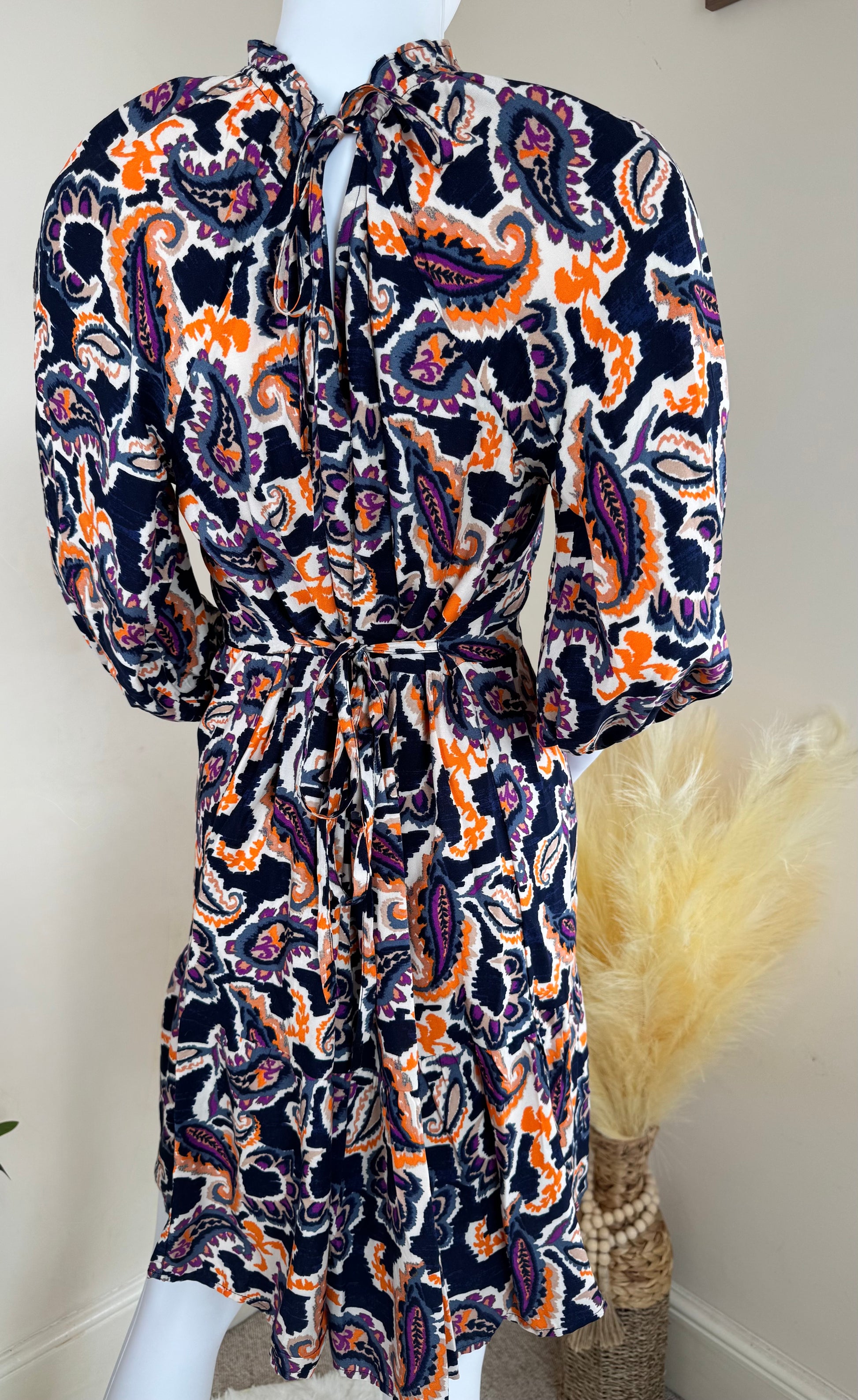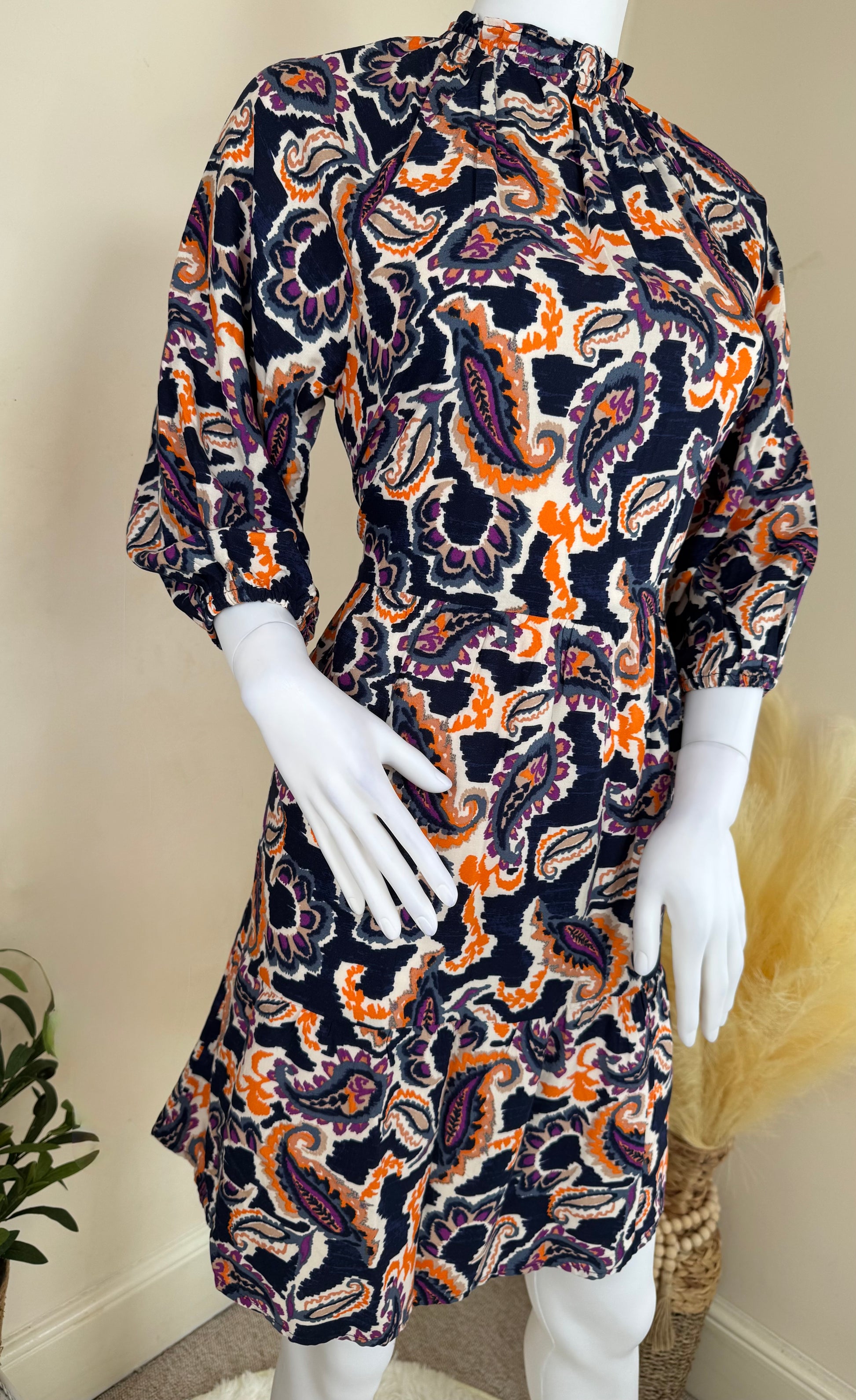 A playful yet polished piece ready for new adventures. This long sleeve mini dress features a striking paisley print in rich tones of orange, purple, and navy — perfect for adding a statement to your everyday wardrobe.