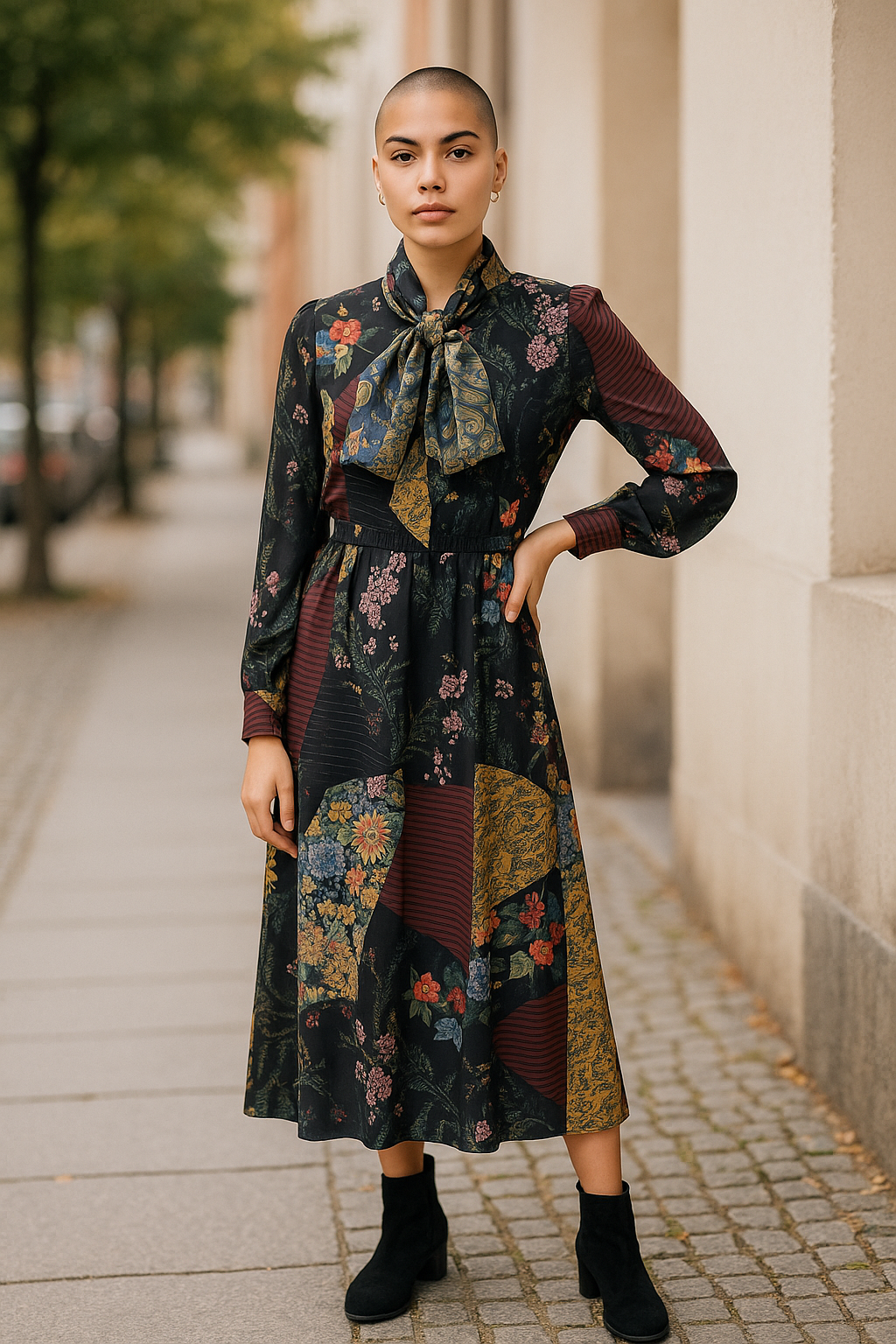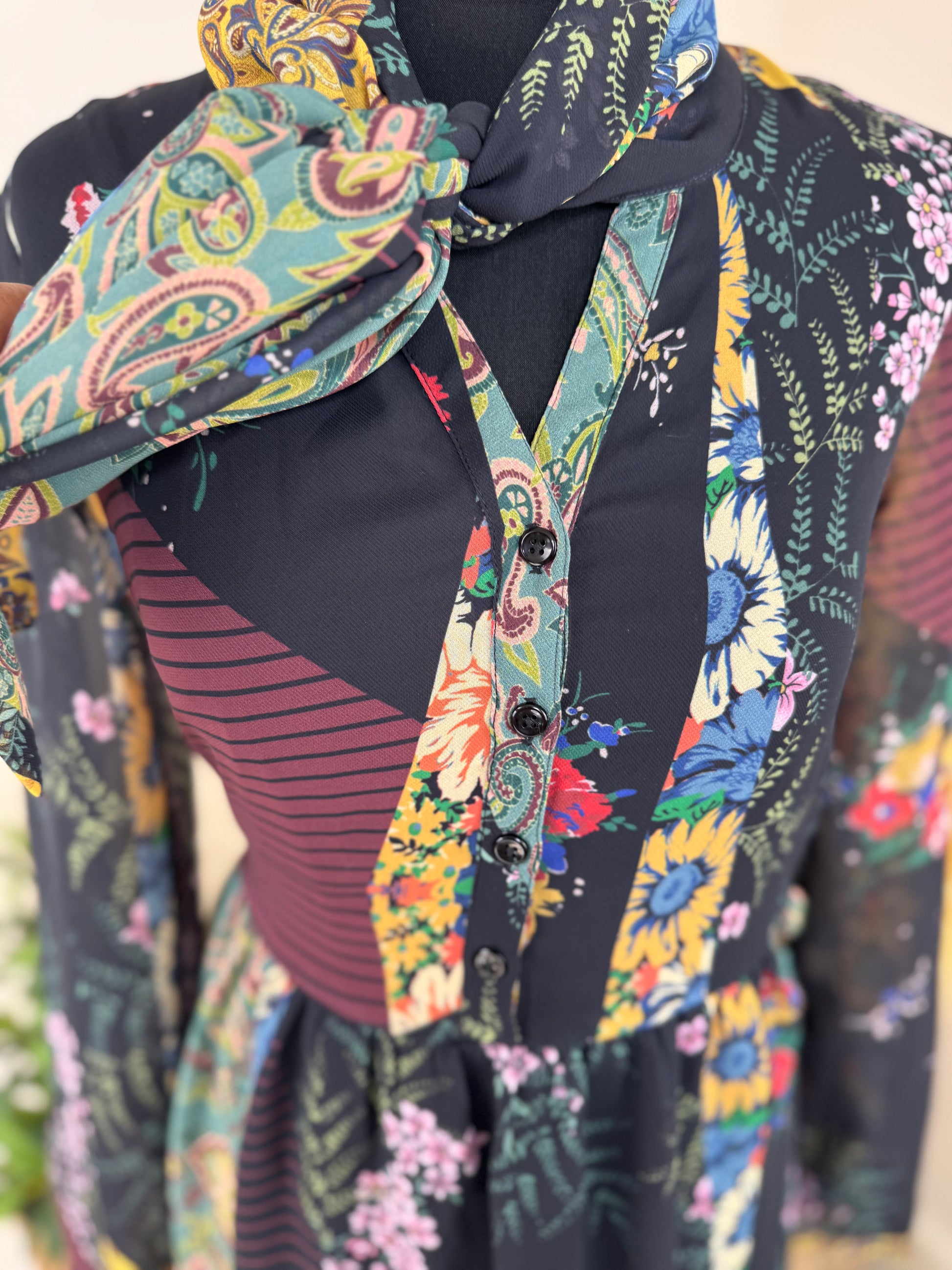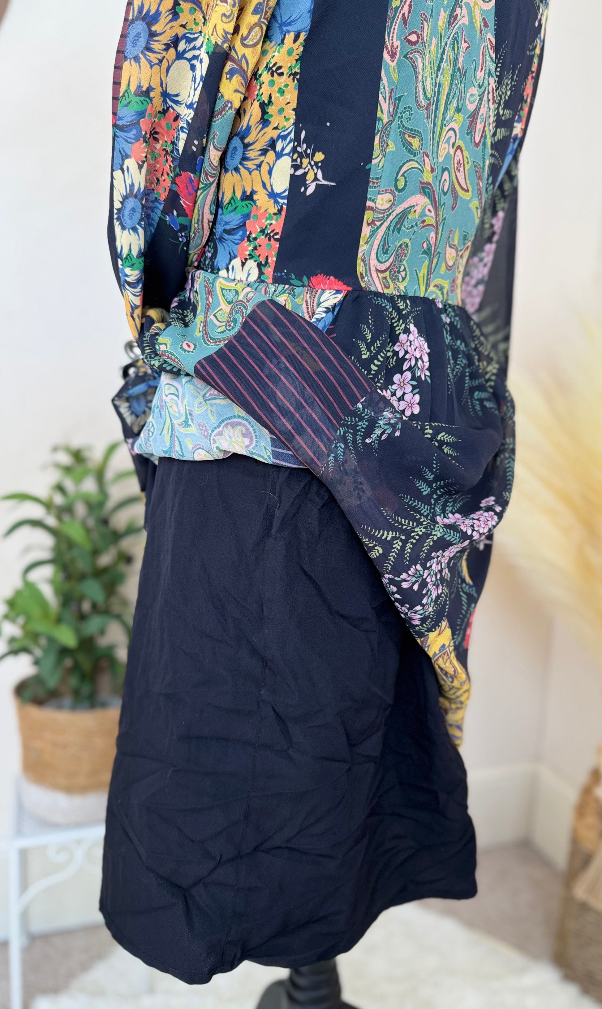 This eye-catching patchwork floral midi dress is full of vintage-inspired charm. With a bold mix of floral prints, soft sheer sleeves, and a statement tie neckline, it’s a standout piece for any occasion. The midi length makes it versatile — style it with boots for autumn days, or heels for evening plans.