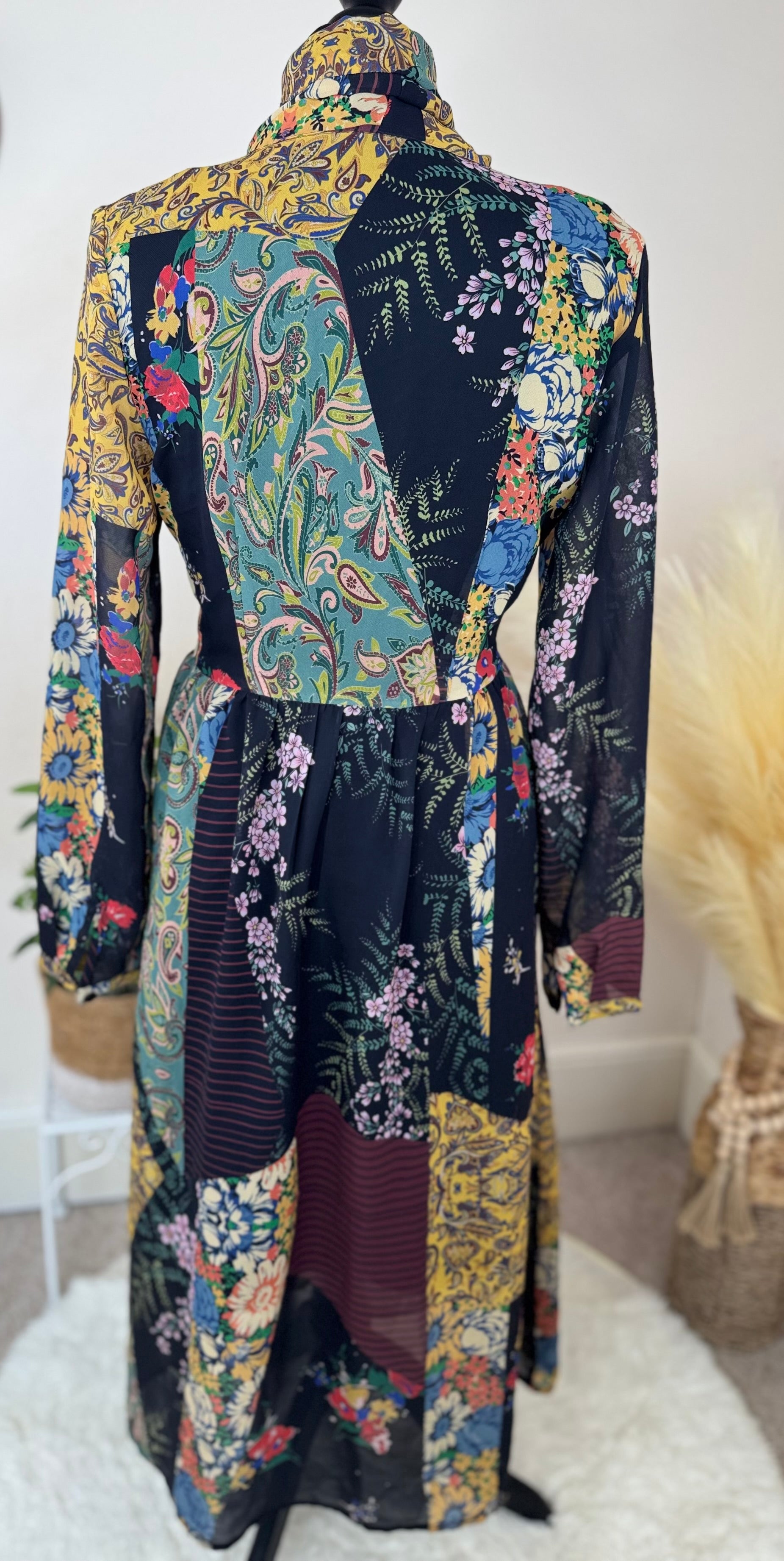 Women’s Boho Patchwork Midi Dress – Tie Neck Long Sleeve UK Size 10