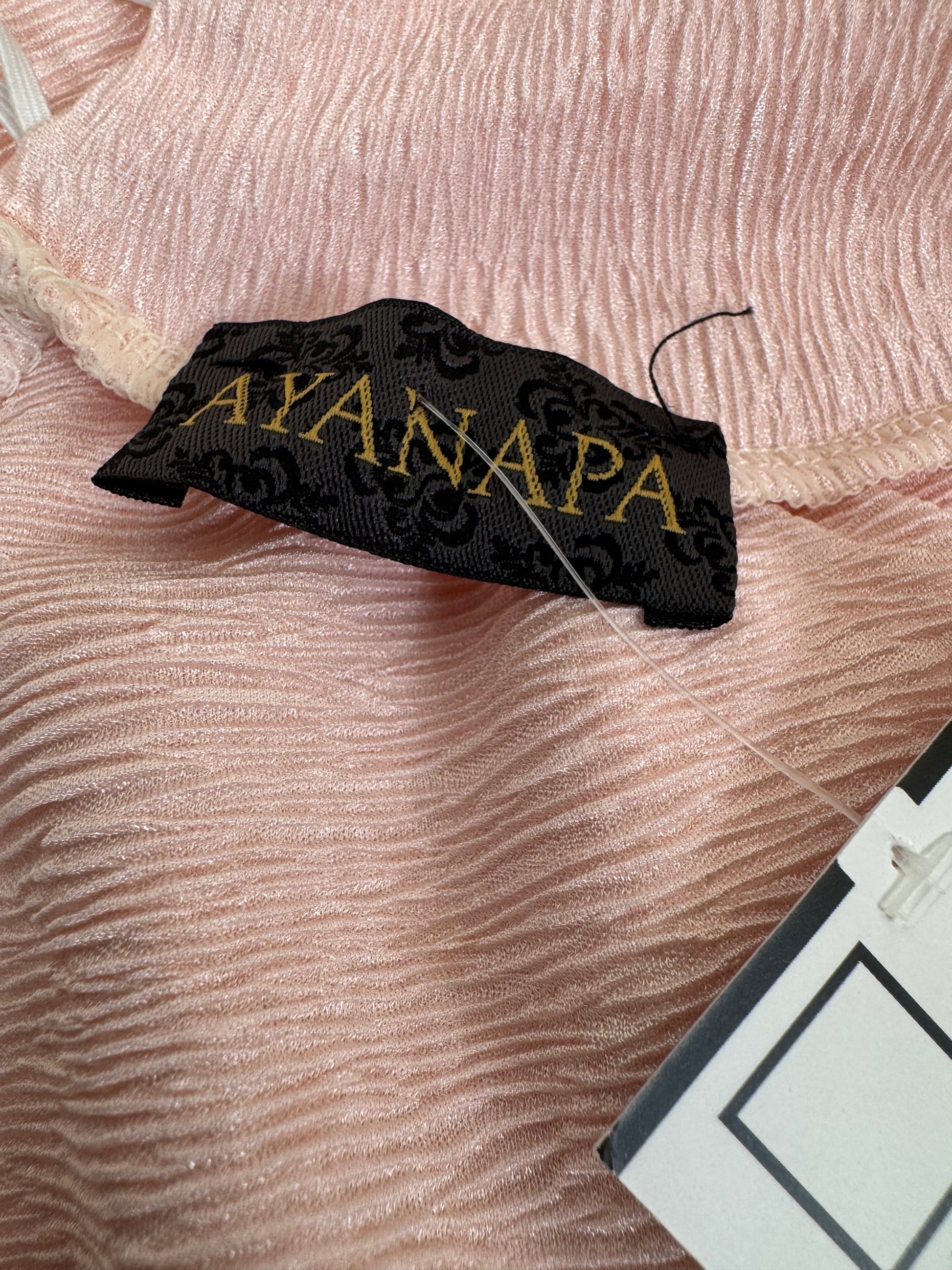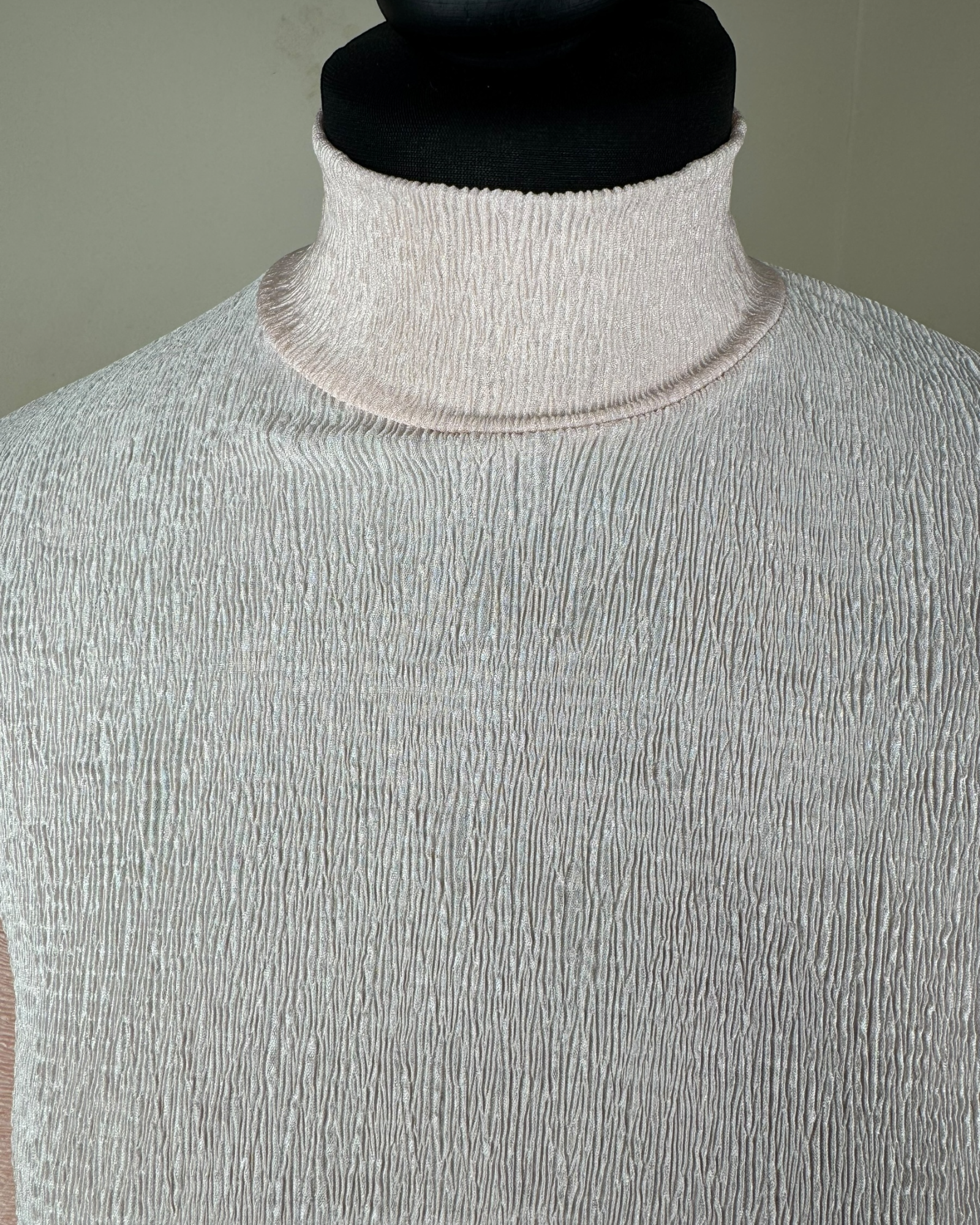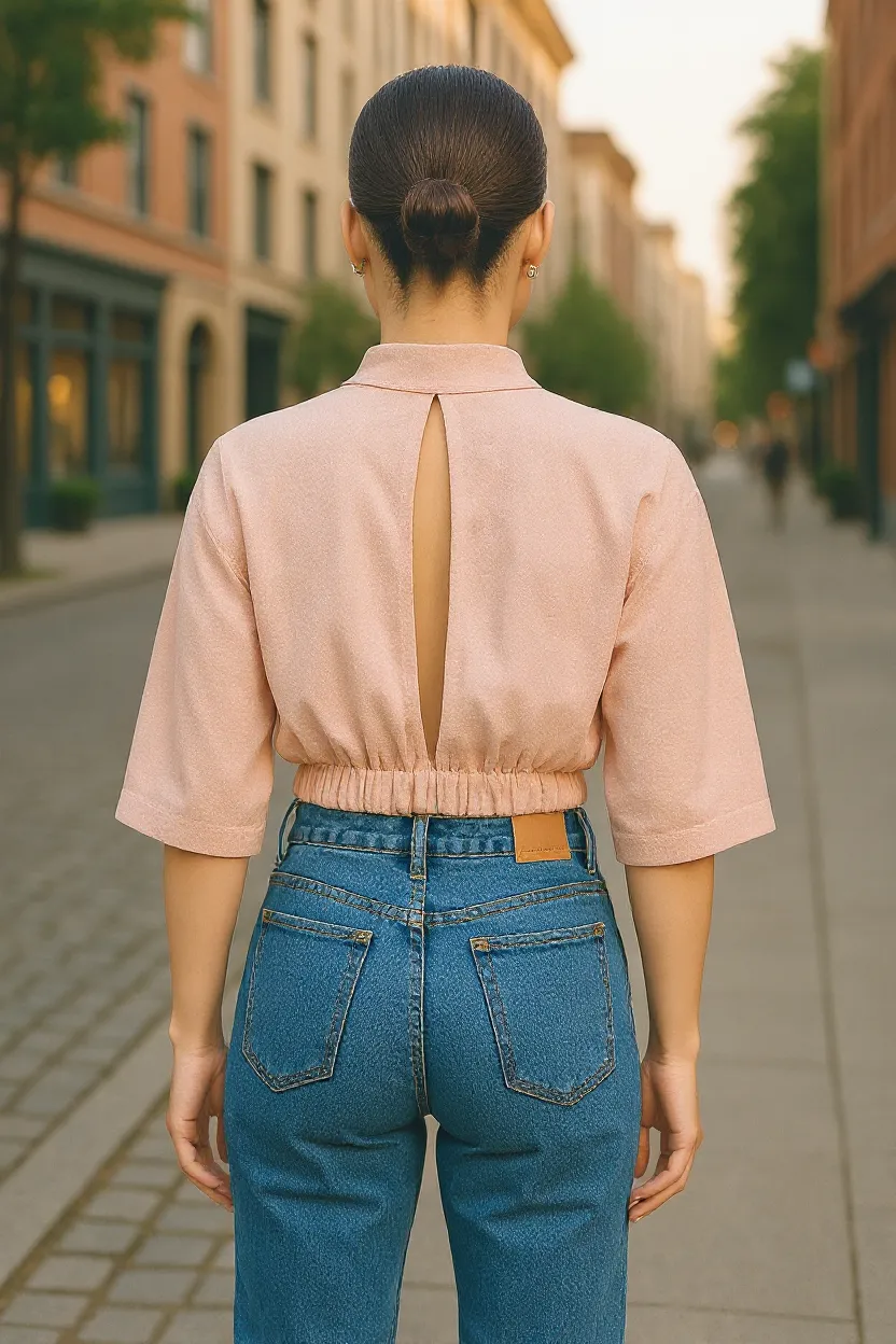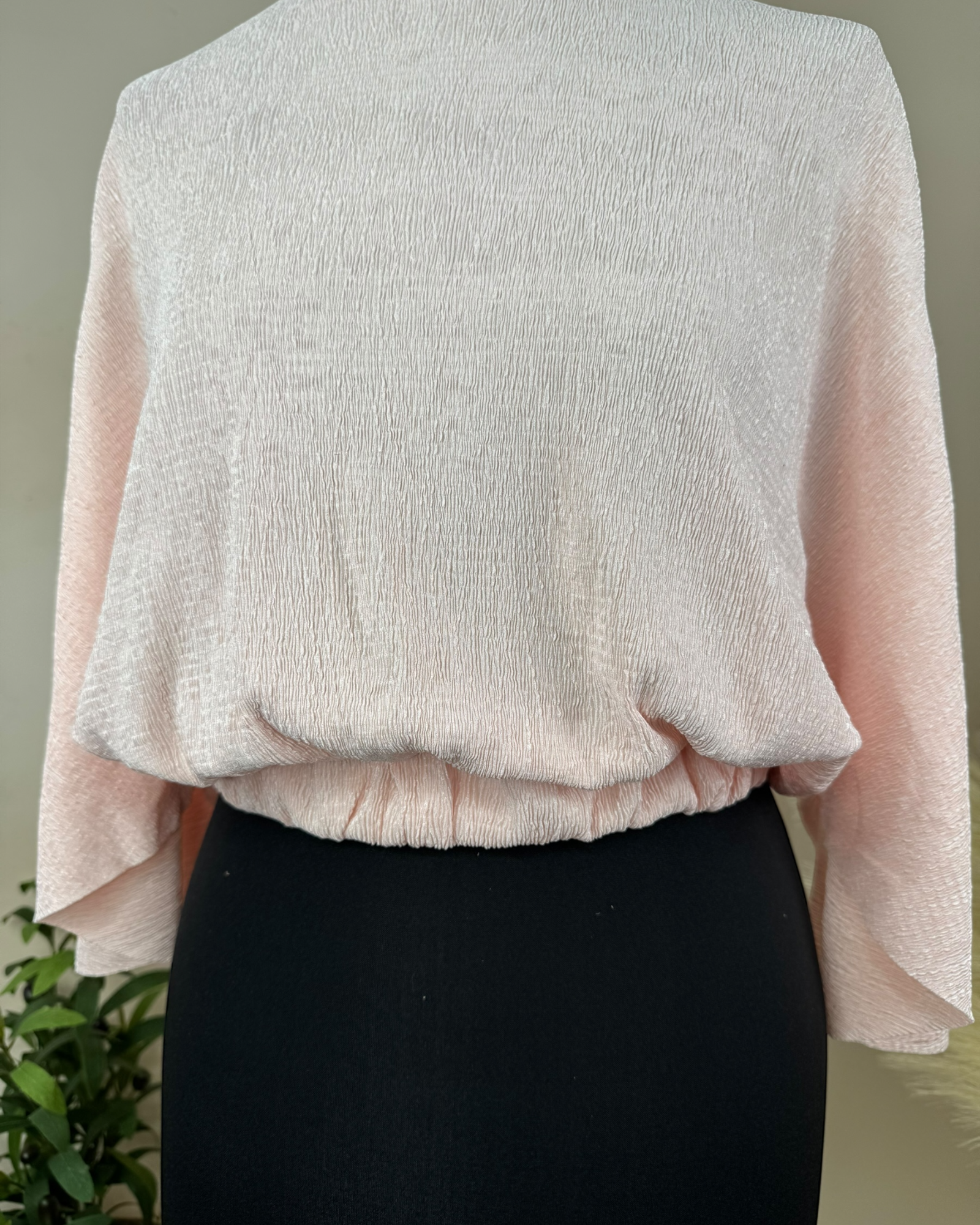 Soft as a whisper, this blush pink blouse brings elegance with a touch of surprise. Designed with a high neckline, floaty sleeves, and a striking open-back cut with pearl button fastening, it’s a statement piece that balances sophistication with effortless style.