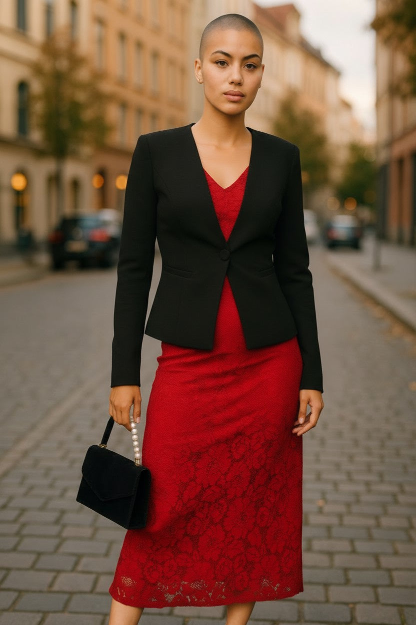 Turn heads in this elegant red lace midi dress, designed with a fitted bodice, delicate floral lace overlay, and flattering sleeveless cut. Perfect for weddings, parties, or evening occasions.