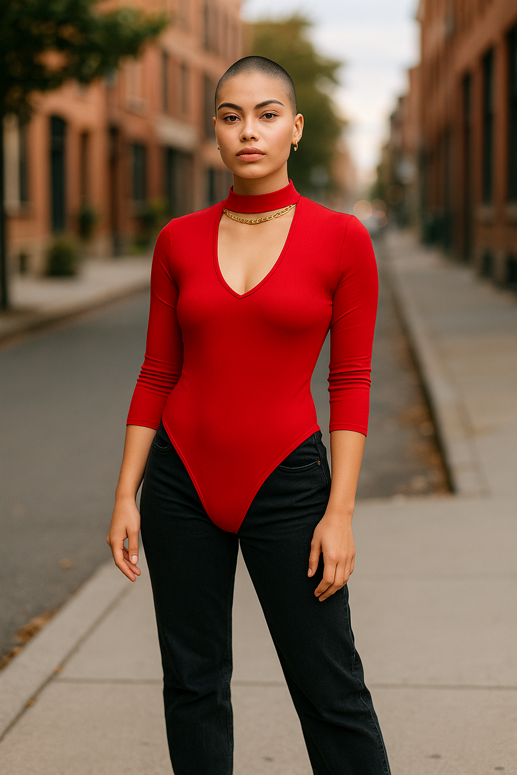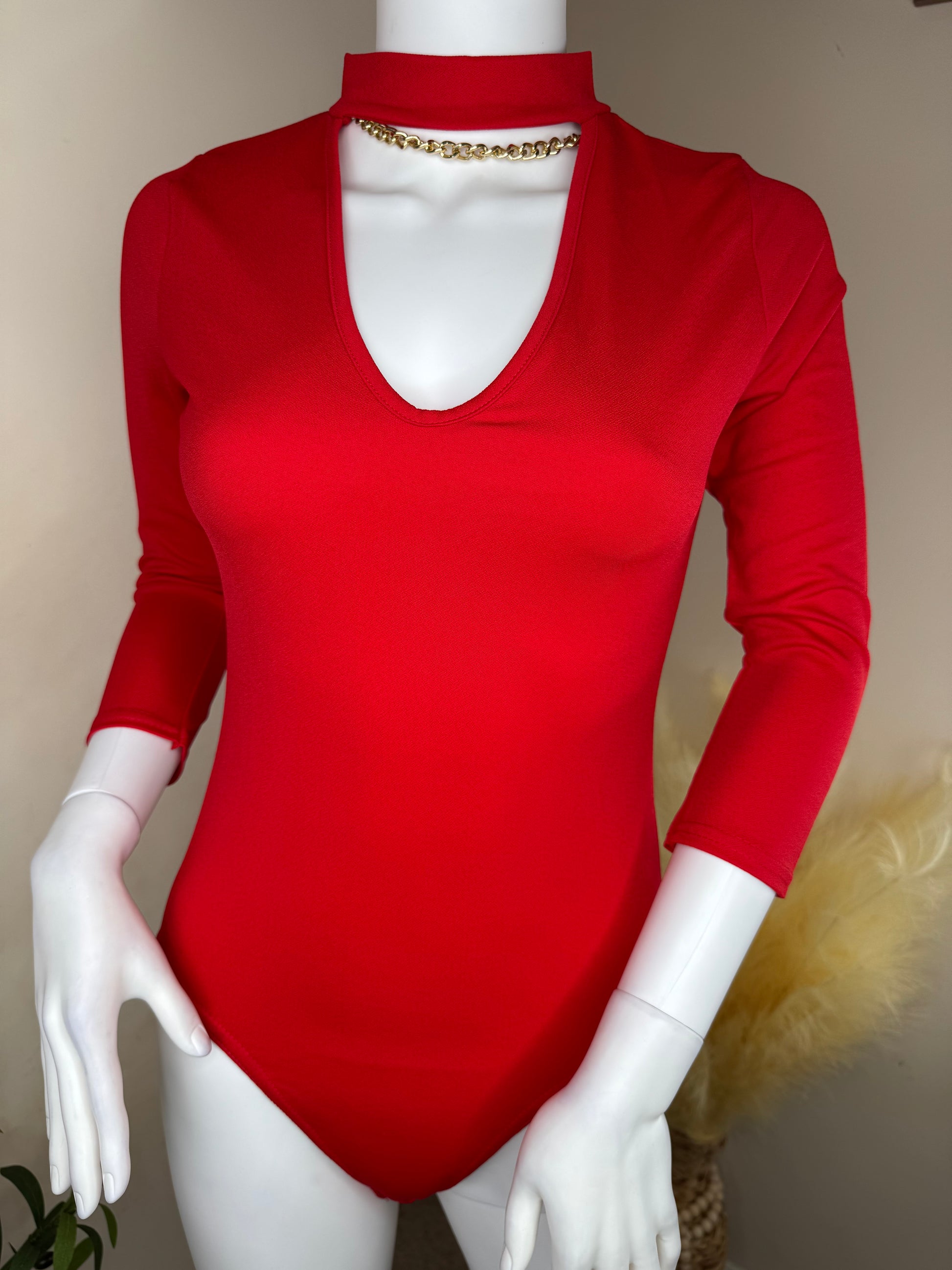 A striking red bodysuit designed with a choker neckline and gold chain detail. 3/4 sleeves and a deep V front create a bold yet elegant silhouette. Crafted in a fitted stretch fabric, this piece works beautifully with jeans, skirts, or layered under blazers for both casual and evening looks.
