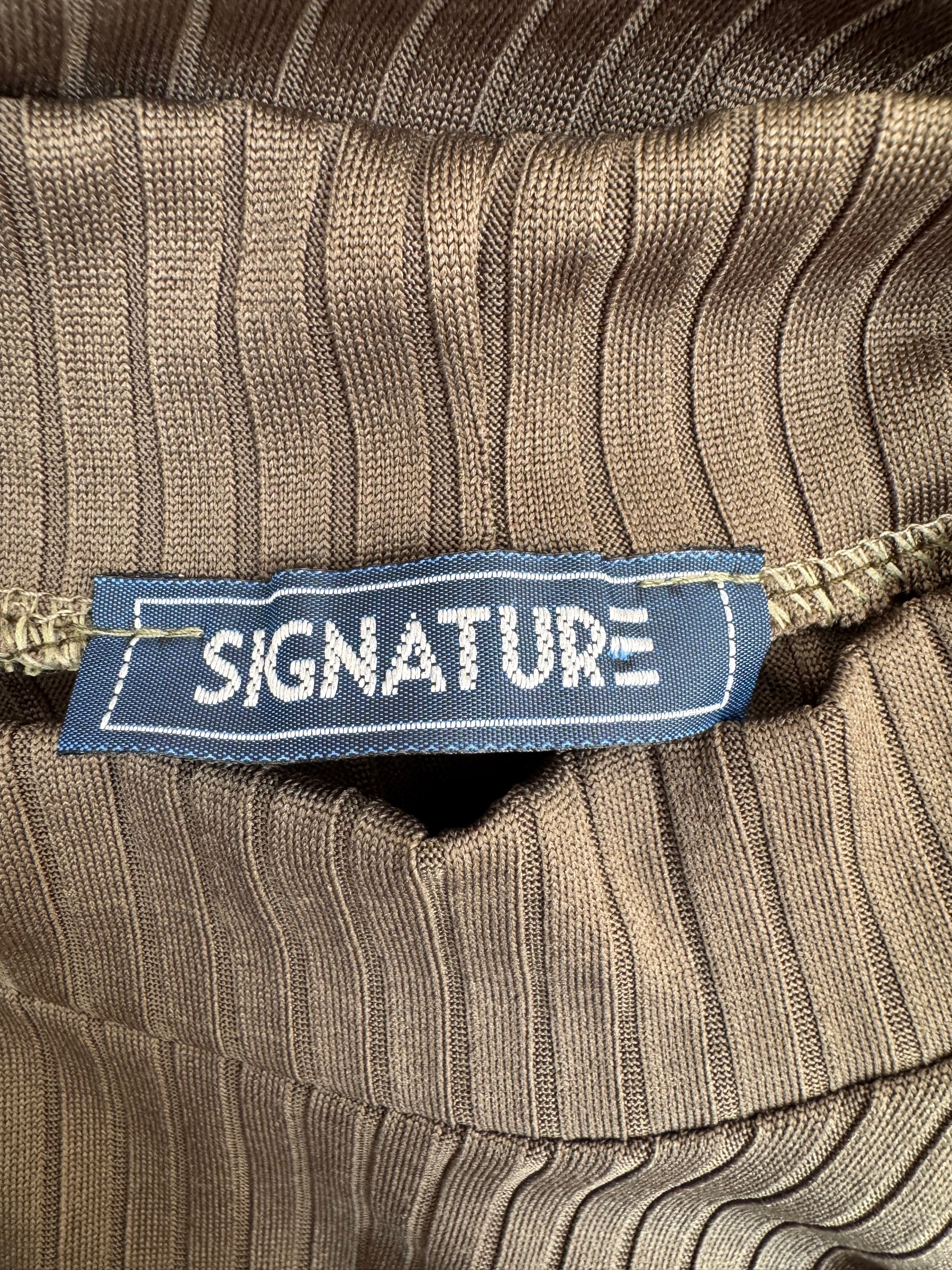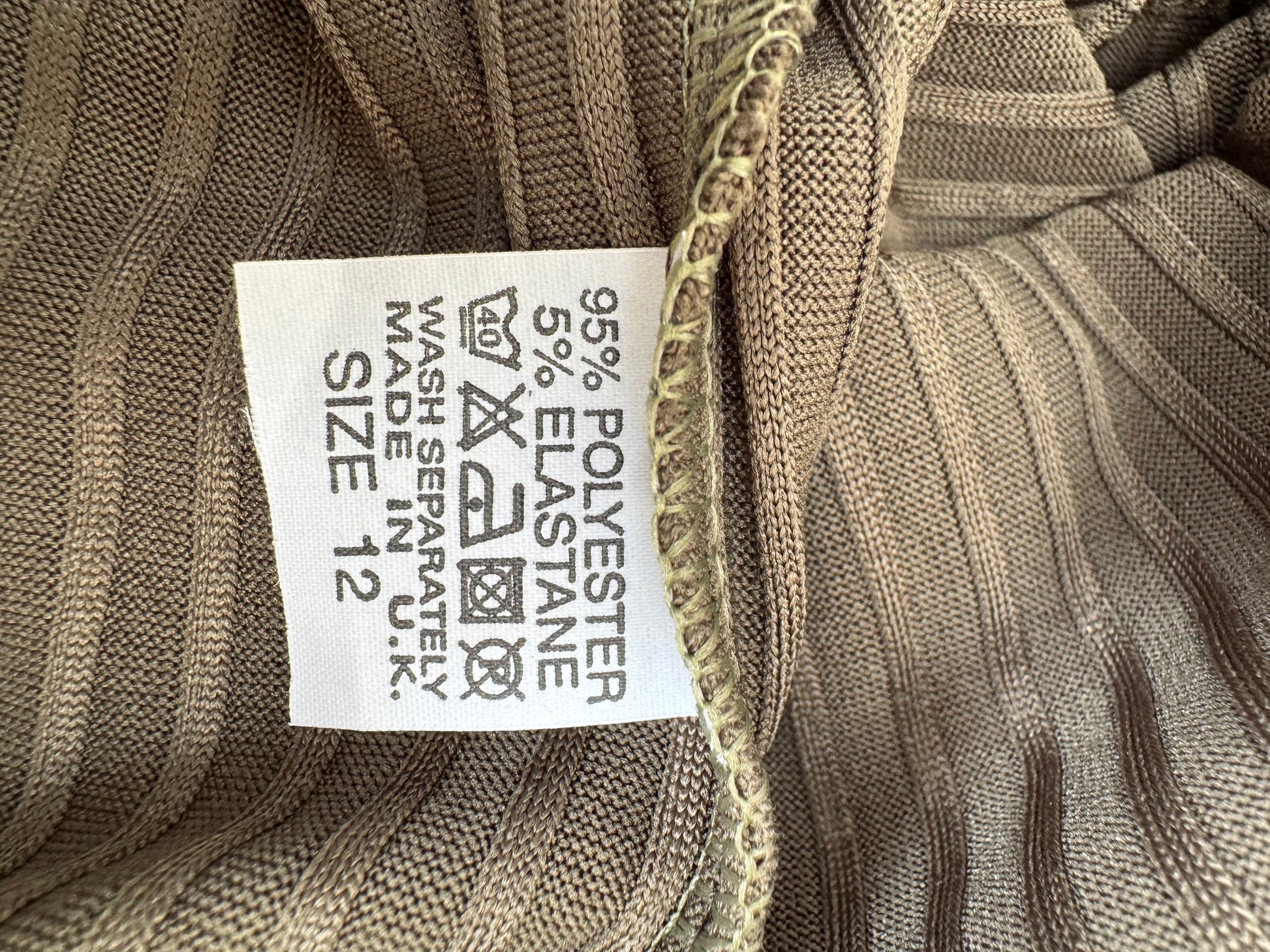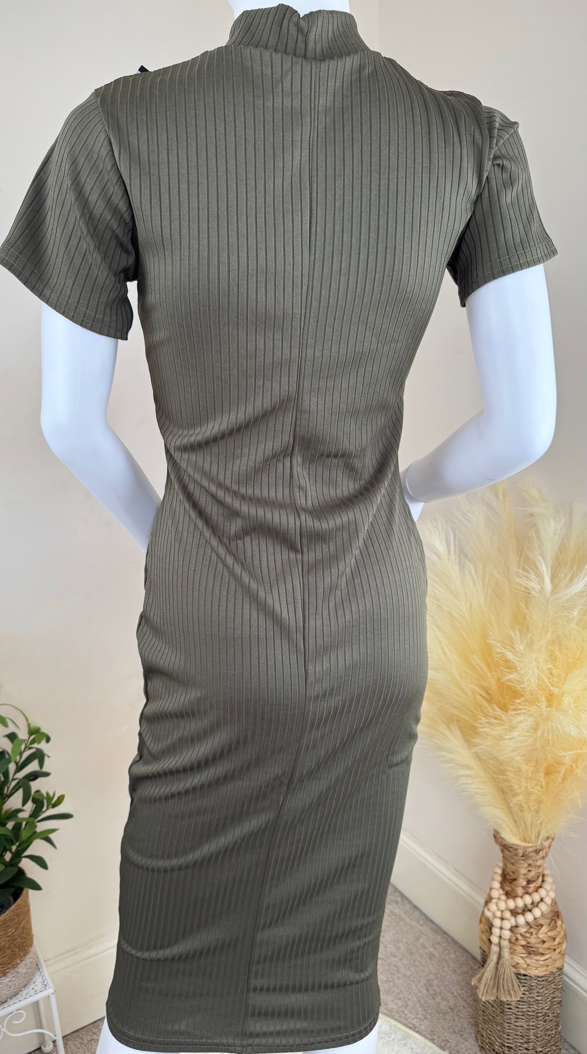 Women’s Ribbed Midi Dress – Khaki Fitted Mock Neck Short Sleeve UK 12 & 14