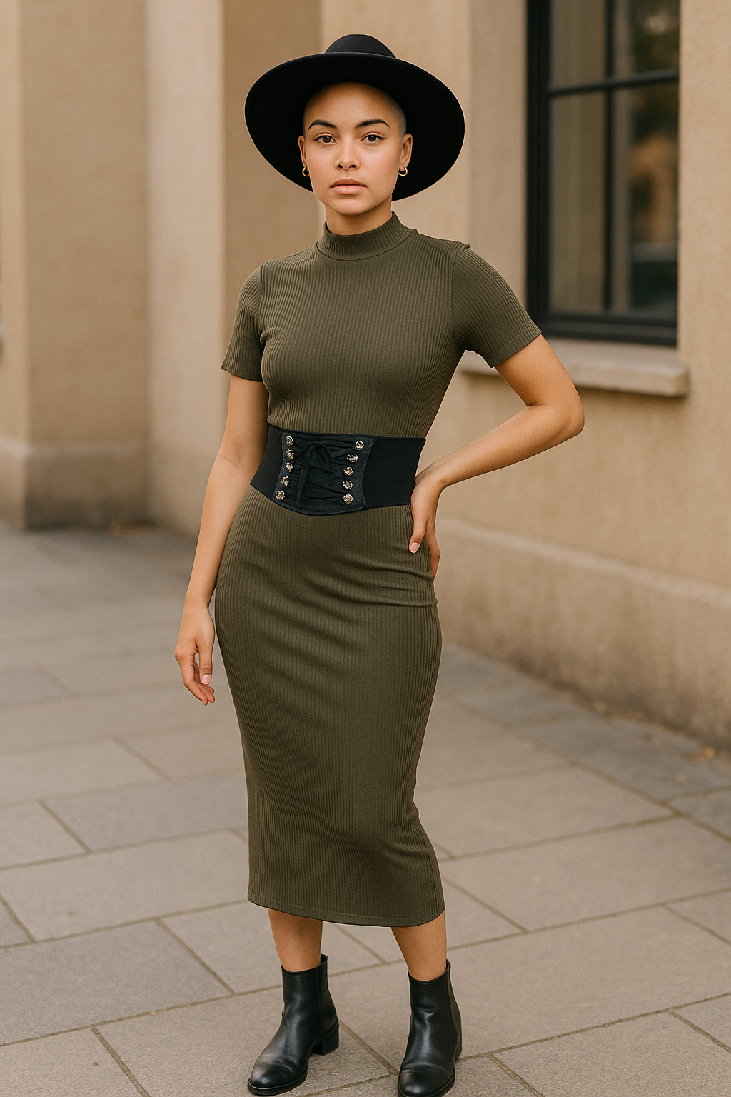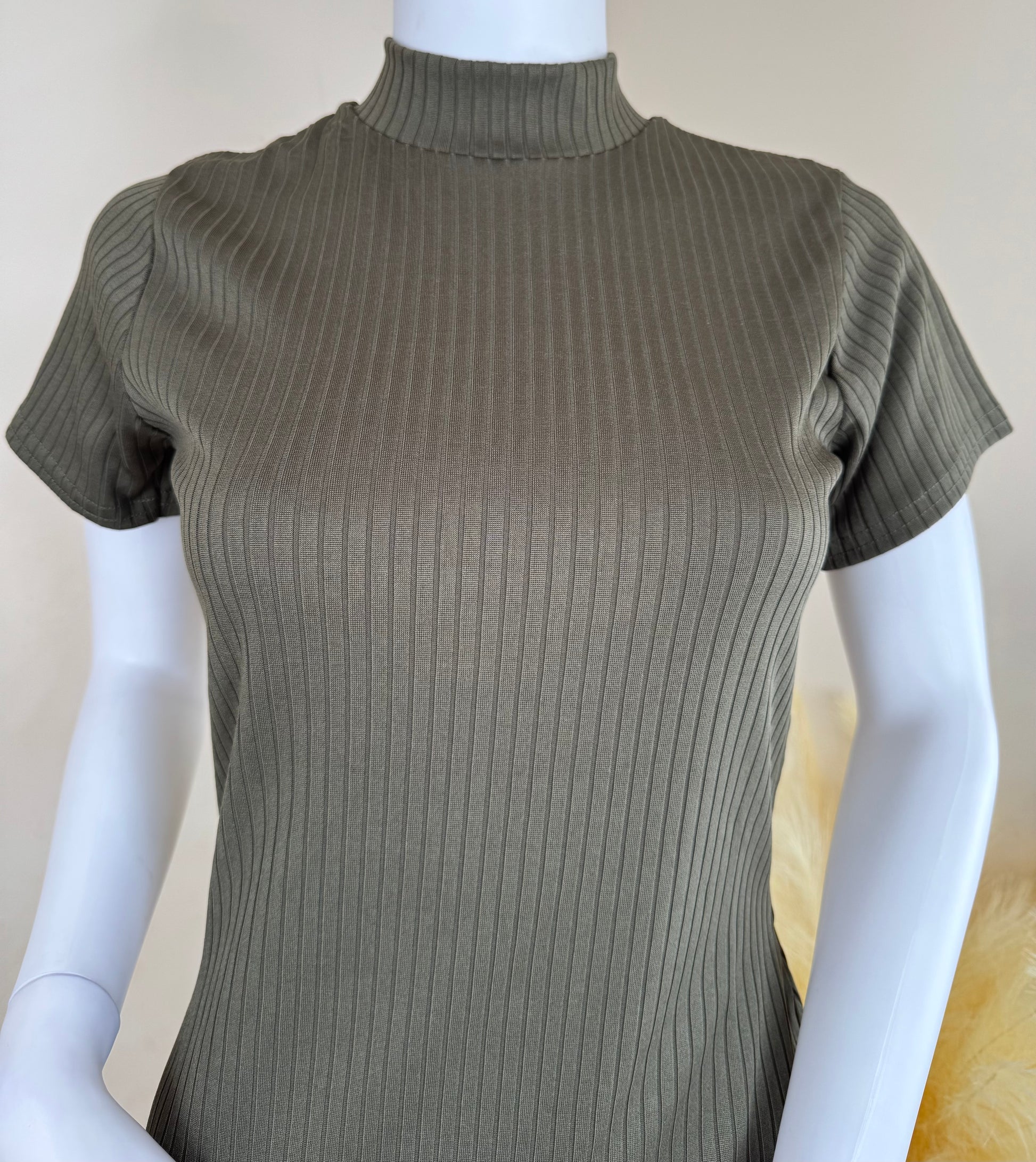 A classic fitted midi dress with soft ribbed stretch fabric that flatters every curve. The short sleeves and high neckline keep the look sleek and wearable for any season, while the olive green tone adds a timeless touch.