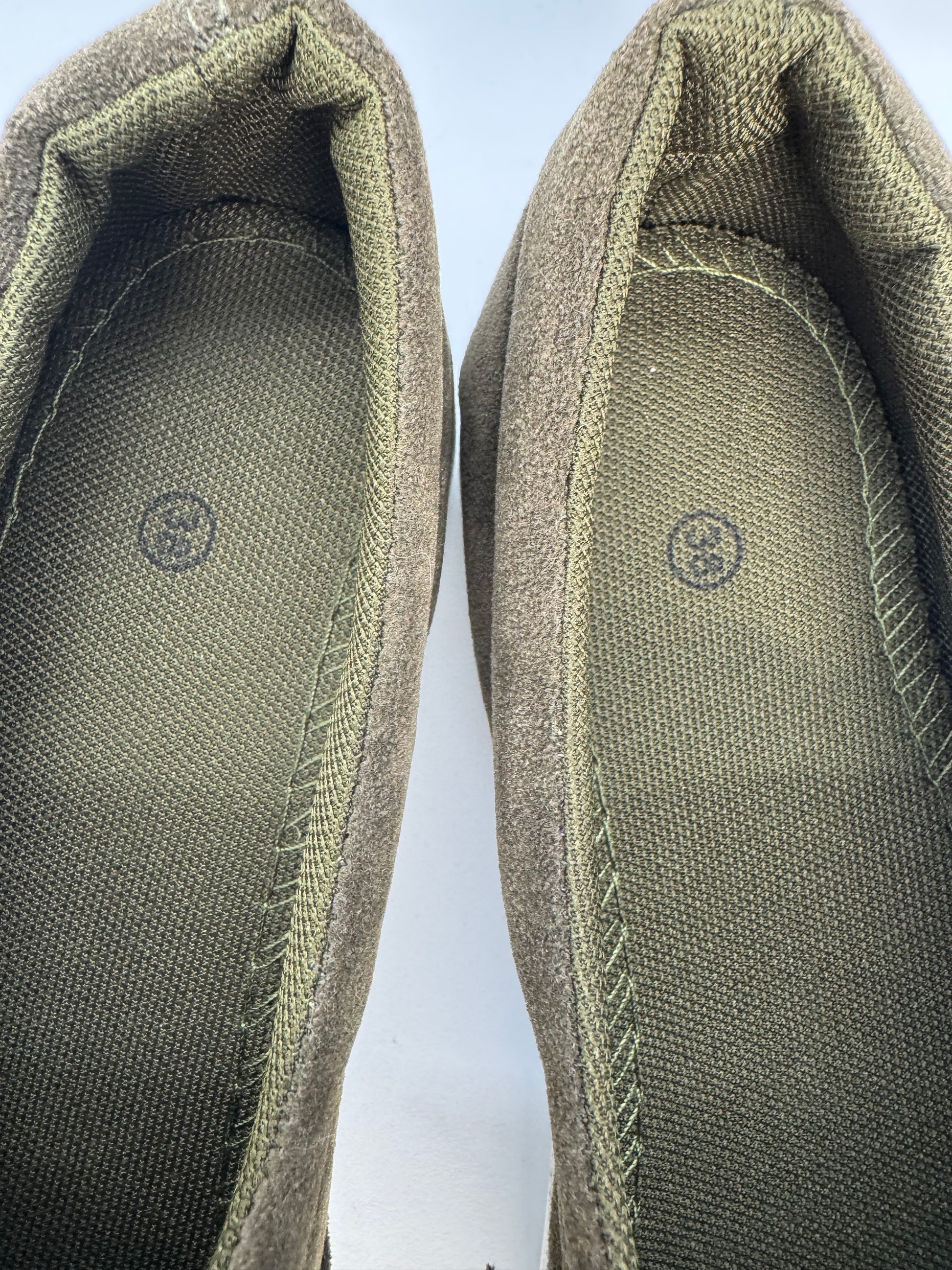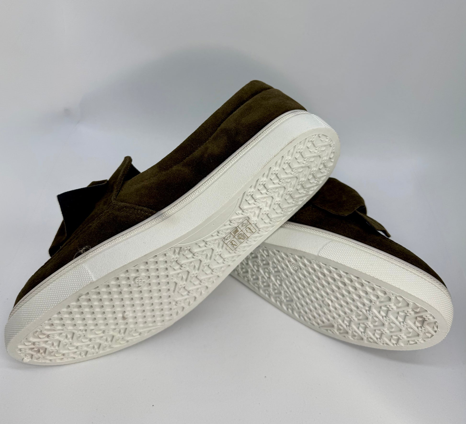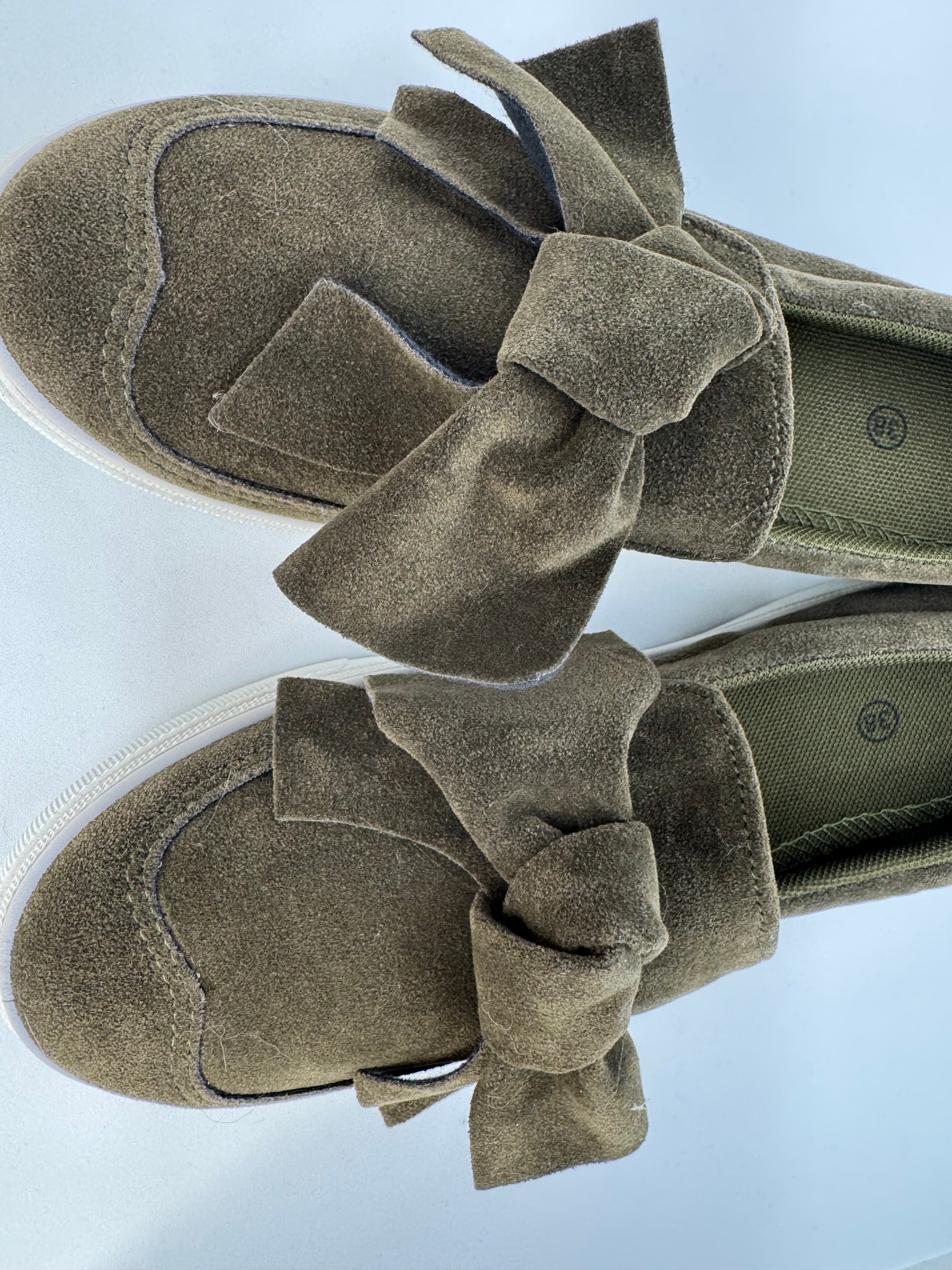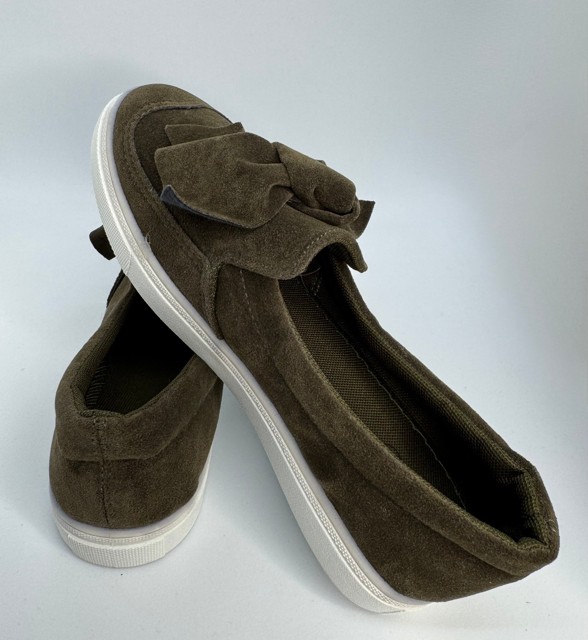 Step into everyday comfort with these women’s khaki green slip-on trainers, UK size 5 / EU 38. Designed with a soft suede-feel finish and an oversized bow detail across the top, they add a playful twist to casual outfits.