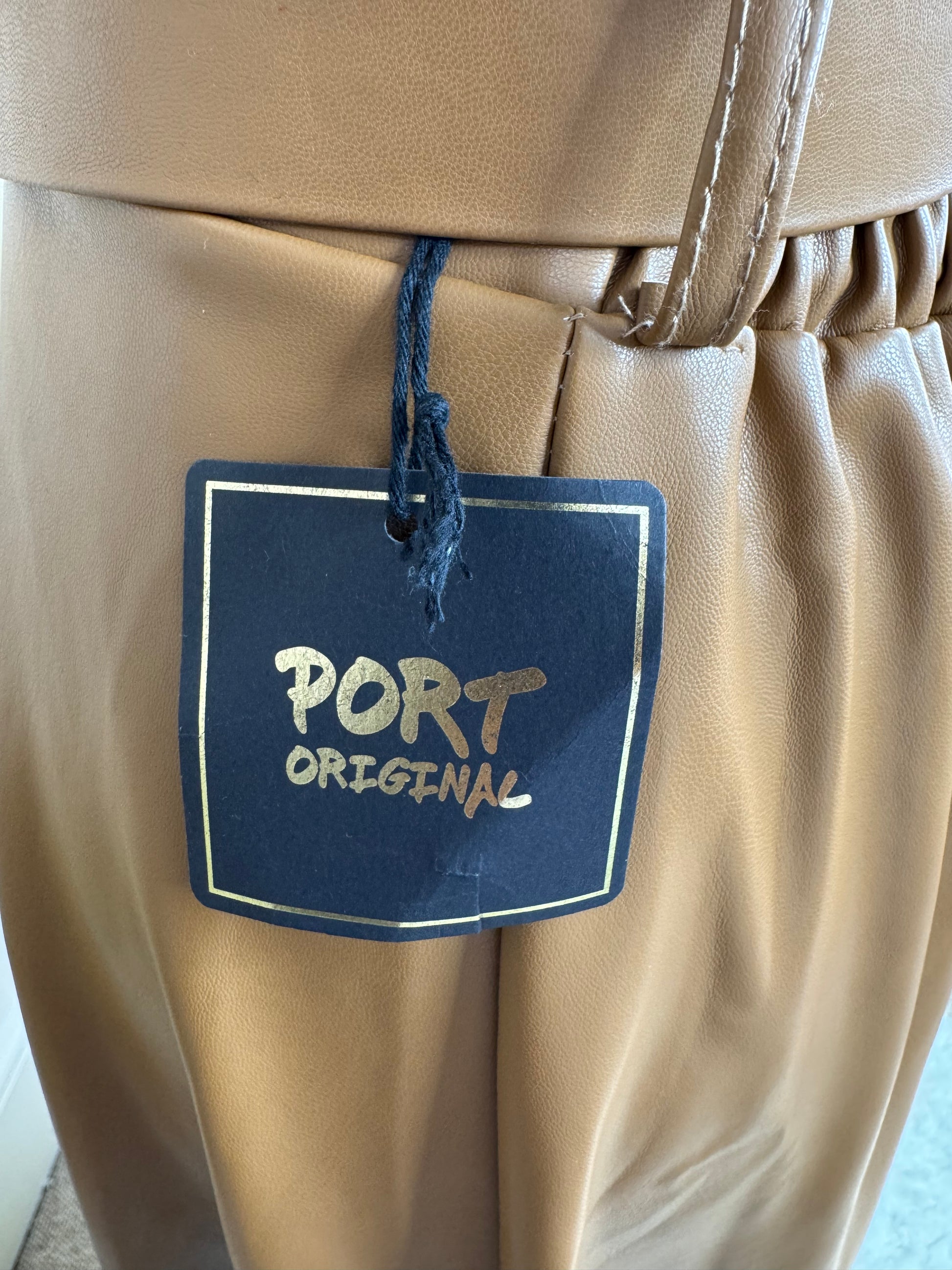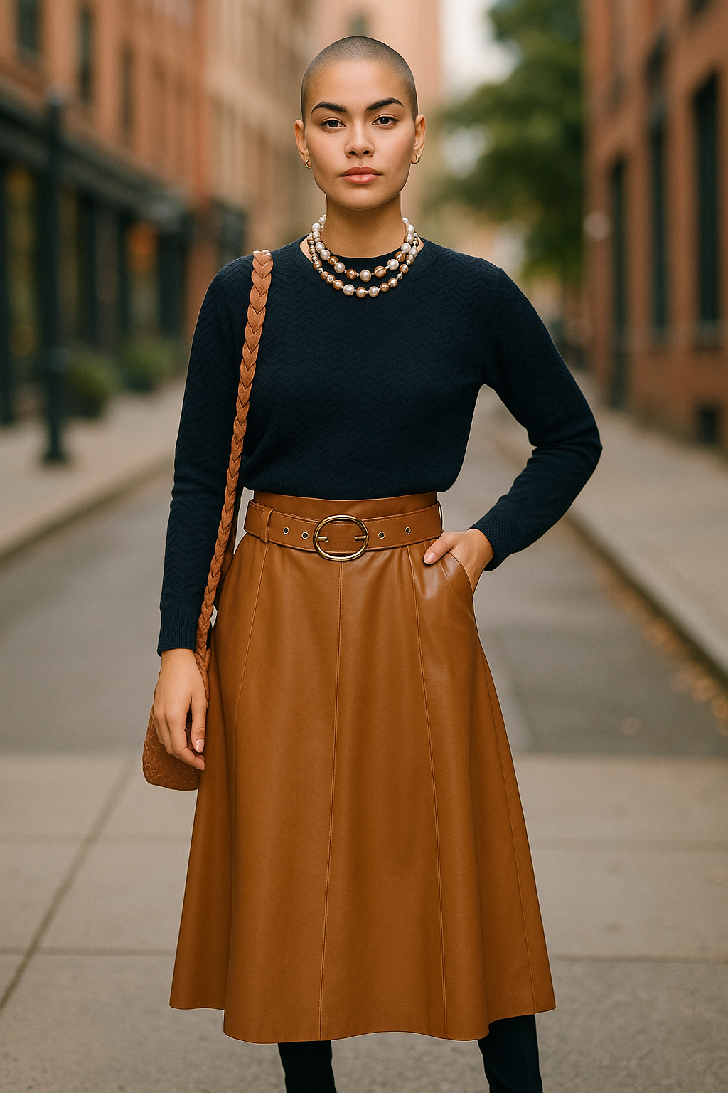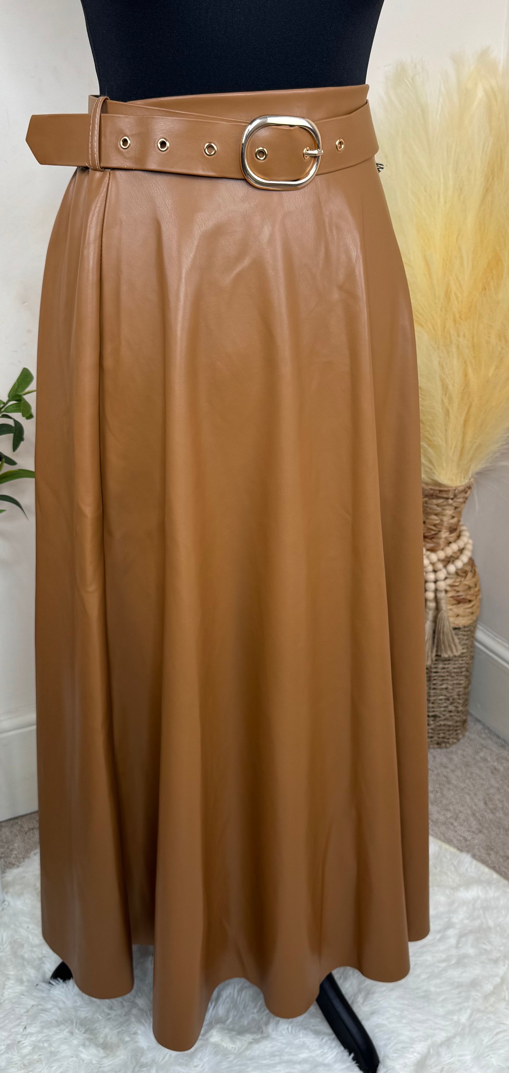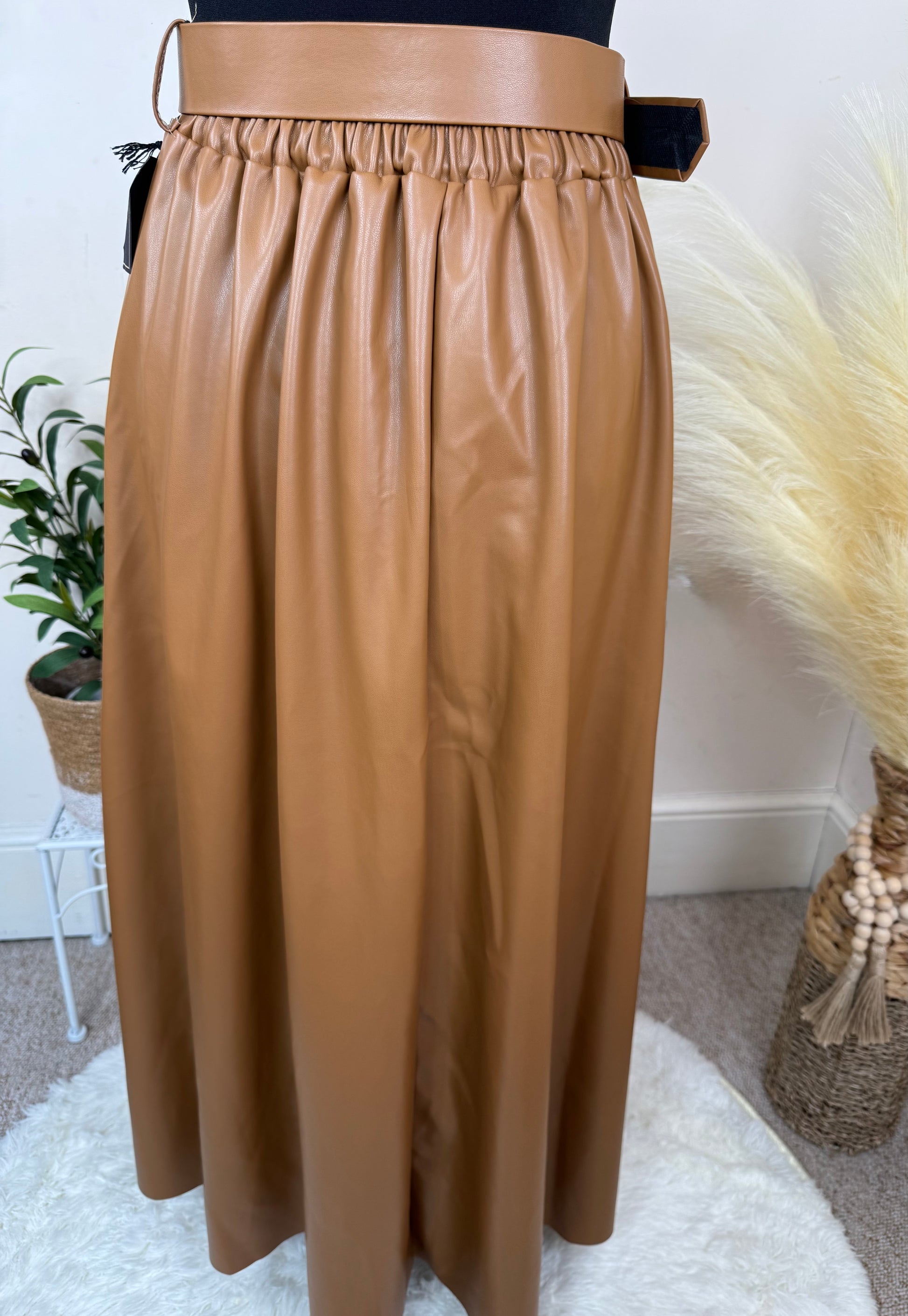A timeless skirt with a modern edge. This tan faux leather midi features a flattering A-line cut and comes with a matching belt to define the waist. Easy to style for work, weekends, or evenings — pair with knits, blouses, or simple tees for endless looks.