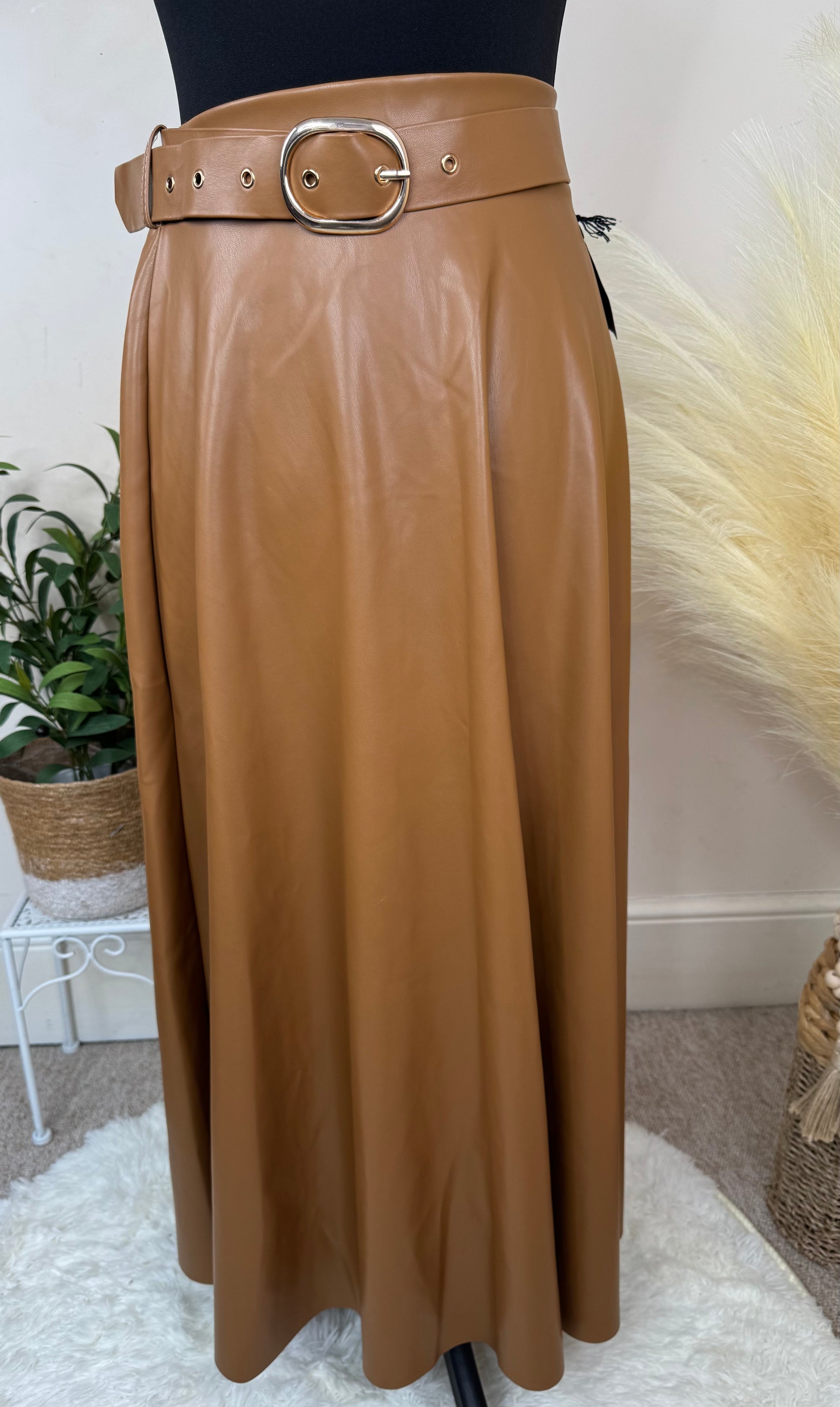 Women’s Brown Faux Leather Midi Skirt – A-Line High Waist Belted Size UK 10
