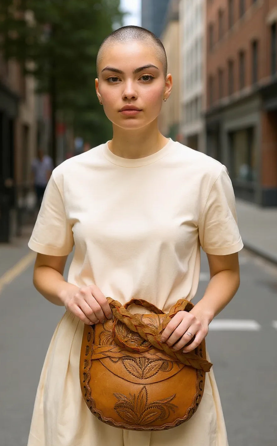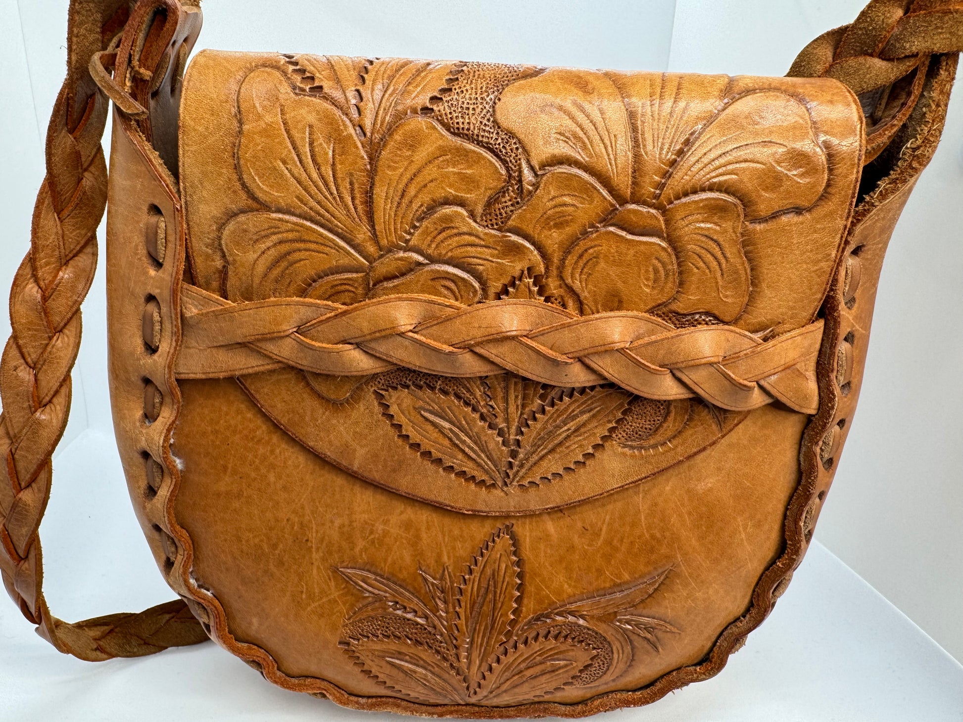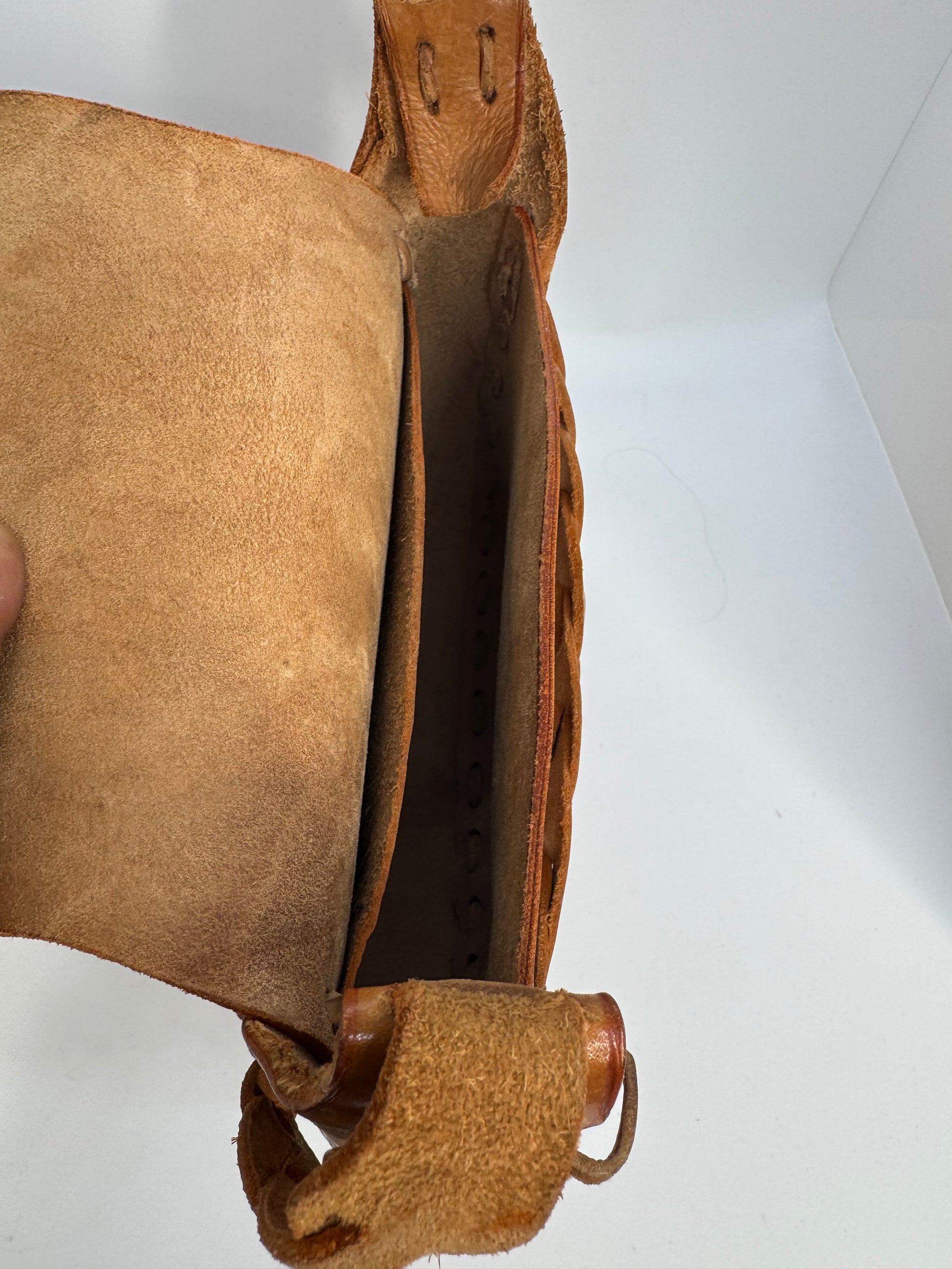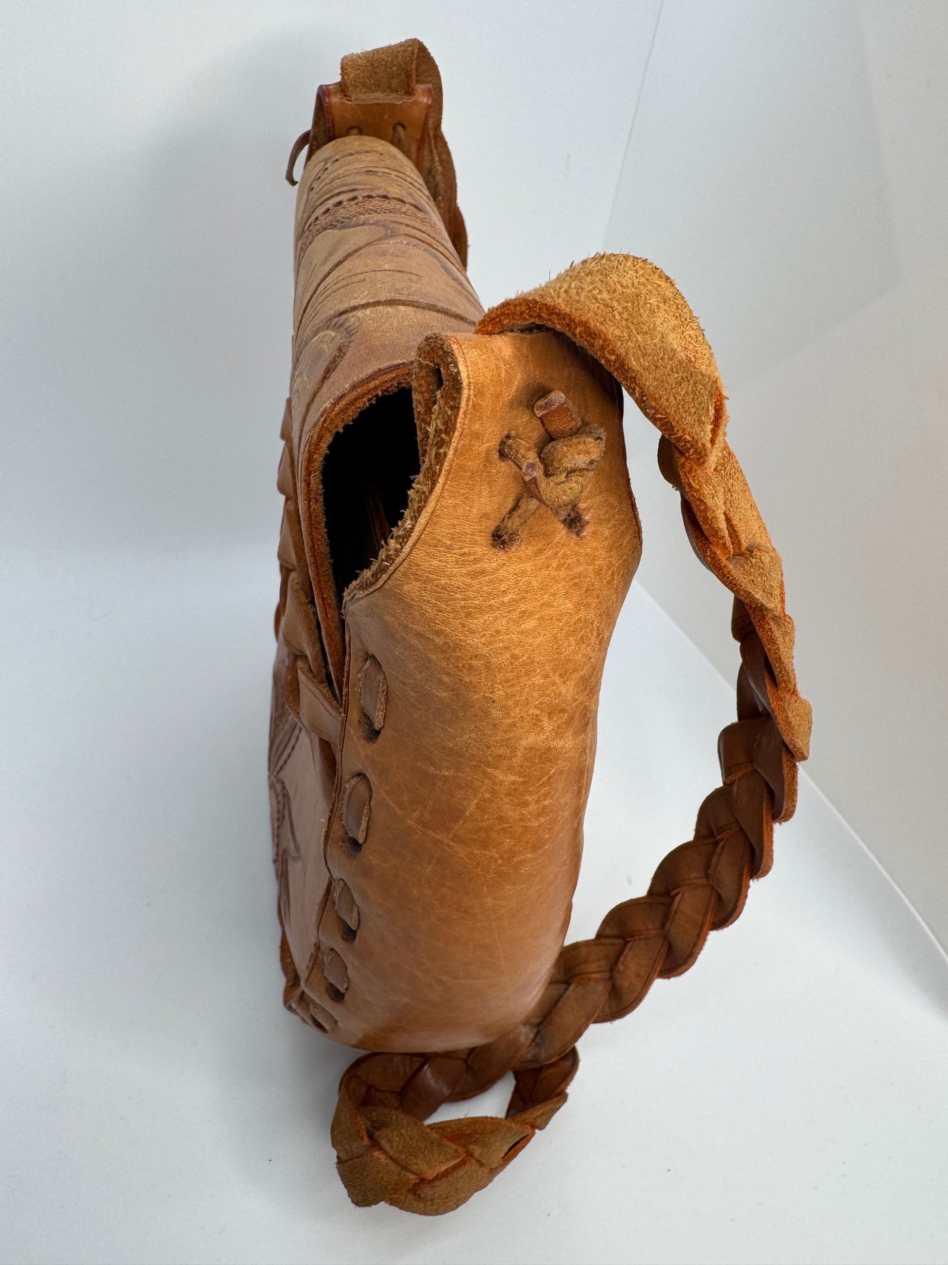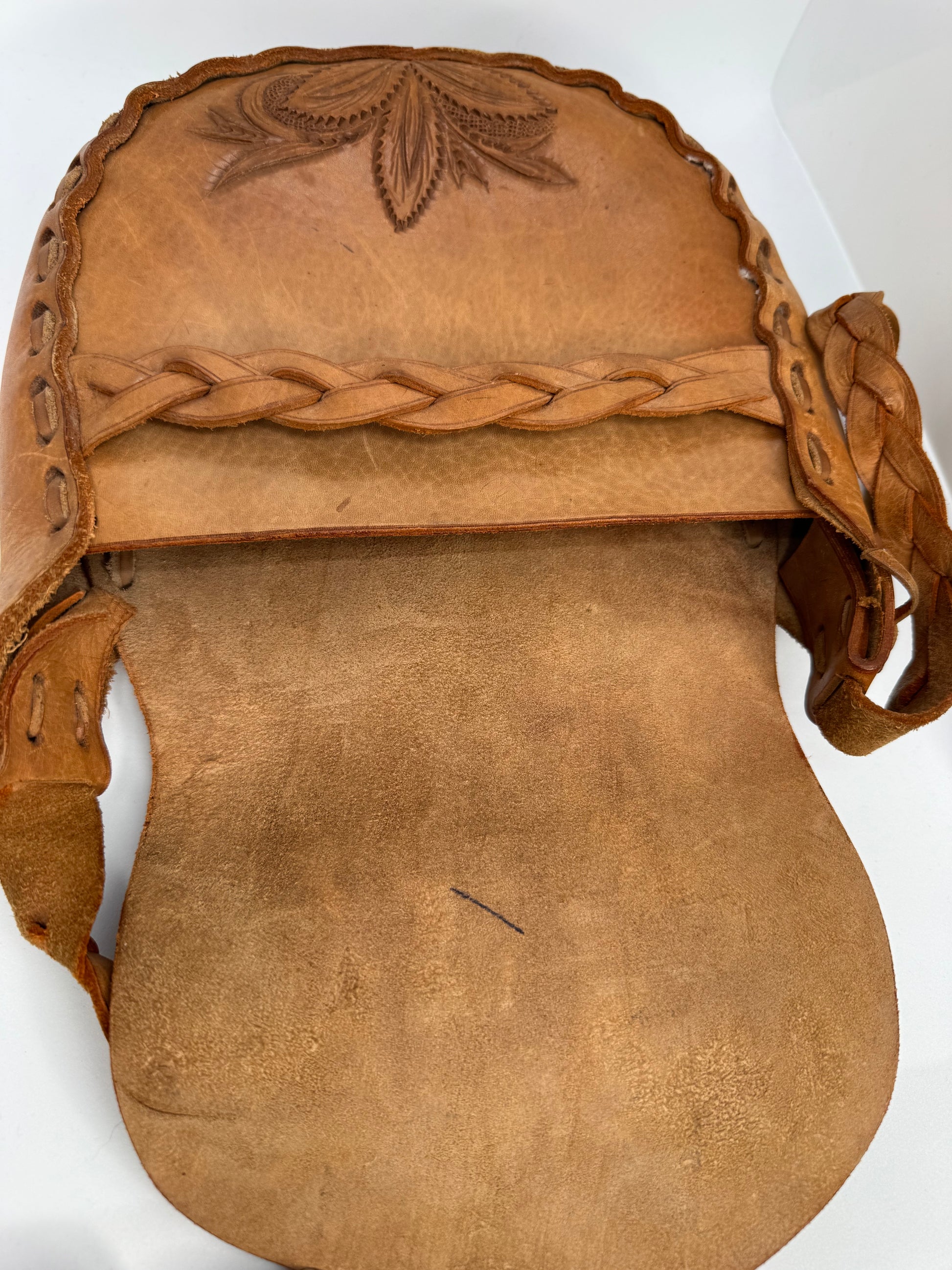 A timeless boho treasure, crafted in rich tan leather with hand-tooled floral detailing and braided trim. This saddle-style crossbody bag carries the charm of artisan work, with a flap closure and a sturdy braided shoulder strap. Perfect for festivals, everyday outfits, or as a statement piece to bring warmth and craft into your wardrobe.