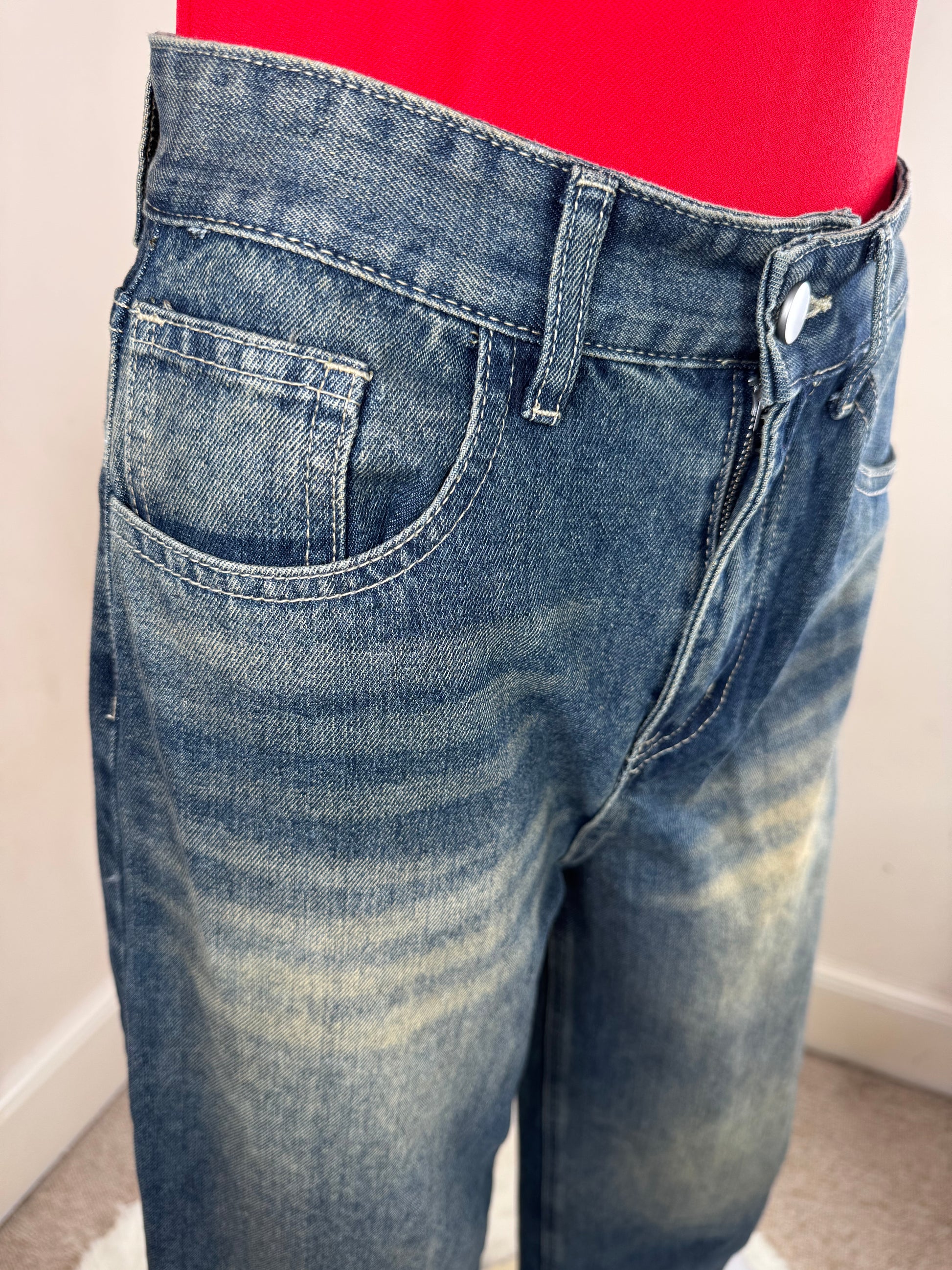 Island denim for easy days. Classic wide leg jeans in a soft washed blue, high-waisted with cropped fit. Simple and versatile – pair with knits, tops, or bodysuits for timeless style.