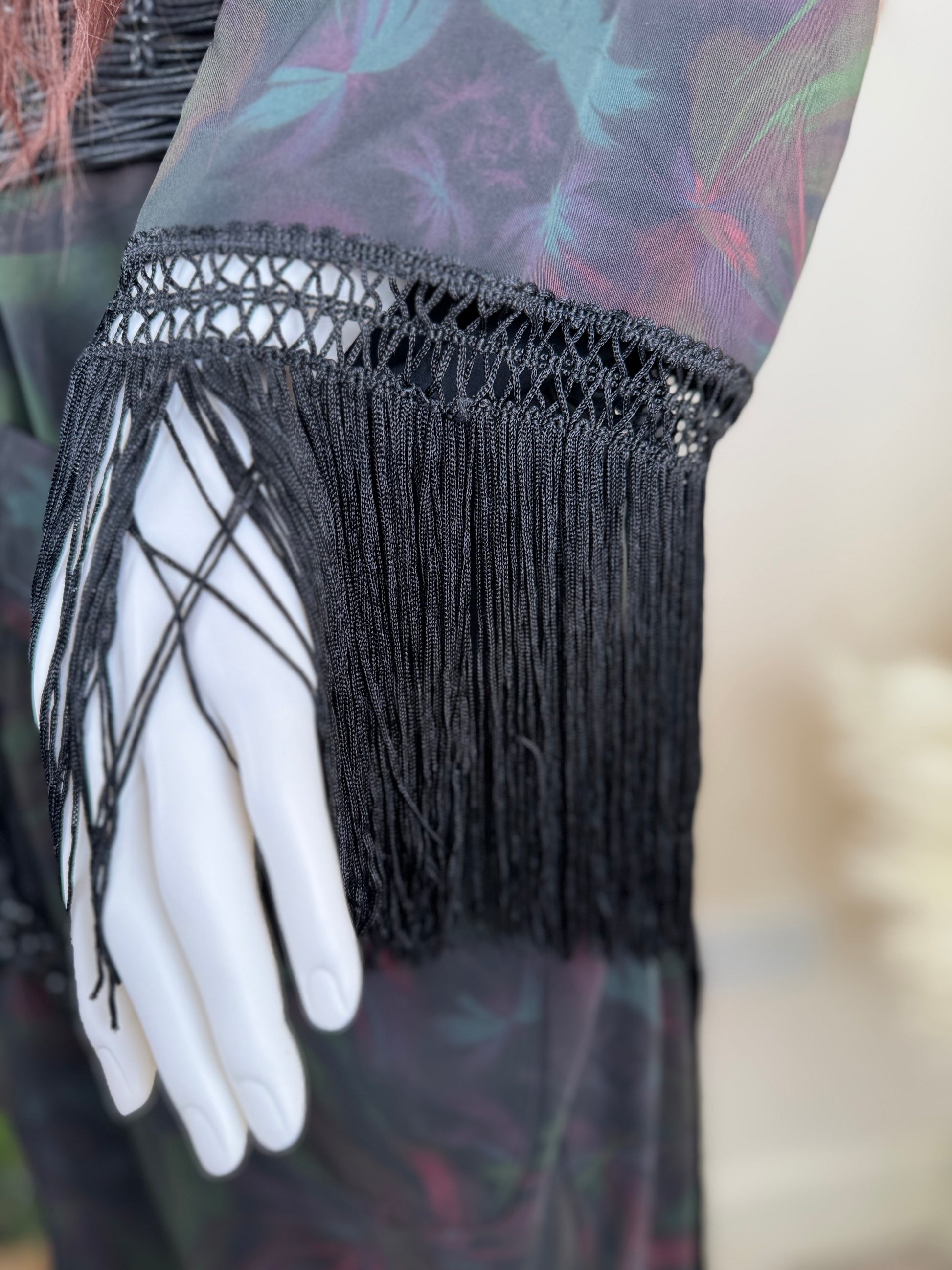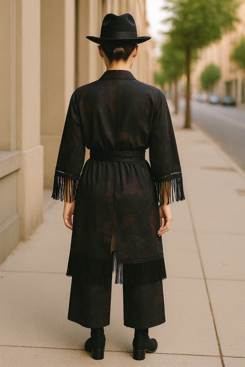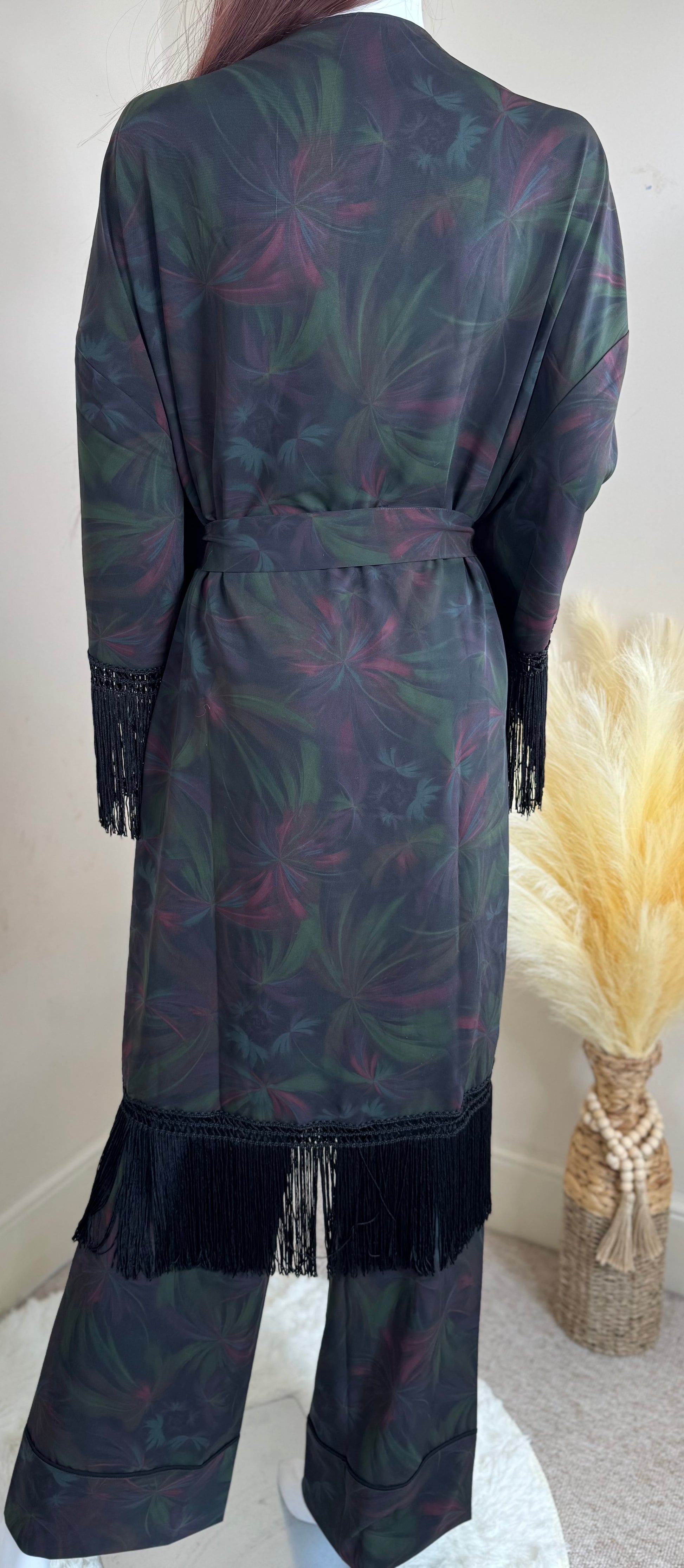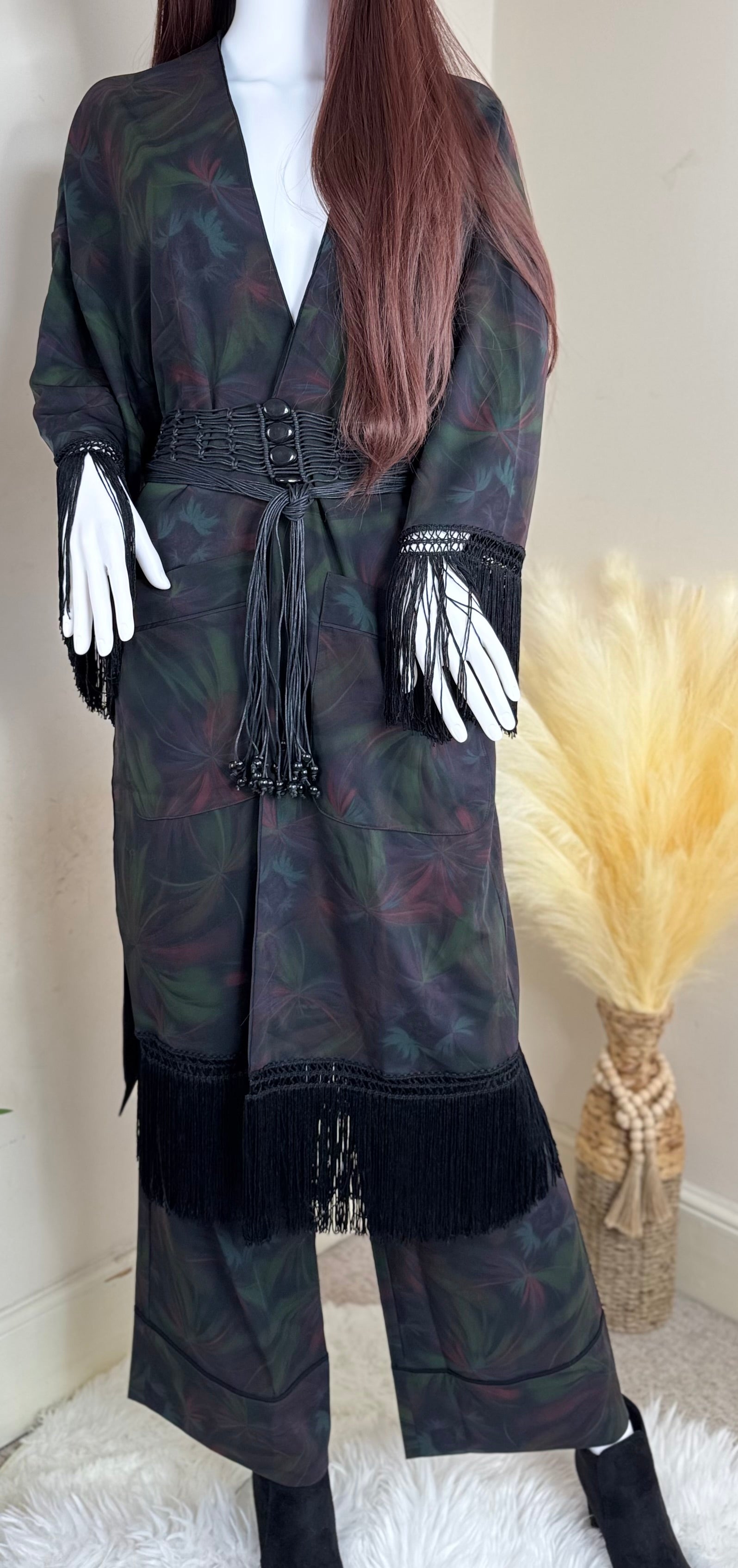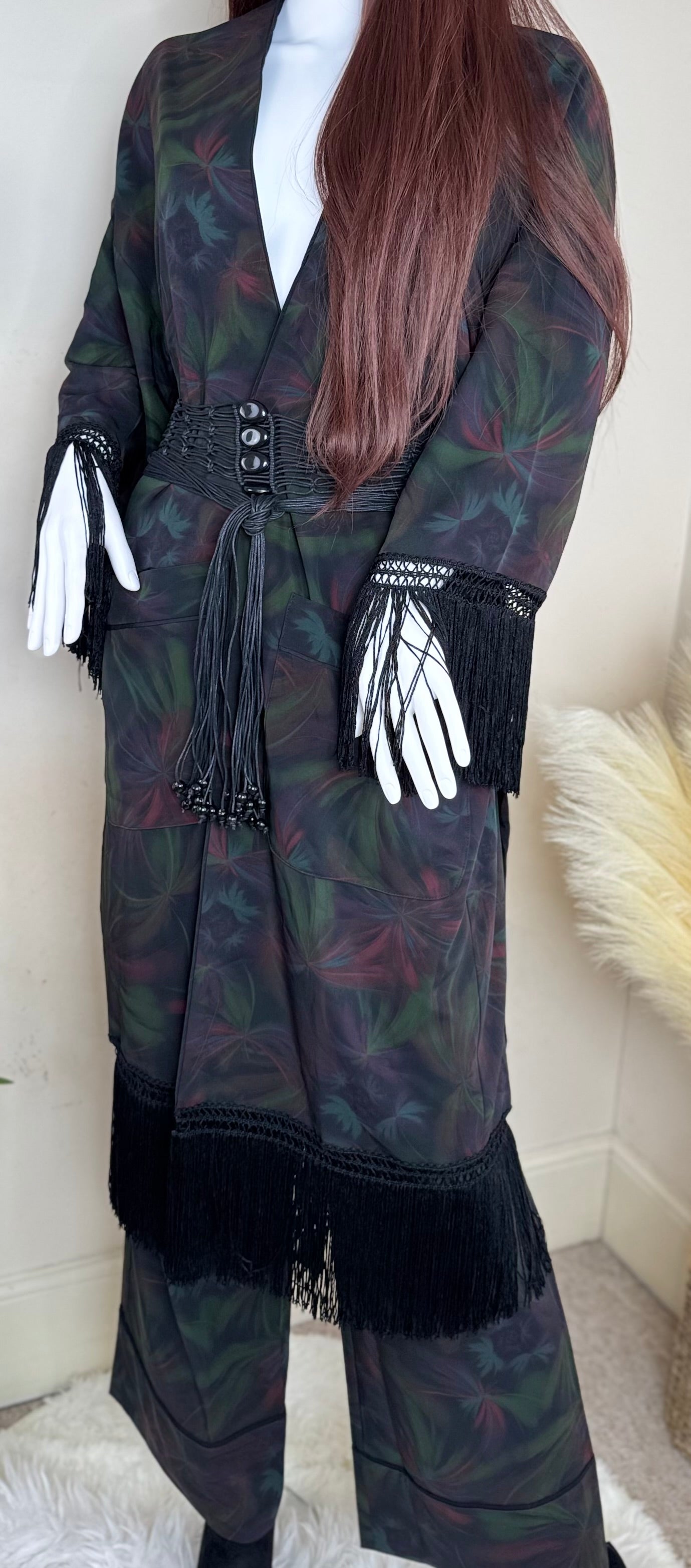 A striking ZARA two-piece set that brings statement elegance to your wardrobe. This co-ord includes wide-leg trousers and a belted kimono jacket with dramatic fringe trim at the sleeves and hem. The subtle dark botanical print adds depth, while the flowing fit makes it perfect for evening wear, special events, or simply making an entrance.