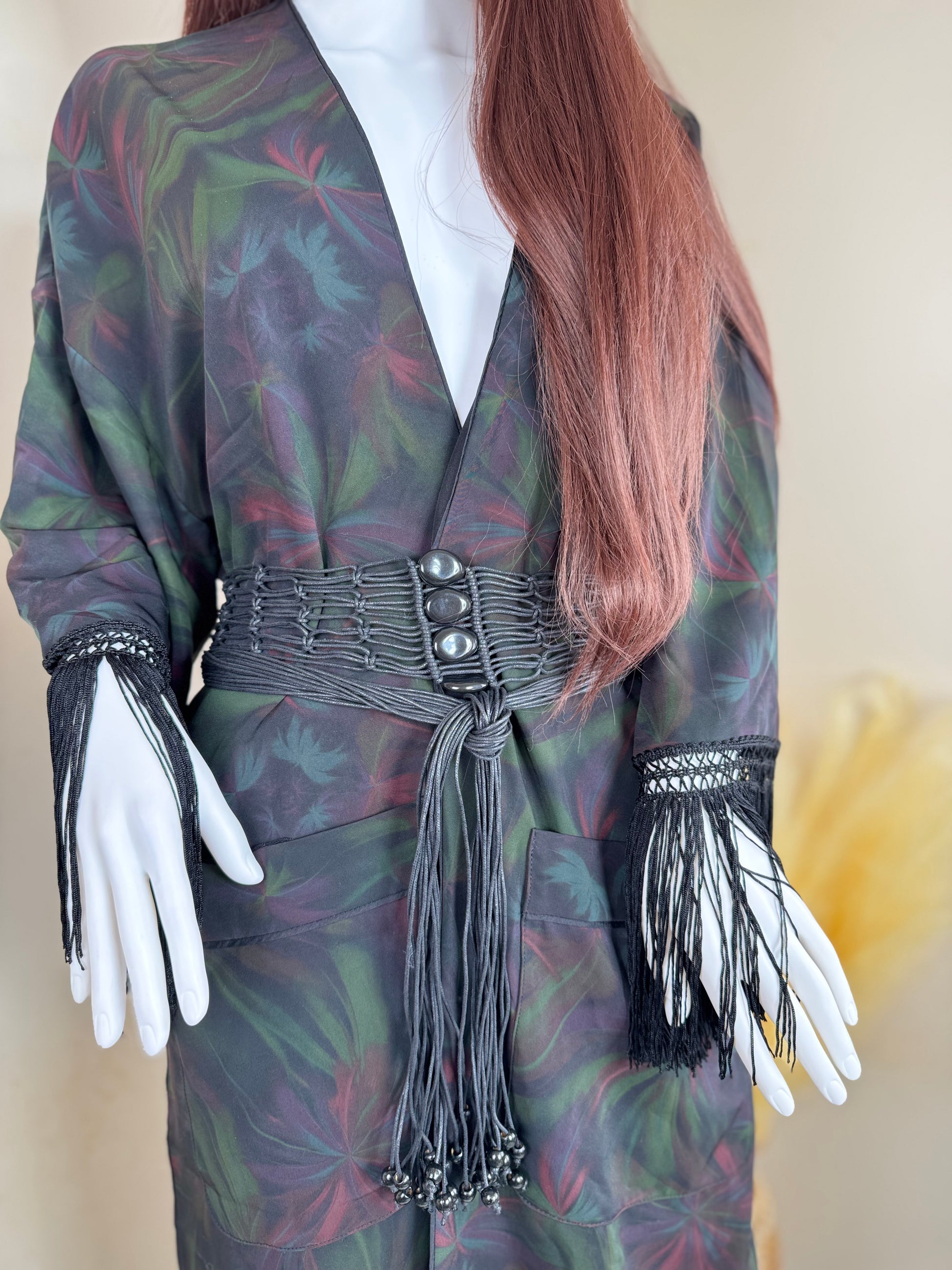- Key features: Kimono-style jacket with belt, long fringe trim, matching wide-leg trousers, lightweight fabric